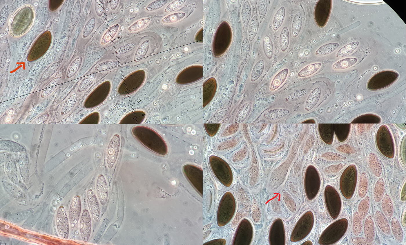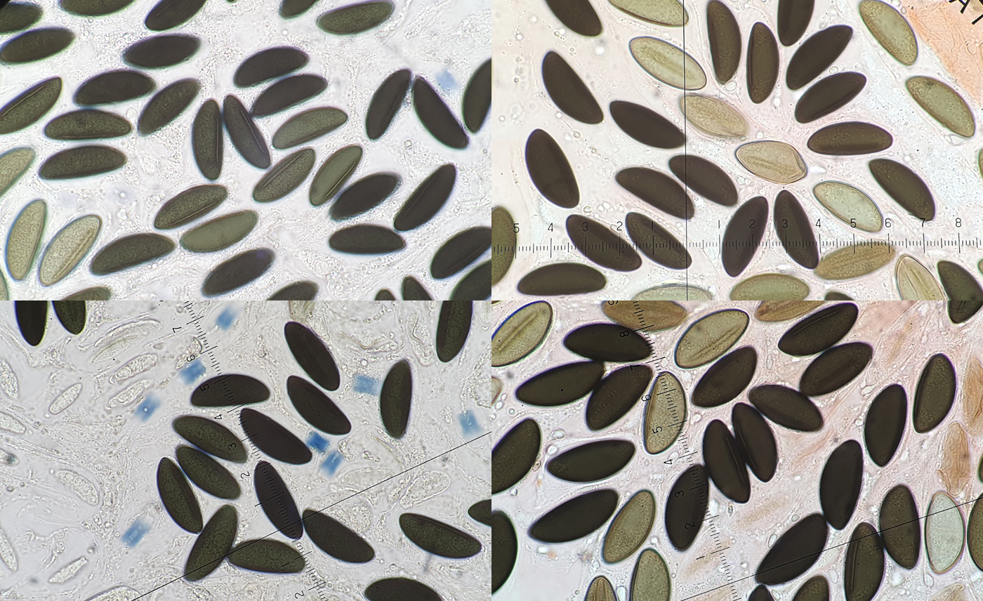Die Asci mit blauenden Apikalapparat in Lugol. Die reifen Sporen dunkelbraun, unregelmässig elliptisch und einseitig abgeflacht, mit einer Schleimhülle umgeben, uniseriat im Ascus.