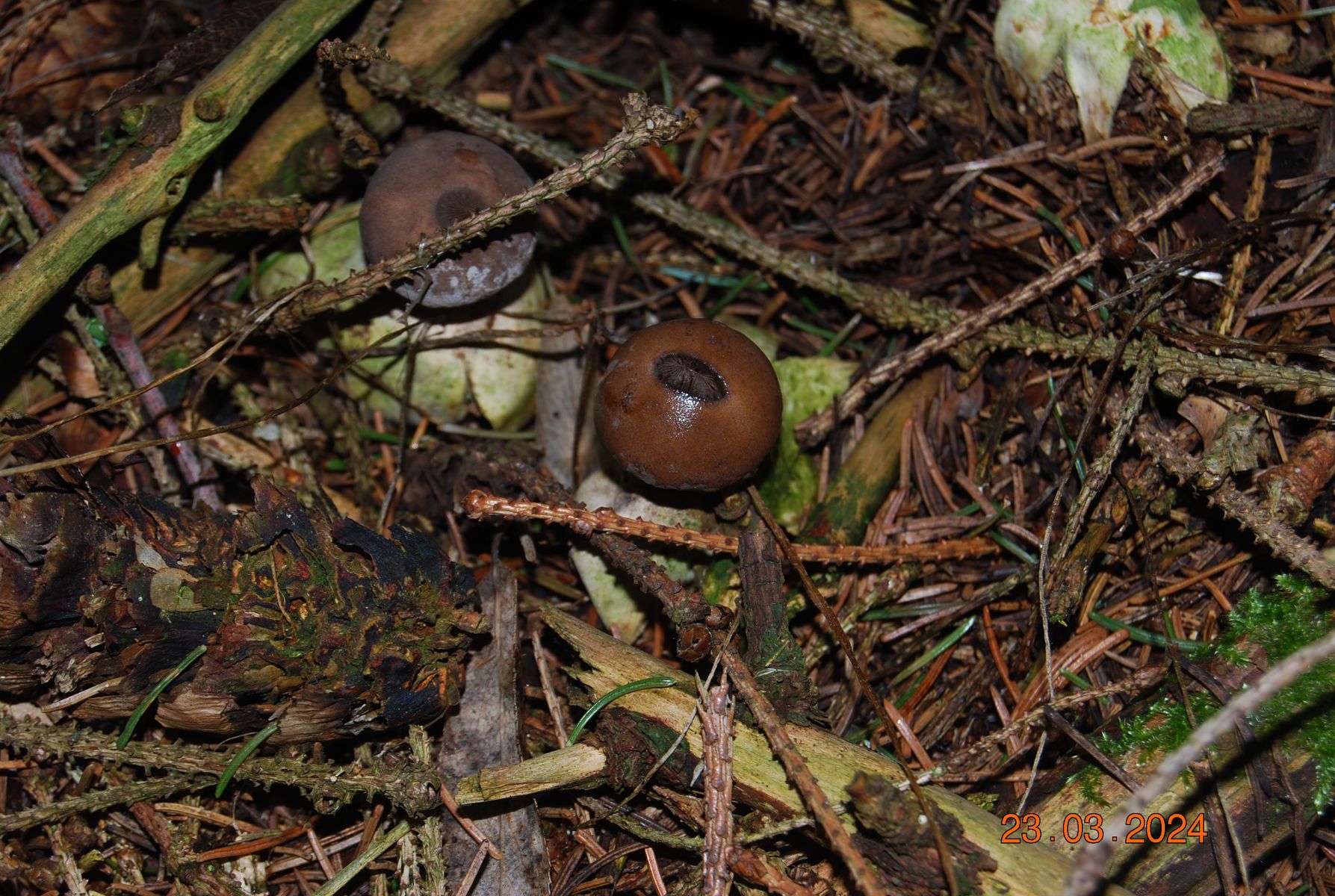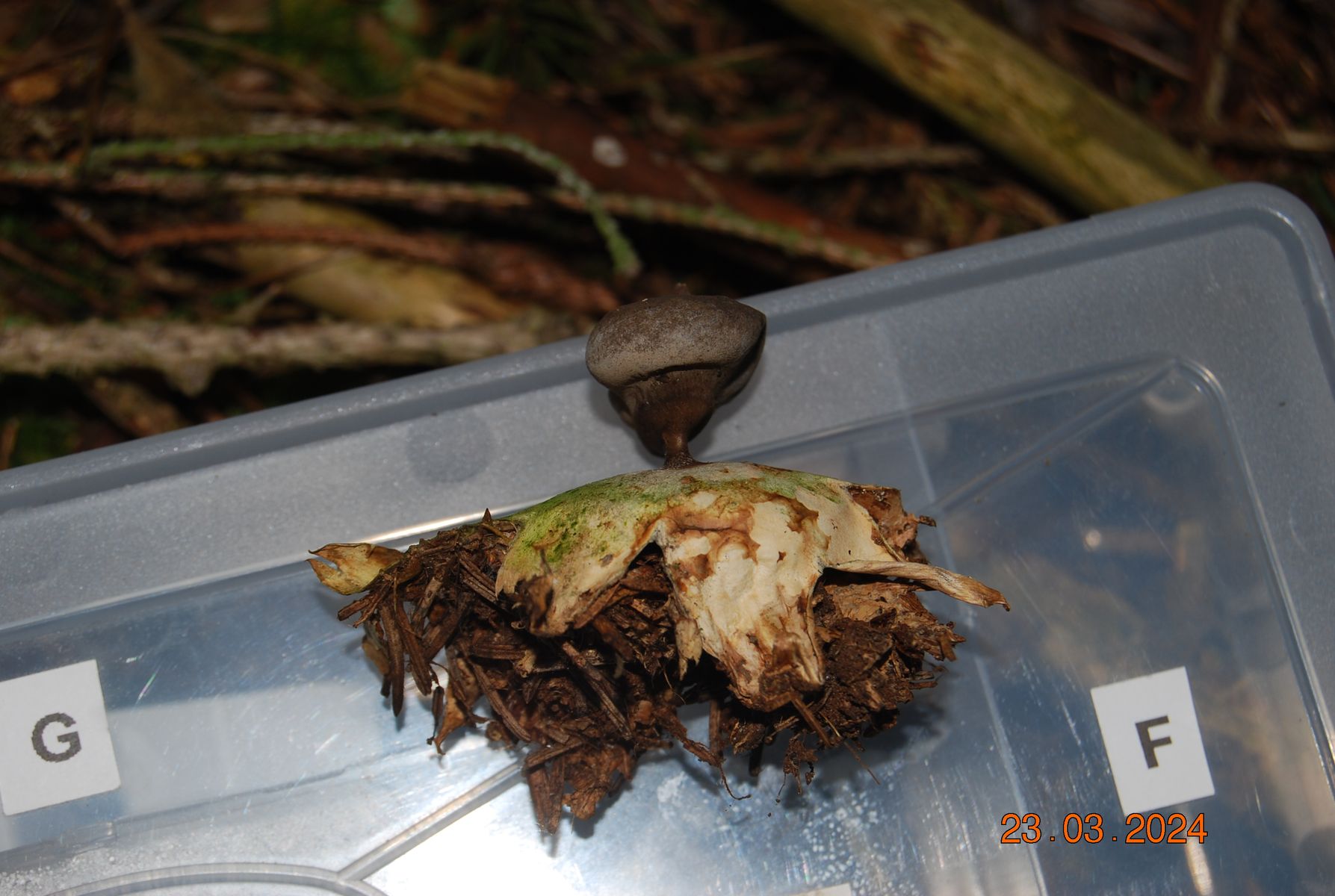 Funde von gestern - ein Grüppchen von rund einem Dutzend, allesamt überständig, im Feld mehr od. weniger exsikkiert. Die größeren Fruchtkörper waren so um die 4 cm hoch (gesamte Exoperidie inkl. Endoperidie) u. die Endoperidien waren so ca. 1,3 cm breit. Die meisten Fk. hatten acht Basisarme/Sternlappen.