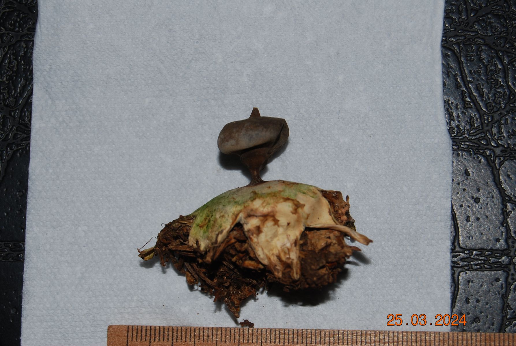 Mit dem Parey war ich im Feld mal für einen ganz kurzen Moment bei Geastrum quadrifidum, aber der dürfte nicht so viele Basisarme/Sternlappen haben. Und lt. FoTE bevorzugt quadrifidum wohl kalkhaltigen Untergrund, den es am Fundort aber nicht gibt. Also abgewählt.
