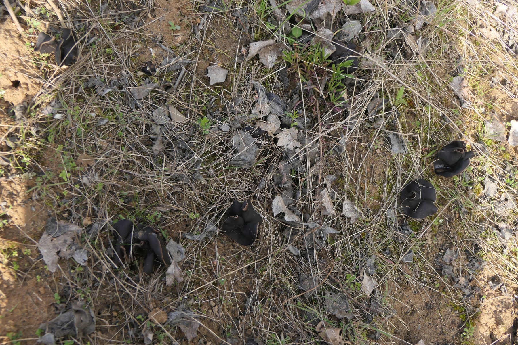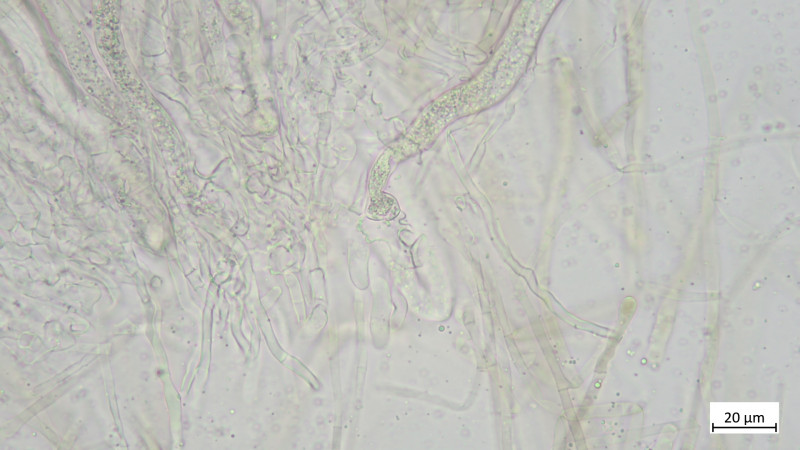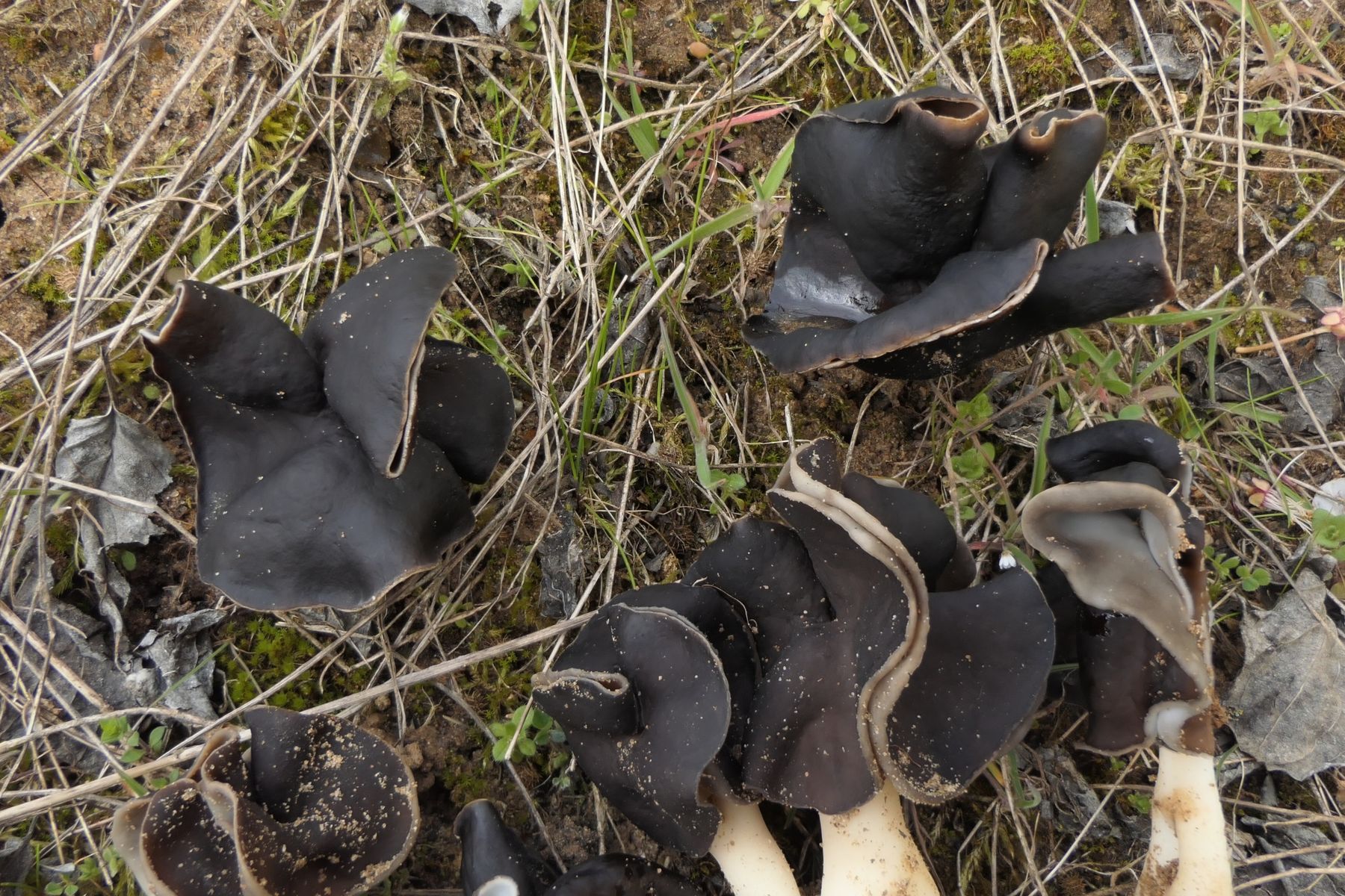 Der Schlüssel führt dann zu H.monachella: 56. Hymenium dark brownish black to black (6-7G-H7-8), cap complex saddle-shaped with irregularly deflexed lobes; stipe robust, hollow, 2–6 cm long, 0.5–2 cm broad. Asco-