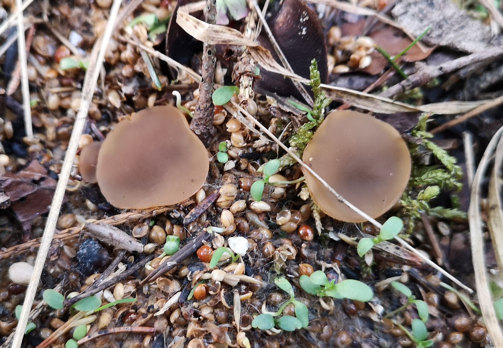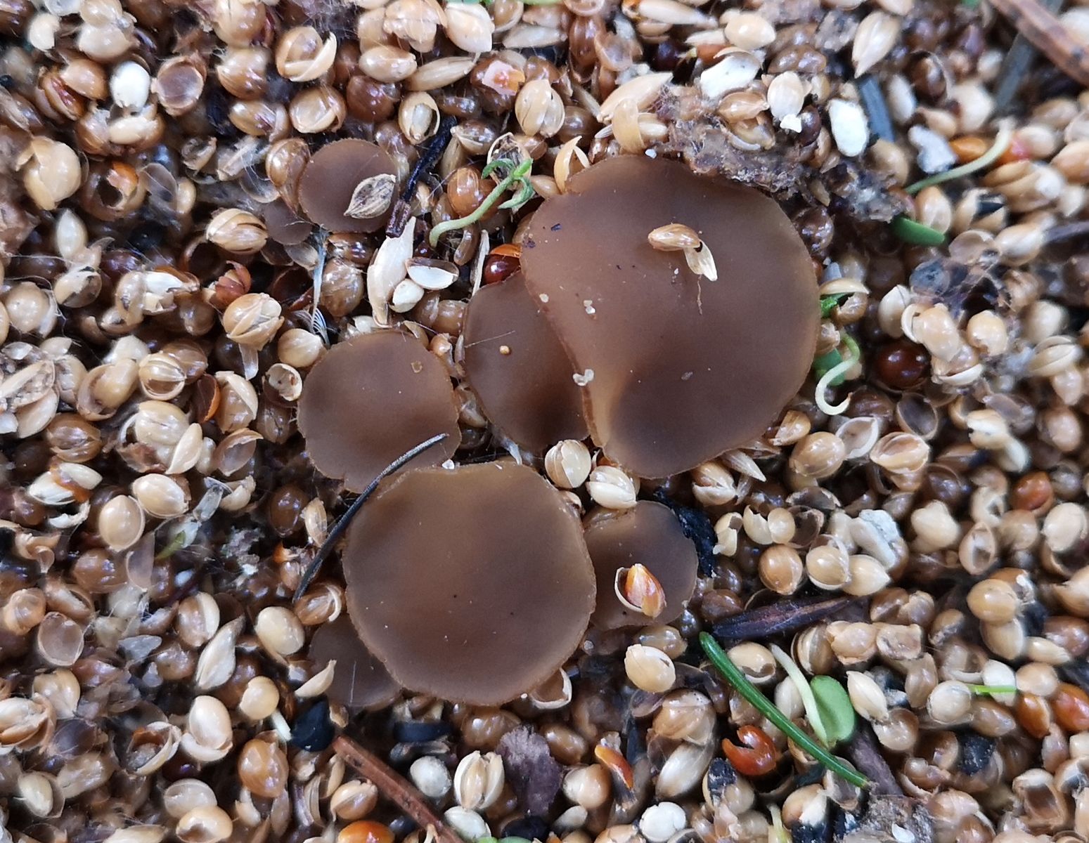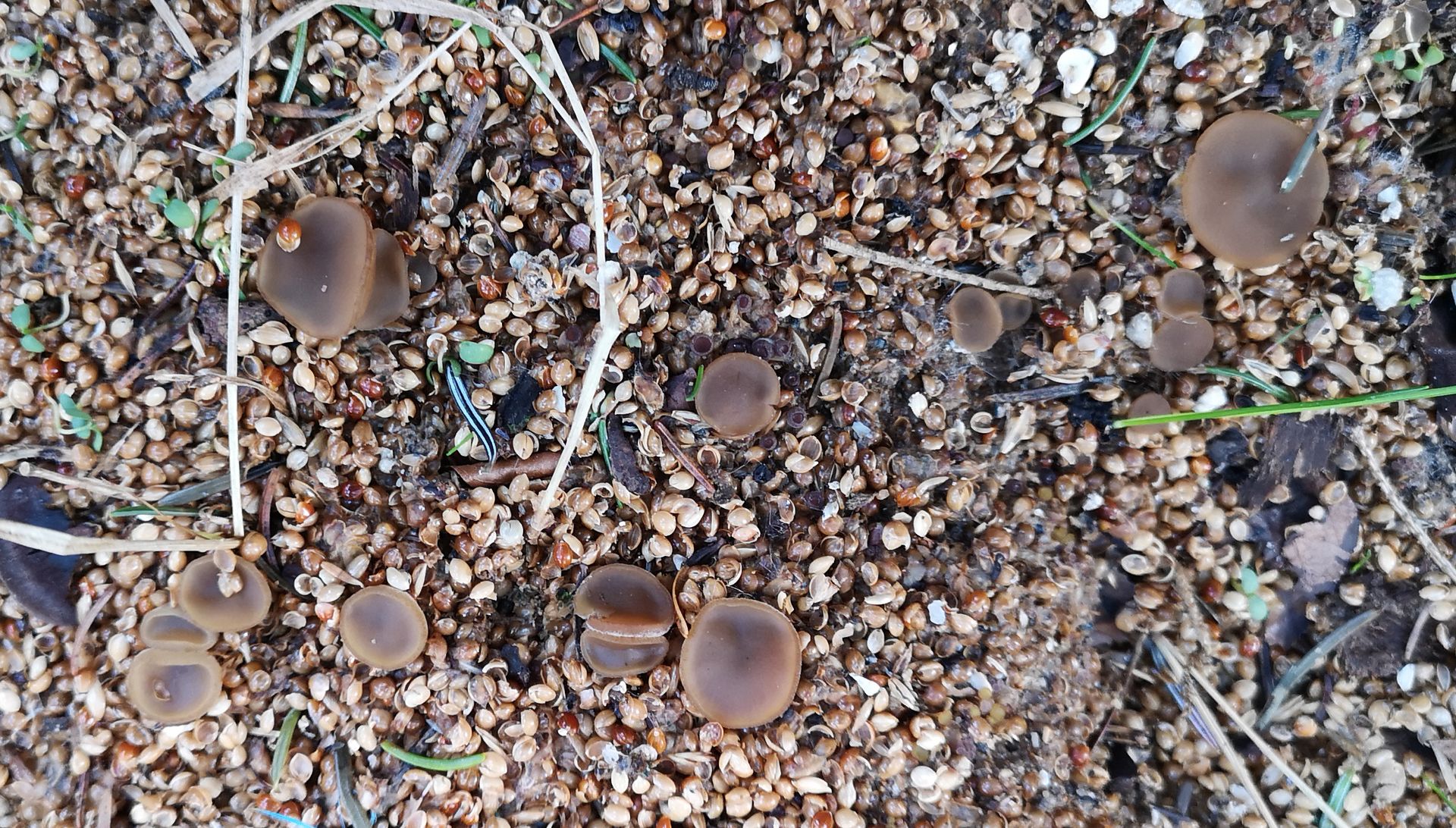 ich habe einen Becherling gefunden, der auf einem großen Fleck Vogelfutter gewachsen ist, soweit ist gesehen habe waren es Hirsekörner.