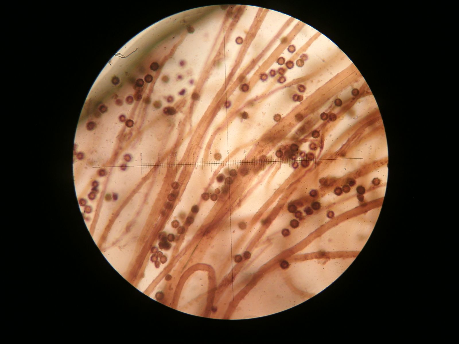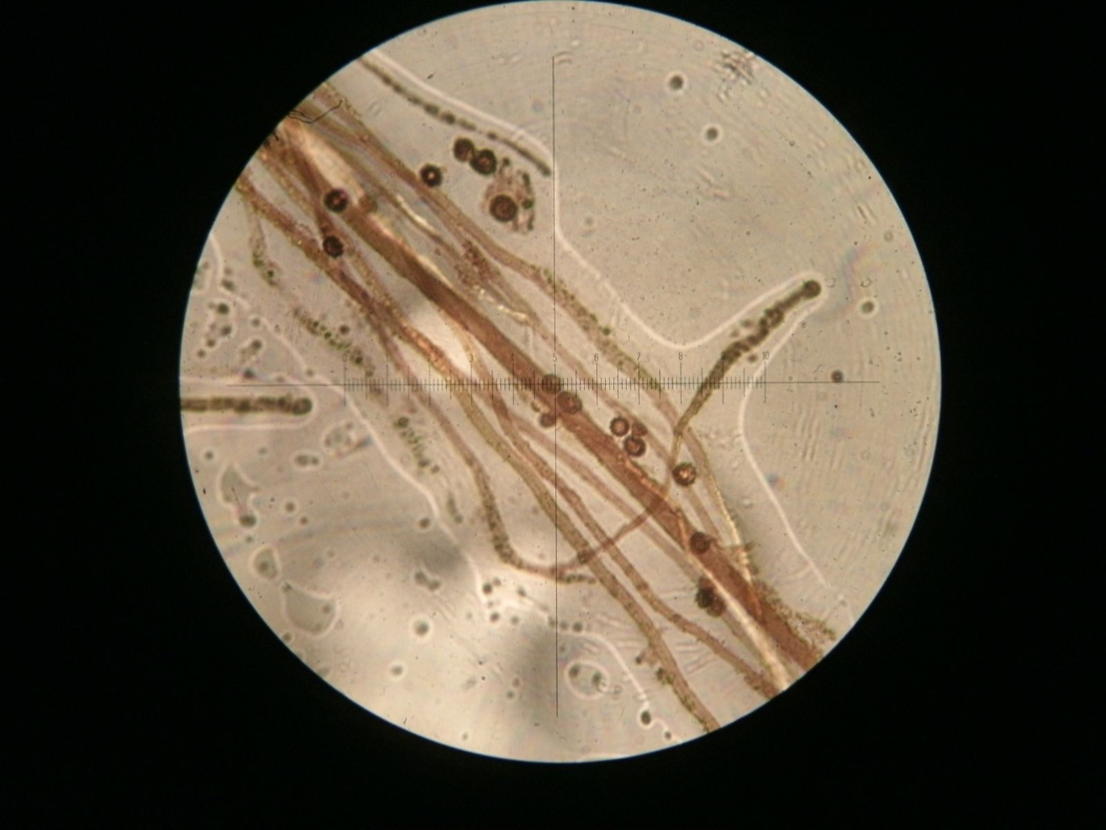 Bei den Hyphen hatte ich den Eindruck, dass sie selbst auch wieder eine Oberflächenstruktur hatten und insgesamt auch etwas längsfasrig aussahen. Ist das so, ist das vielleicht nur Dreck/Erde/halbzerstörte Sporen/was-auch-immer-noch oder irgendwelche Artefakte?