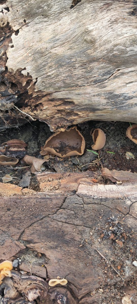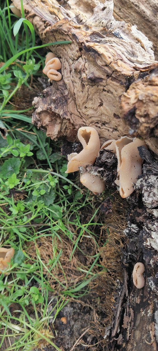 Letztes Jahr hat meine Mutter im Garten ein paar Morchelbecher gefunden, die einen intensiven Chlorgeruch aufwiesen. Da es nur zwei Stück wären, kamen wir nicht dazu ihn zu verarbeiten und meine Mutter hat die Pilze nach meiner Abreise am Fuss eines Apfelbaums abseits des Gartens entsorgt. Heute, ein Jahr später, ist der Apfelbaum komplett zerfallen und wir wollten die Teile wegschaffen. Bei der Inspektion des Baums, bemerkte ich dass unzählige Pilze unter, aber auch auf den Stämmen zu finden waren. Dass es sich um Morchelbecherlinge handelt, kann ich fast ausschließen, weil keinerlei Chlorgeruch festzustellen war und die Becherlinge auch direkt auf dem Totholz zu finden waren. Ein lustiger Zufall ist es trotzdem.