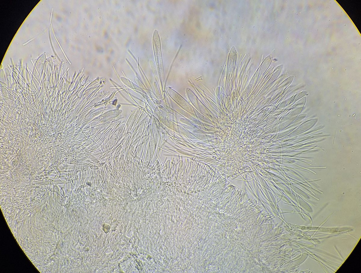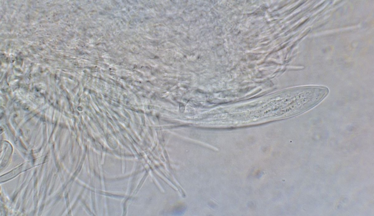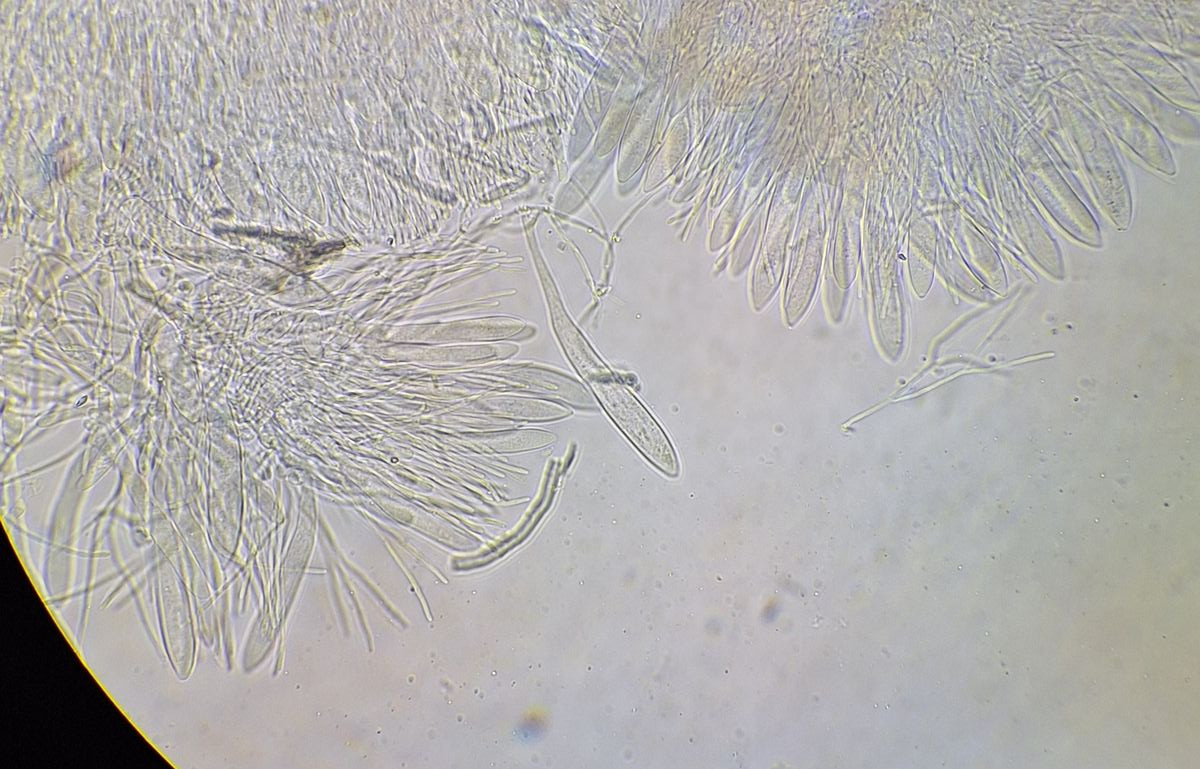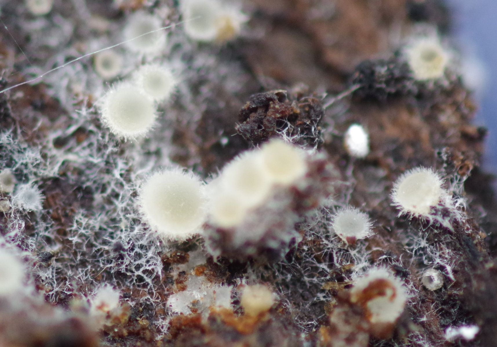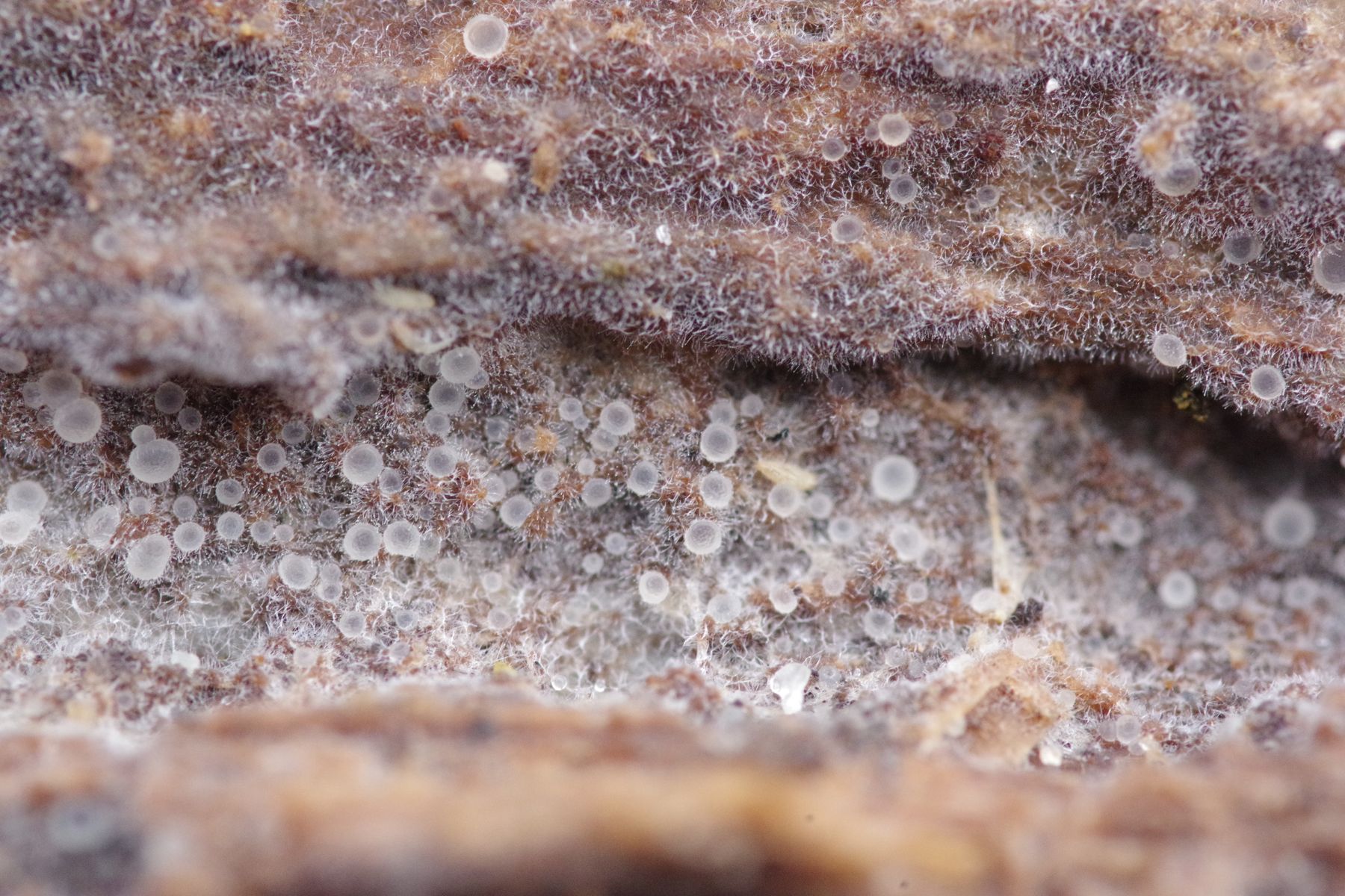 an liegender Eiche, +/- unterseits wächst ein winziger haariger und versponnener weißer Becher. Die Becher sind bis 0,4 mm groß und, wie fast alles was ich an Bechern unterm Glas hatte, unreif. Fand ich sehr schwer zu präparieren ohne gleich morsches Holz mit einzubringen.