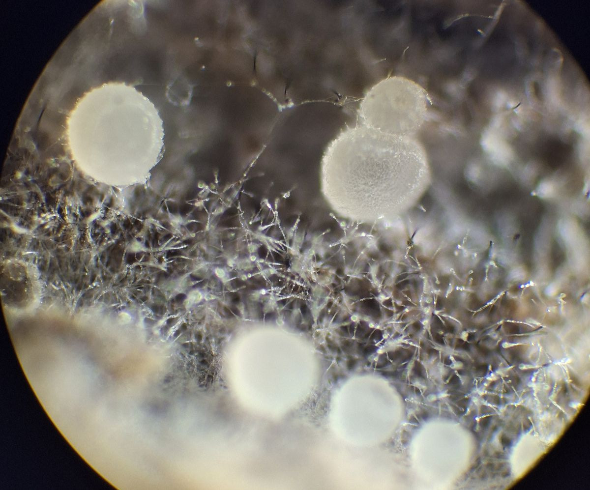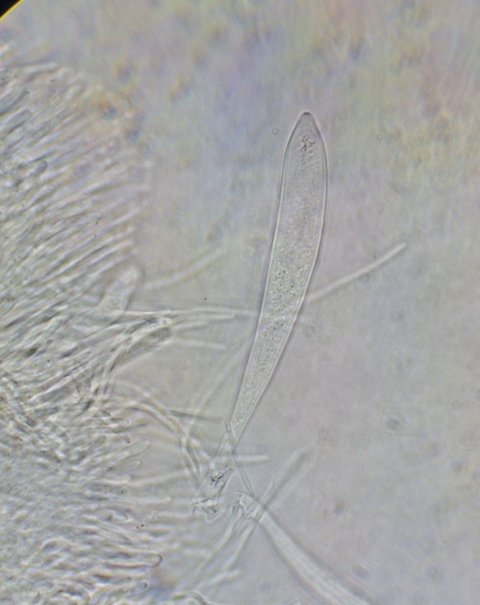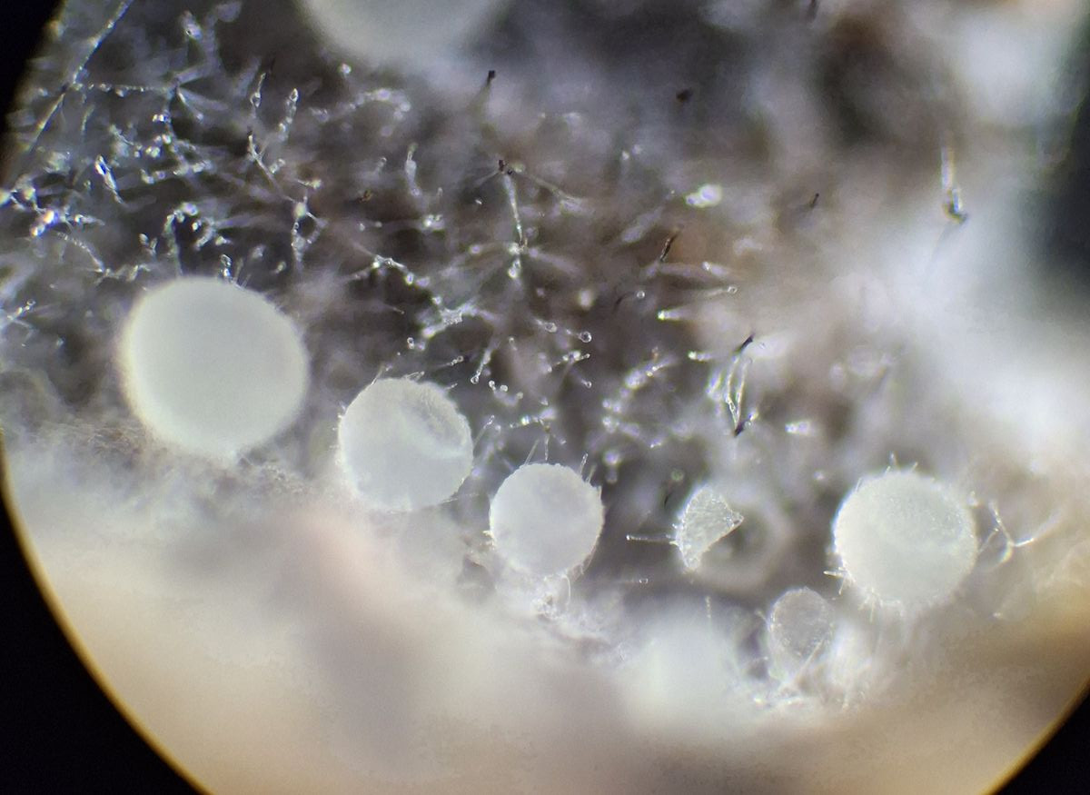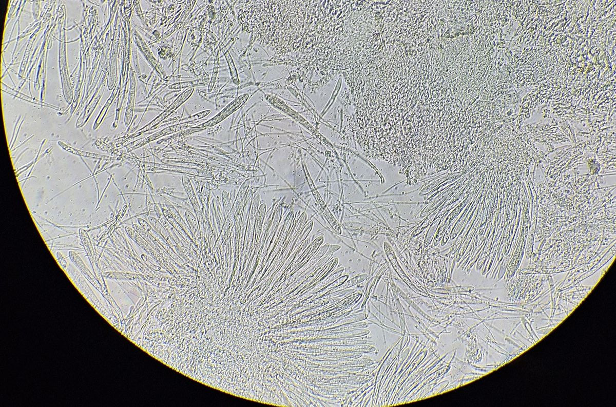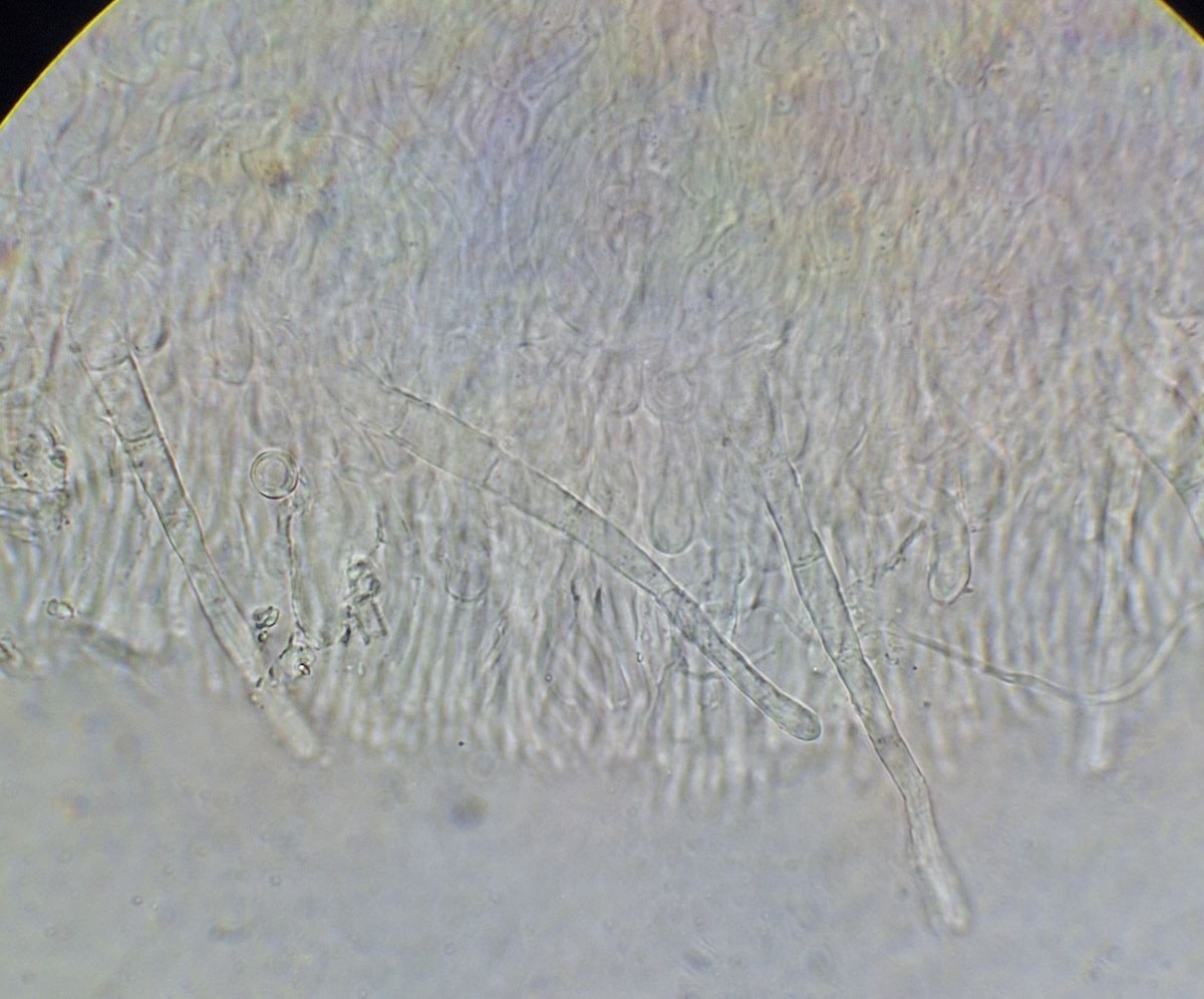 an liegender Eiche, +/- unterseits wächst ein winziger haariger und versponnener weißer Becher. Die Becher sind bis 0,4 mm groß und, wie fast alles was ich an Bechern unterm Glas hatte, unreif. Fand ich sehr schwer zu präparieren ohne gleich morsches Holz mit einzubringen.