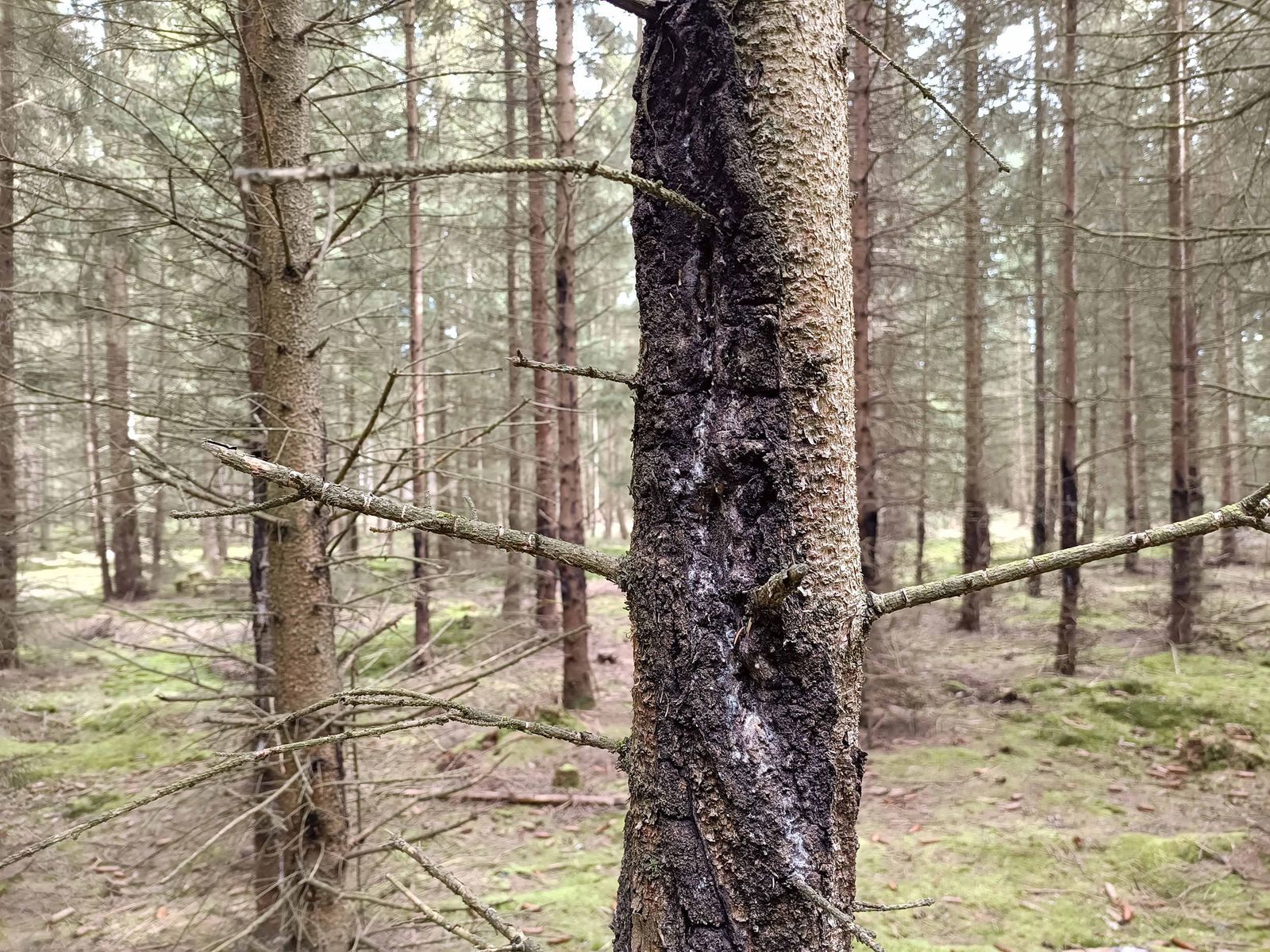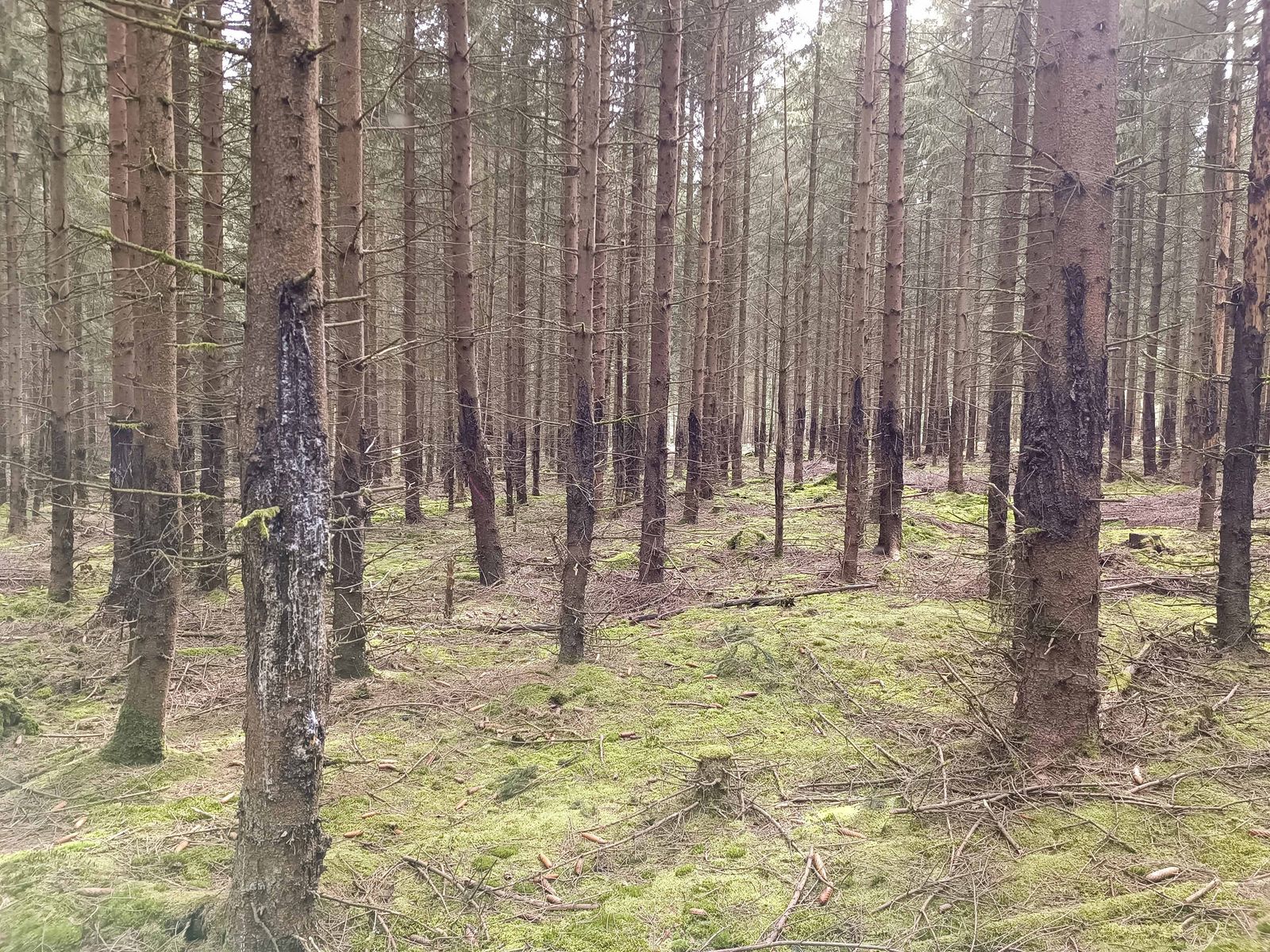 Alle Stämme der Fichten sind in gleicher Höhe schwarz. Alle.