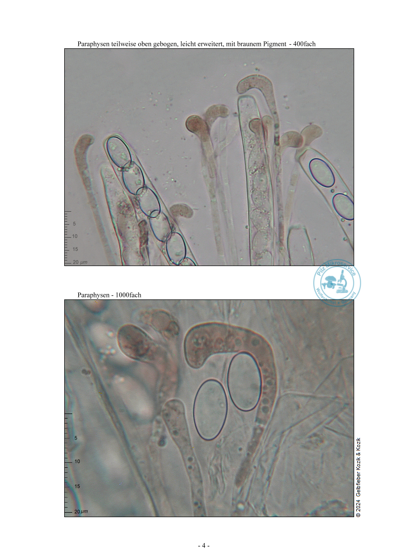 Die braun pigmentierten Paraphysen sind oben leicht erweitert und gebogen.