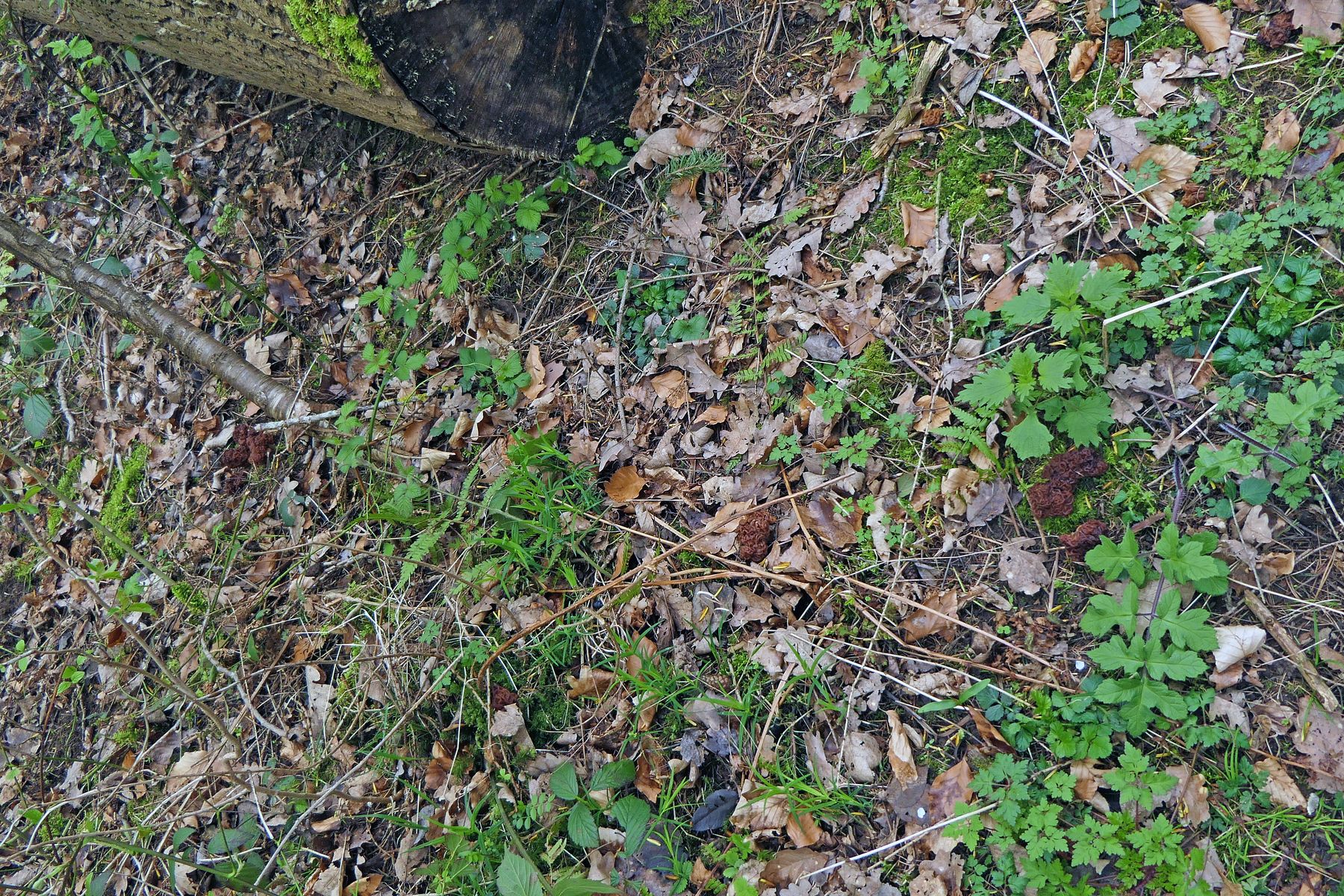 Dann kam ich gestern noch an einem Waldstück vorbei, als ich meine Morchelstellen besuchen wollte. An den bekannten Morchelstellen war aber noch tote Hose. Interessant war aber ein Buchen- und Eichenstreifen, der einen sehr guten Eindruck machte. Ich dachte, ich könnte doch mal schauen, ob ich die Arachnopeziza aurelia auch hier (also einem einem dritten Standort) finden kann. Siehe hier: Arachnopeziza, die Zweite ...