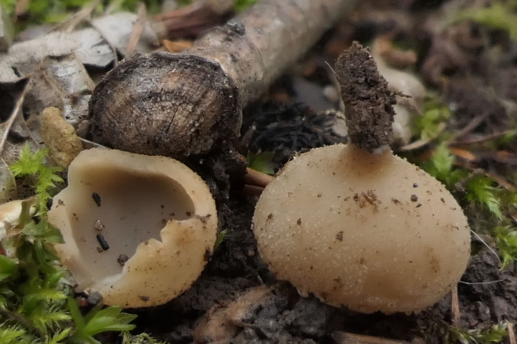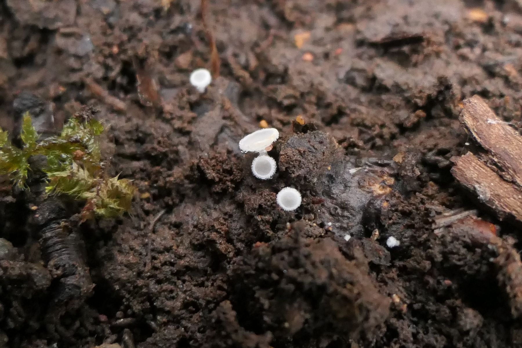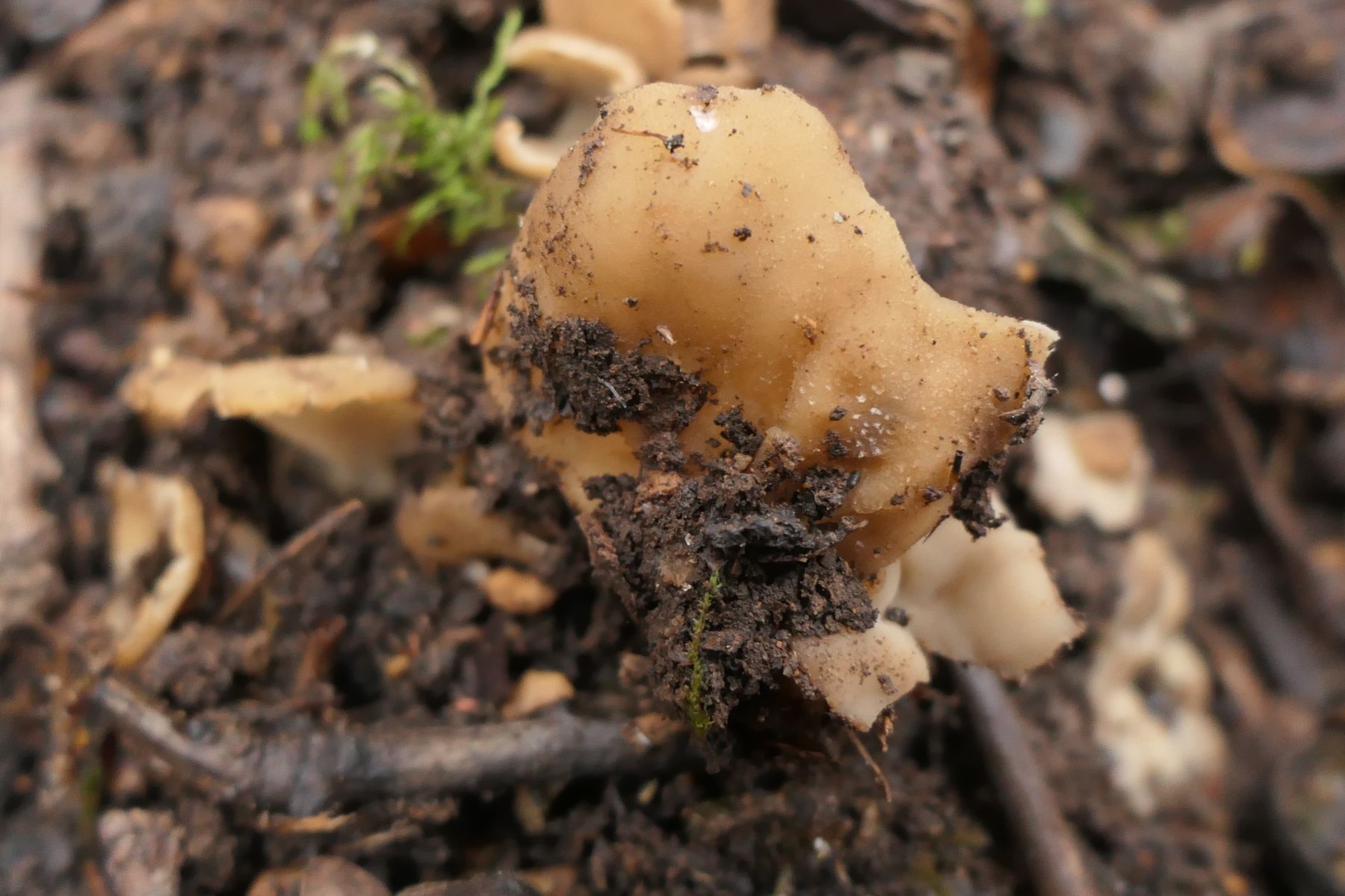 Dann noch ein großerer Becher, bei dem ich ehrlich gesagt erstmal wegen der Größe (größter Fruchtkörper bis etwa 4cm) und dem geselligen, sessilen Auftreten auf einem Erdklumpen an Peziza dachte. Aber Pustekuchen. Das passte gar nicht.