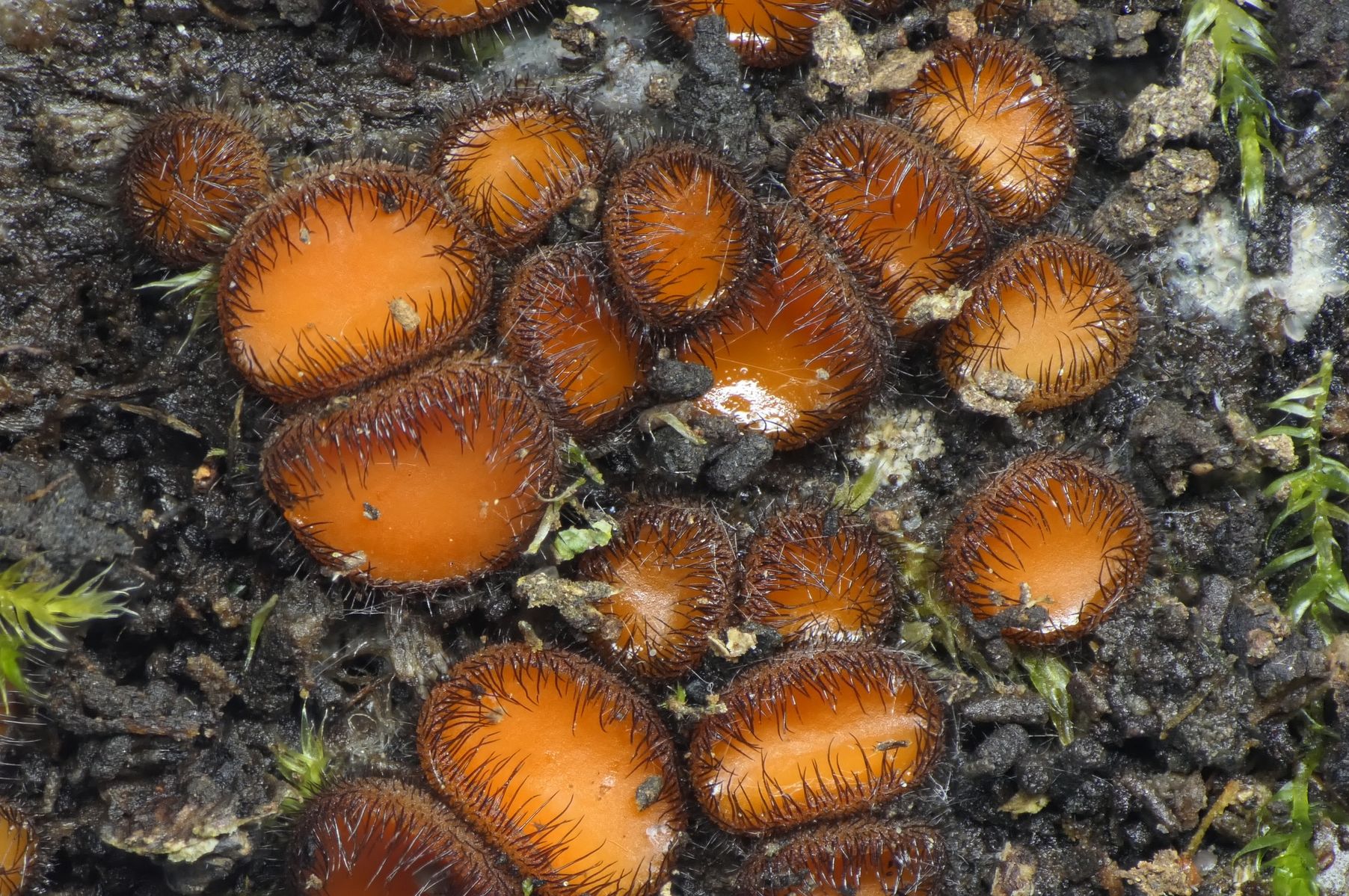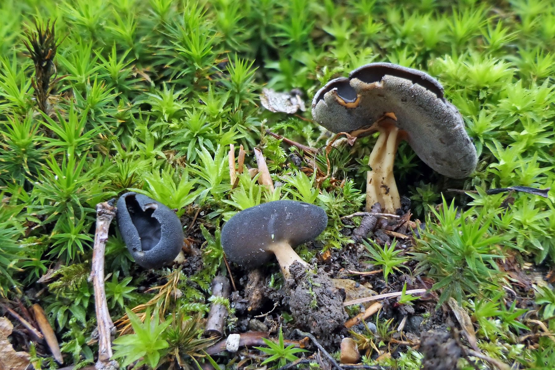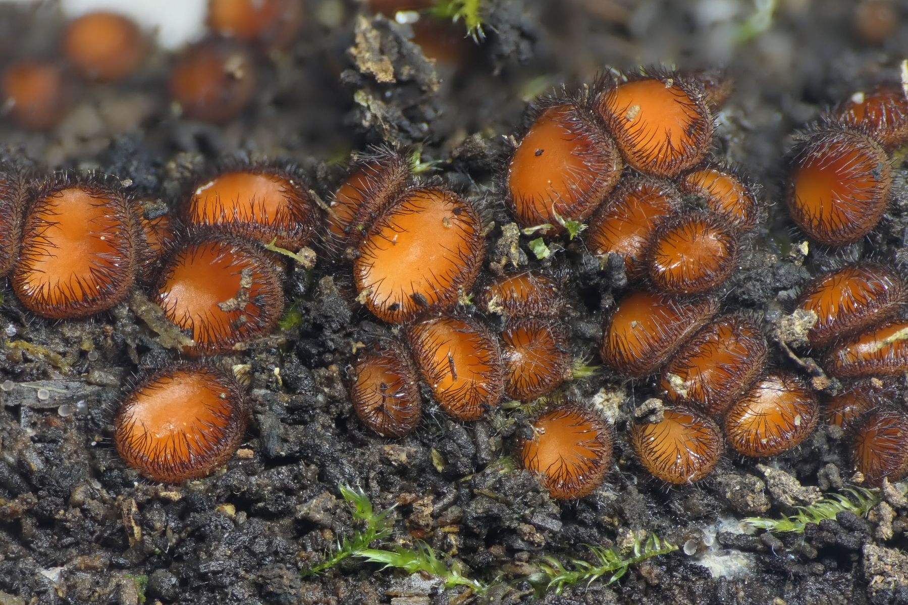Dann noch ein großerer Becher, bei dem ich ehrlich gesagt erstmal wegen der Größe (größter Fruchtkörper bis etwa 4cm) und dem geselligen, sessilen Auftreten auf einem Erdklumpen an Peziza dachte. Aber Pustekuchen. Das passte gar nicht.