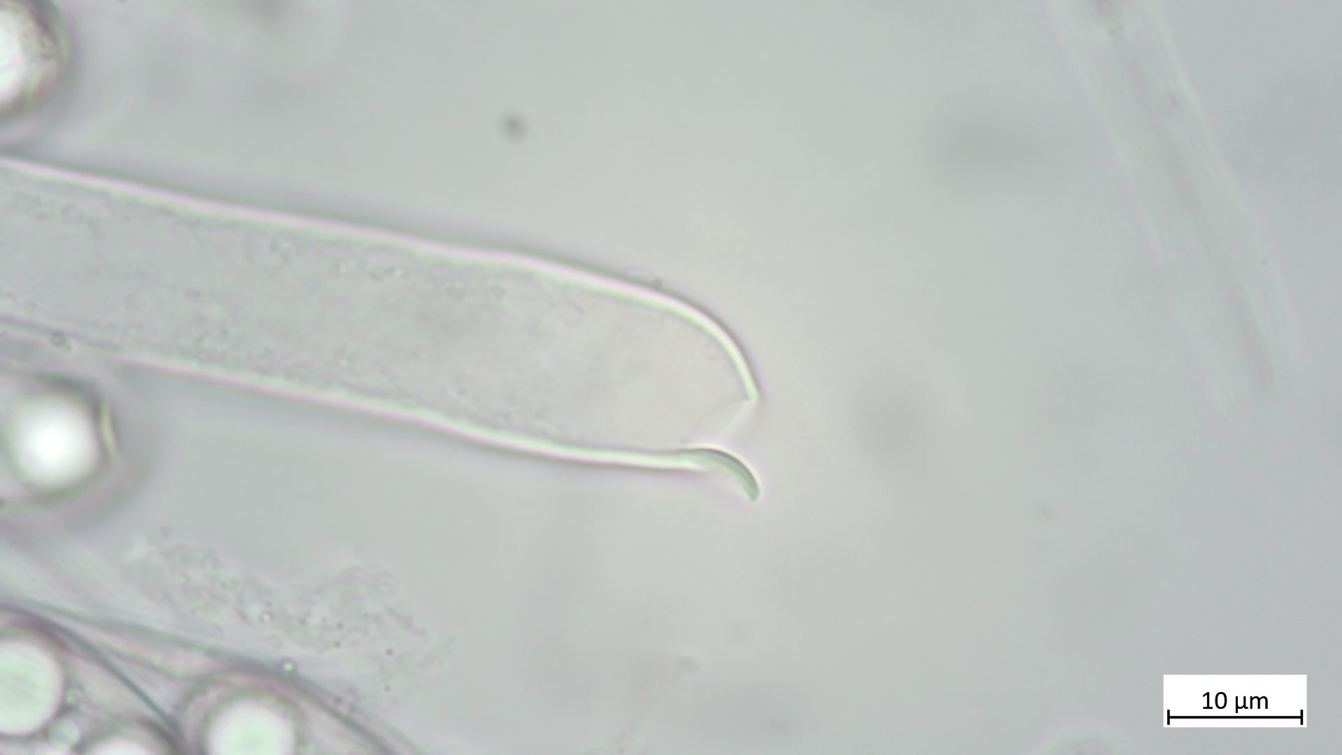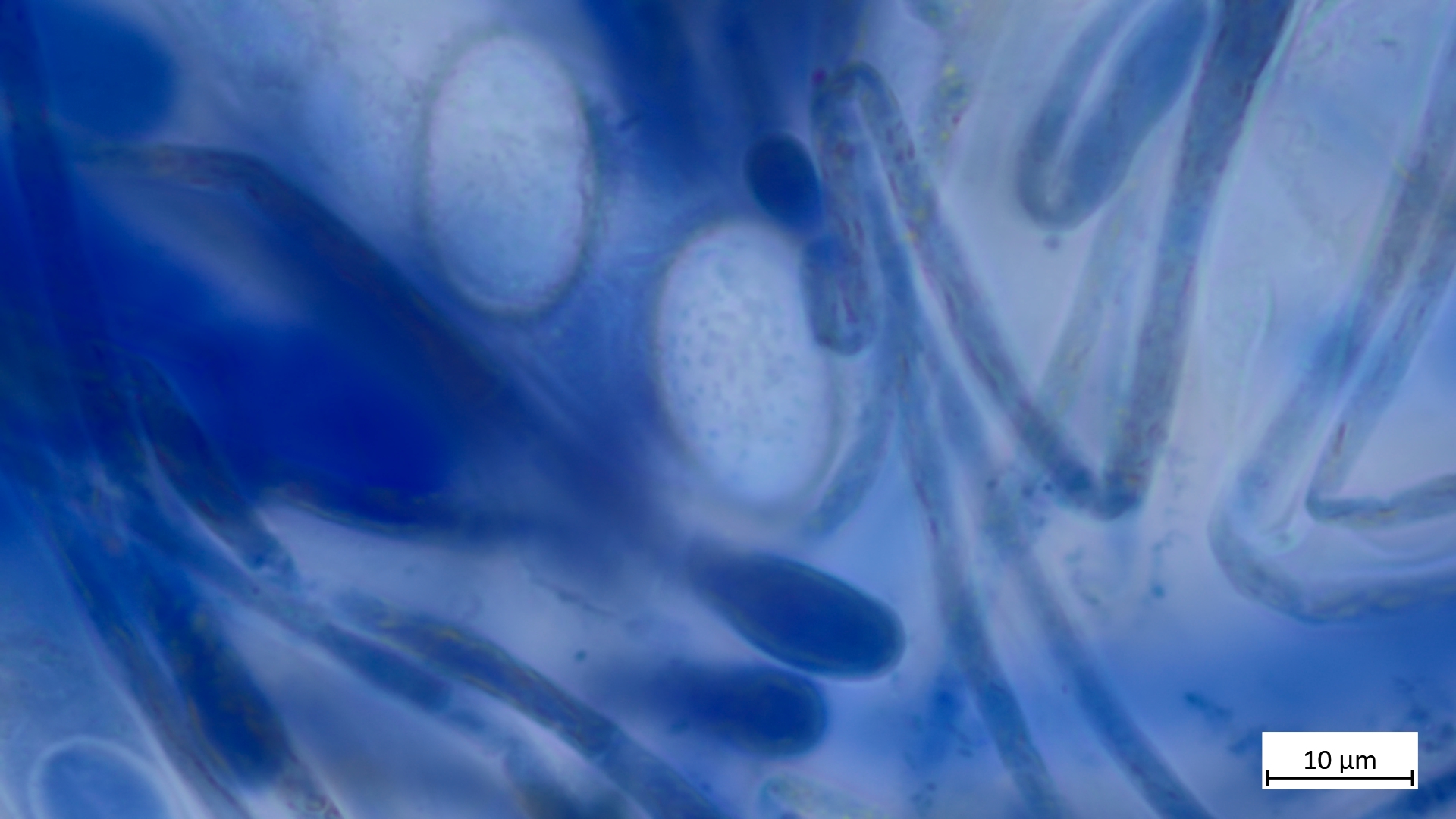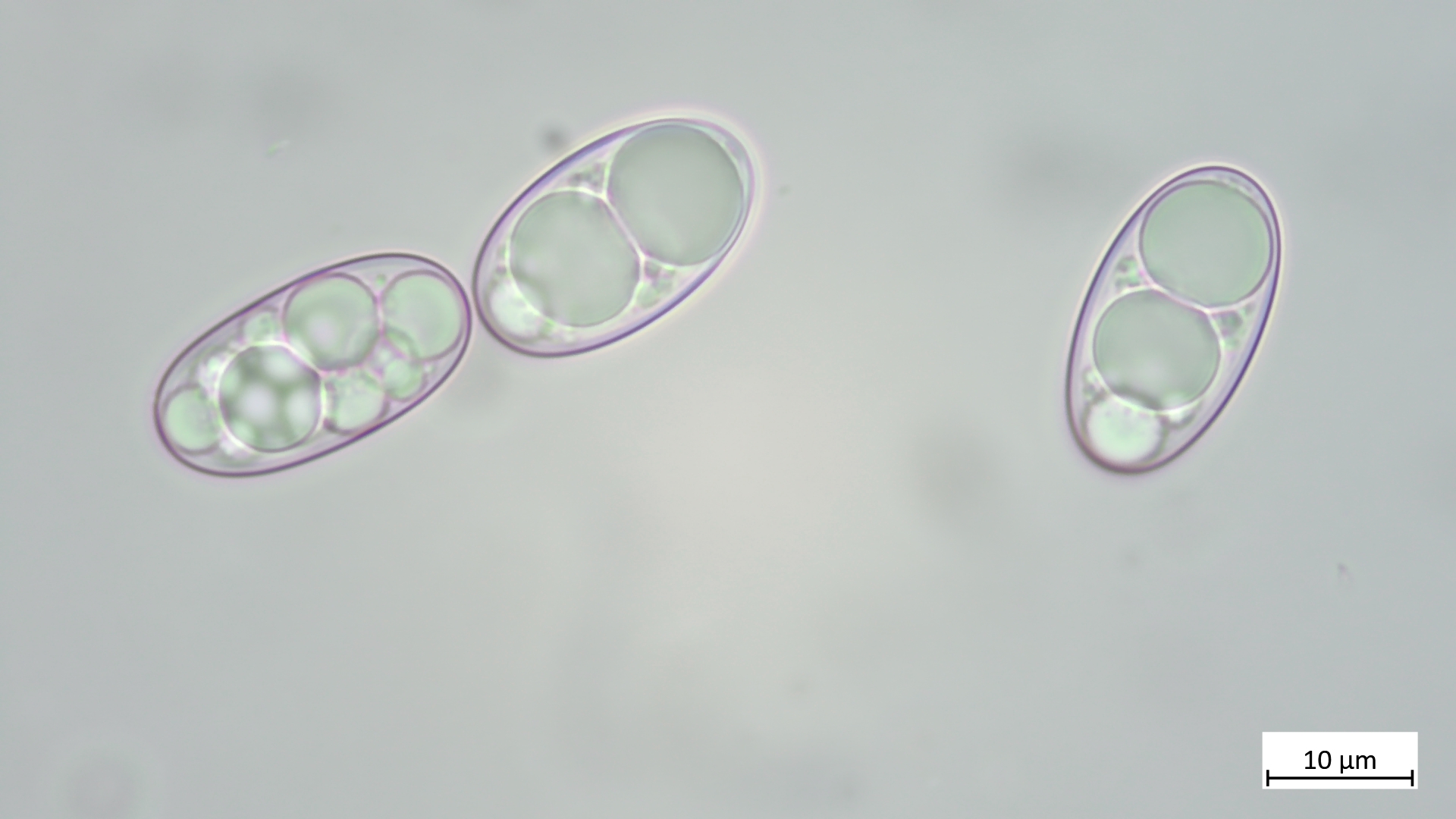 Sporen glatt, ellipsoid mit zwei großen Öltropfen und kleineren Öltropfen drumherum, 20,9-22,3 µm (av. 21,3 µm, SD 0,6 µm) x 12,1-13,0 µm (av. 12,5 µm, SD 0,3 µm); Q = 1,6-1,8 (av. 1,7, SD 0,1)(n = 4)