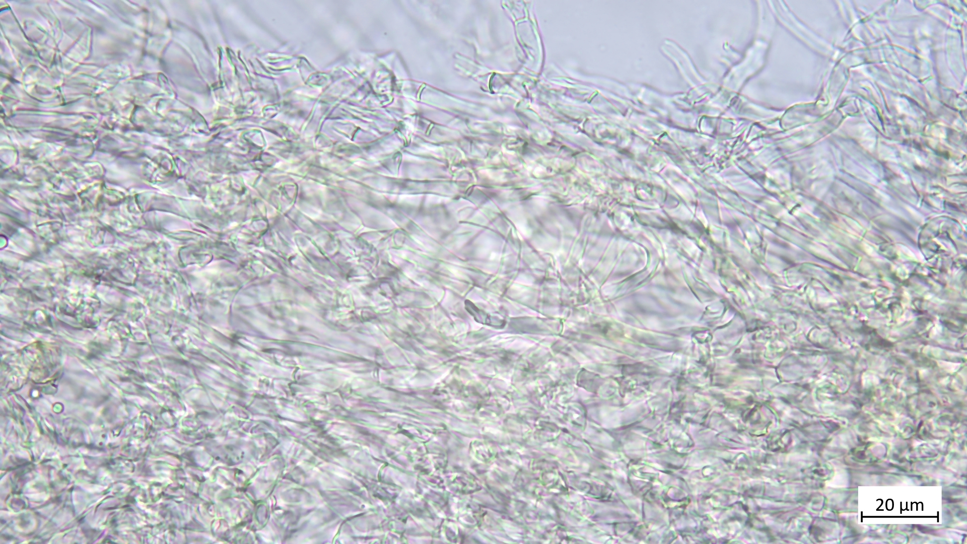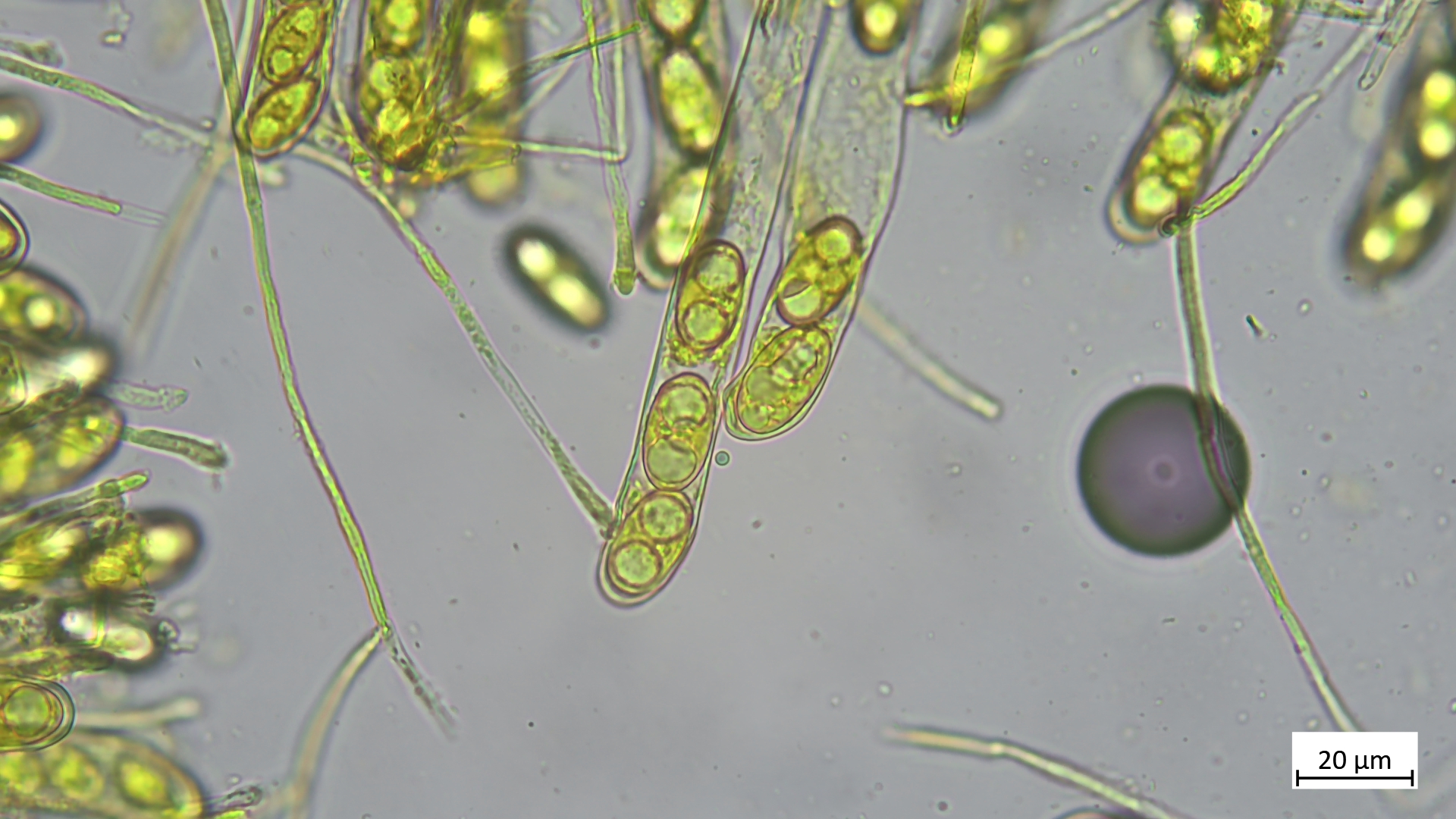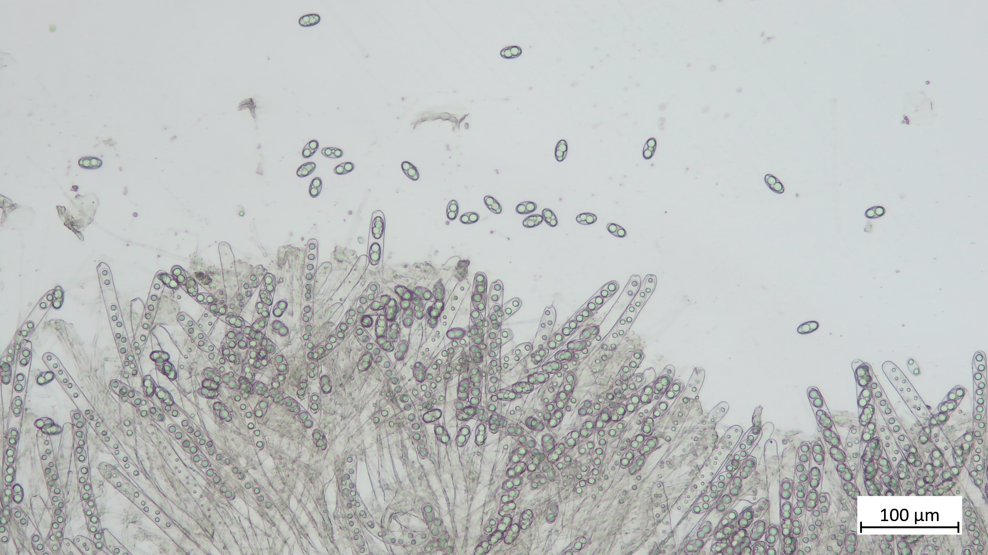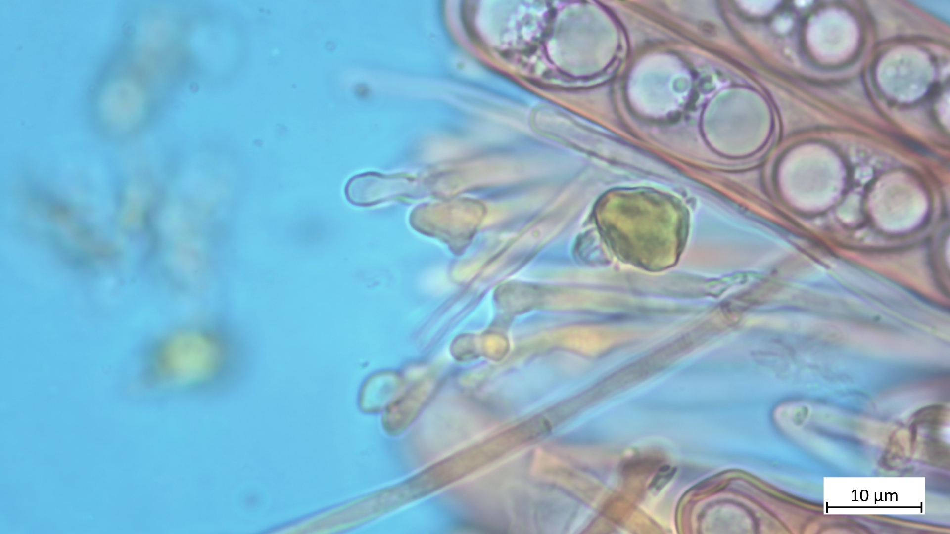 Nach mikroskopieren stand die Sache fest: Inamyloide Asci, große Sporen mit zwei Öltropfen, divertikulate Paraphysen, ektales Excipulum mit angulärer und medulläres Excipulum mit einer intricaten Textur brachte mich zusammen mit den Makromerkmalen zu einem weiteren Erstfund für mich: