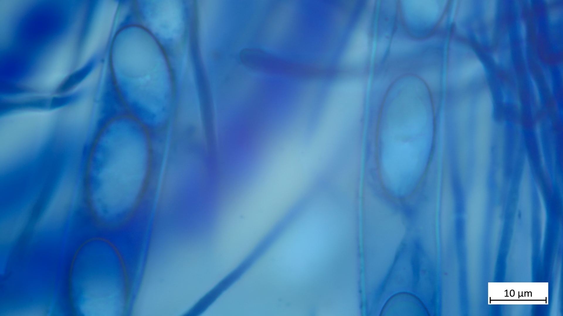 Nach mikroskopieren stand die Sache fest: Inamyloide Asci, große Sporen mit zwei Öltropfen, divertikulate Paraphysen, ektales Excipulum mit angulärer und medulläres Excipulum mit einer intricaten Textur brachte mich zusammen mit den Makromerkmalen zu einem weiteren Erstfund für mich:
