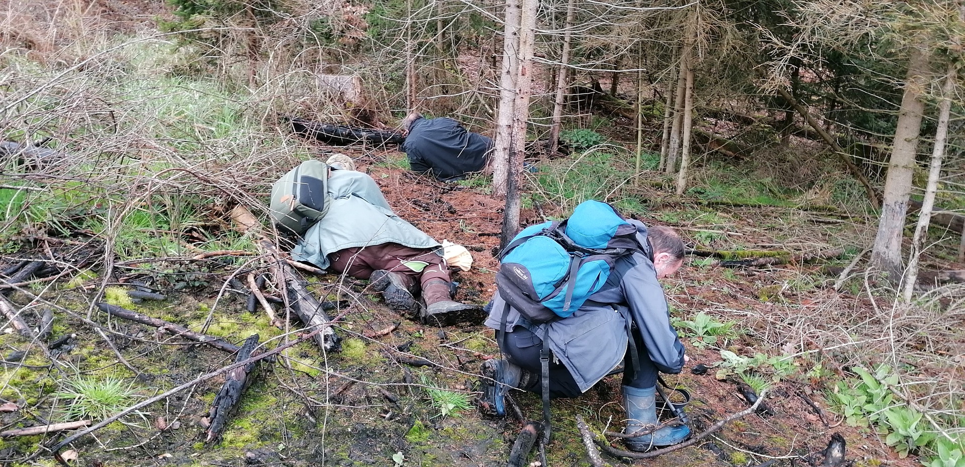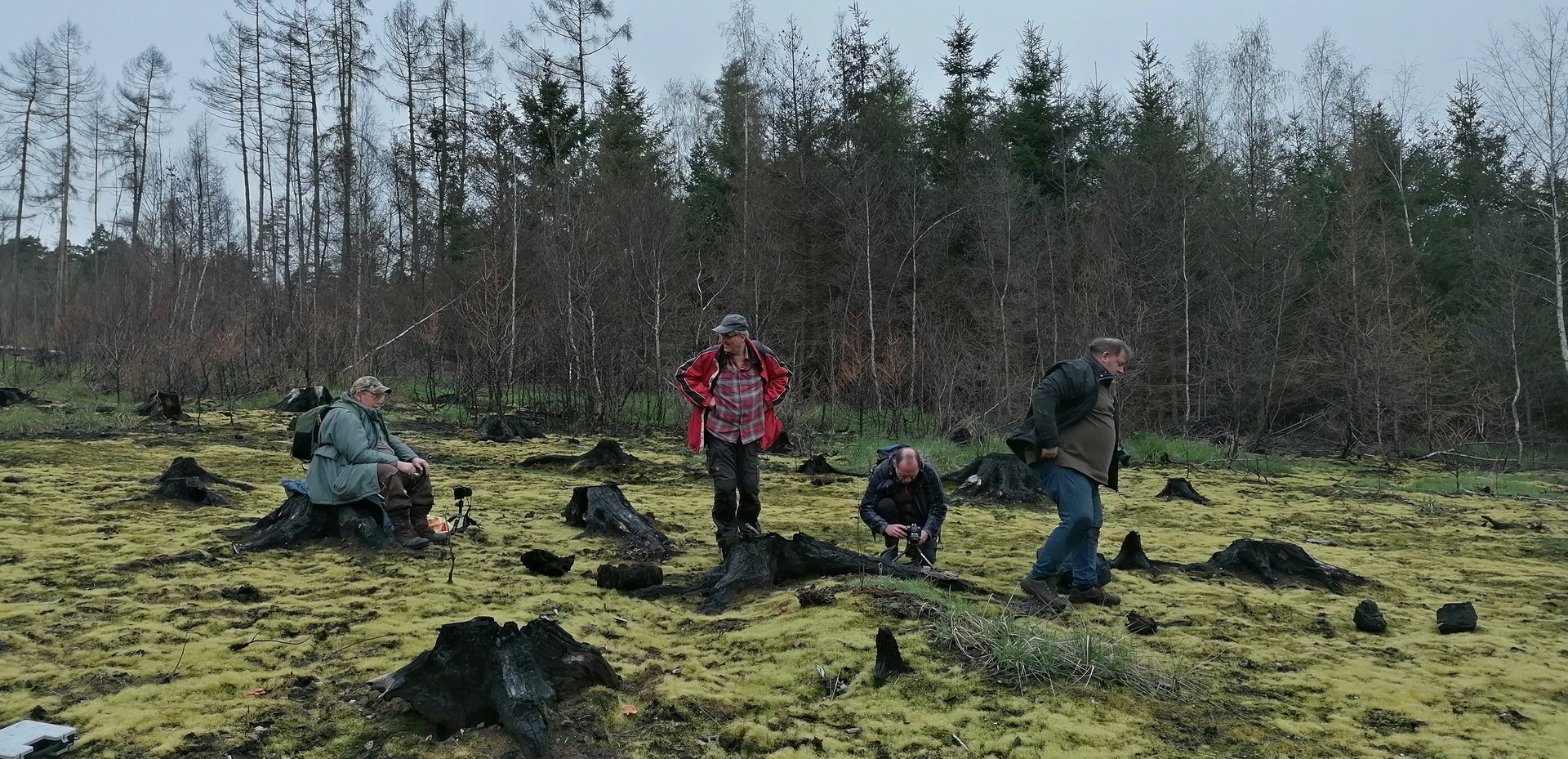 Am Samstag war ich noch einmal auf der Brandstelle, Karl hatte mich zu einer gemeinsamen Exkursion eingeladen. Mit von der Partie waren außerdem noch RaDa und Rainer Wald, meine drei persönlichen Erstfunde waren mir also schon einmal gewiss. Hier im typischen Mykologengang bzw. Mykologen-Foto-Haltung Karl W Rada