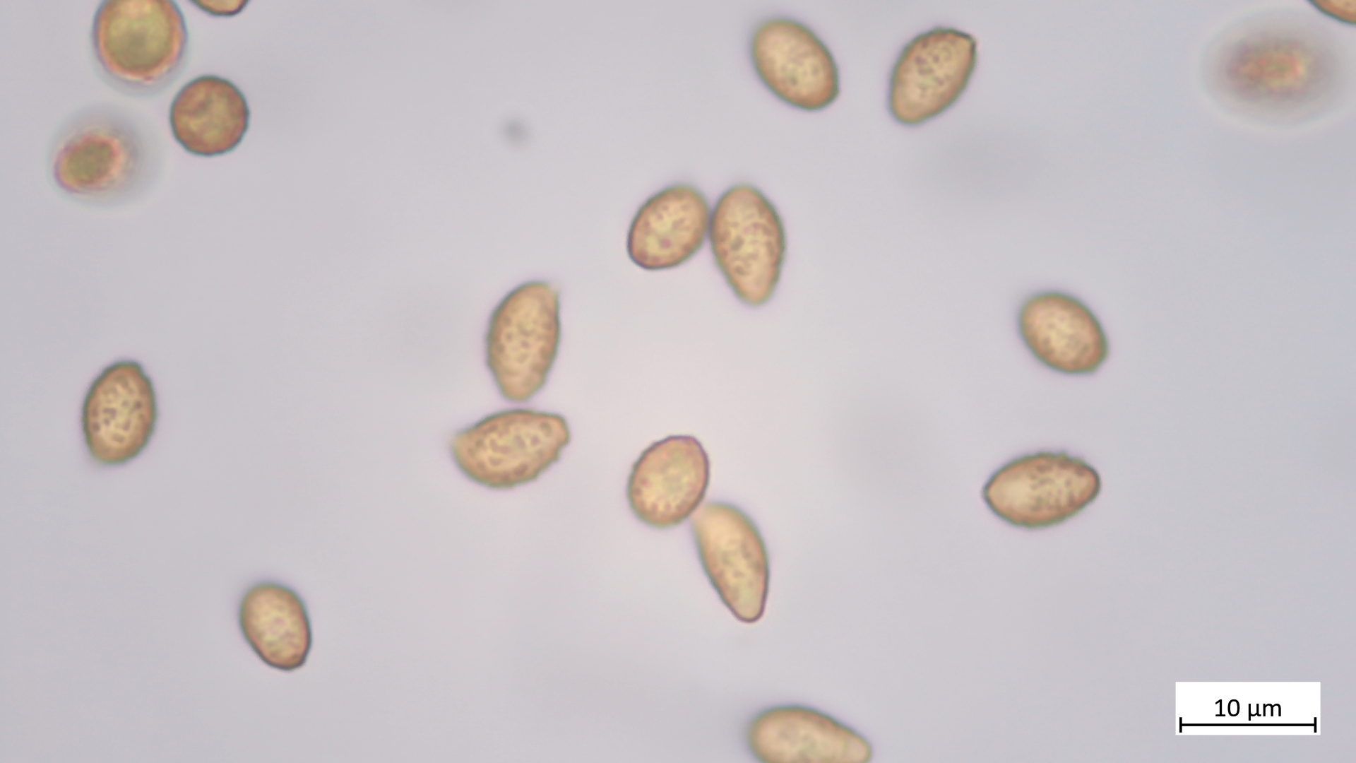 Ornament kräftig und deutlich: 8,4-10,3 µm (av. 9,2 µm, SD 0,5 µm) x 4,8-5,5 µm (av. 5,2 µm, SD 0,2 µm); Q = 1,6-1,9 (av. 1,8, SD 0,1)(n = 15)