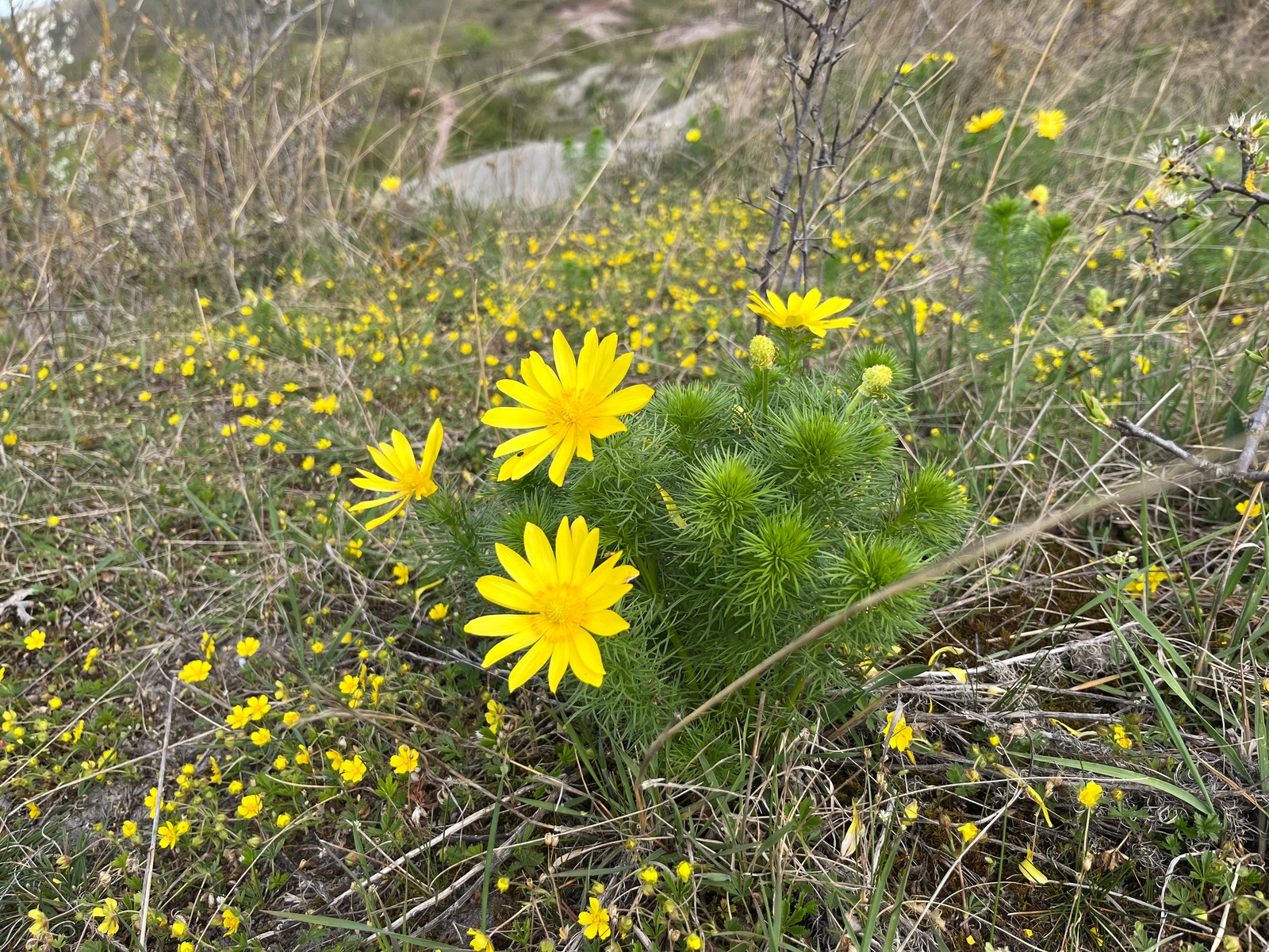 Hallo zusammen, inzwischen ist es Tradition. Alle Jahre wieder besuchen wir die Drei Gleichen, um Die kleinen Sinnen - alias Adonisröschen zu sehen. Und noch nur die. Es gibt immer etwas zu entdecken, was im Jahr zuvor anders oder gar nicht da war. Leider war es gestern wegen der Trockenheit weitgehend pilzfrei. Hier ein paar Impressionen: