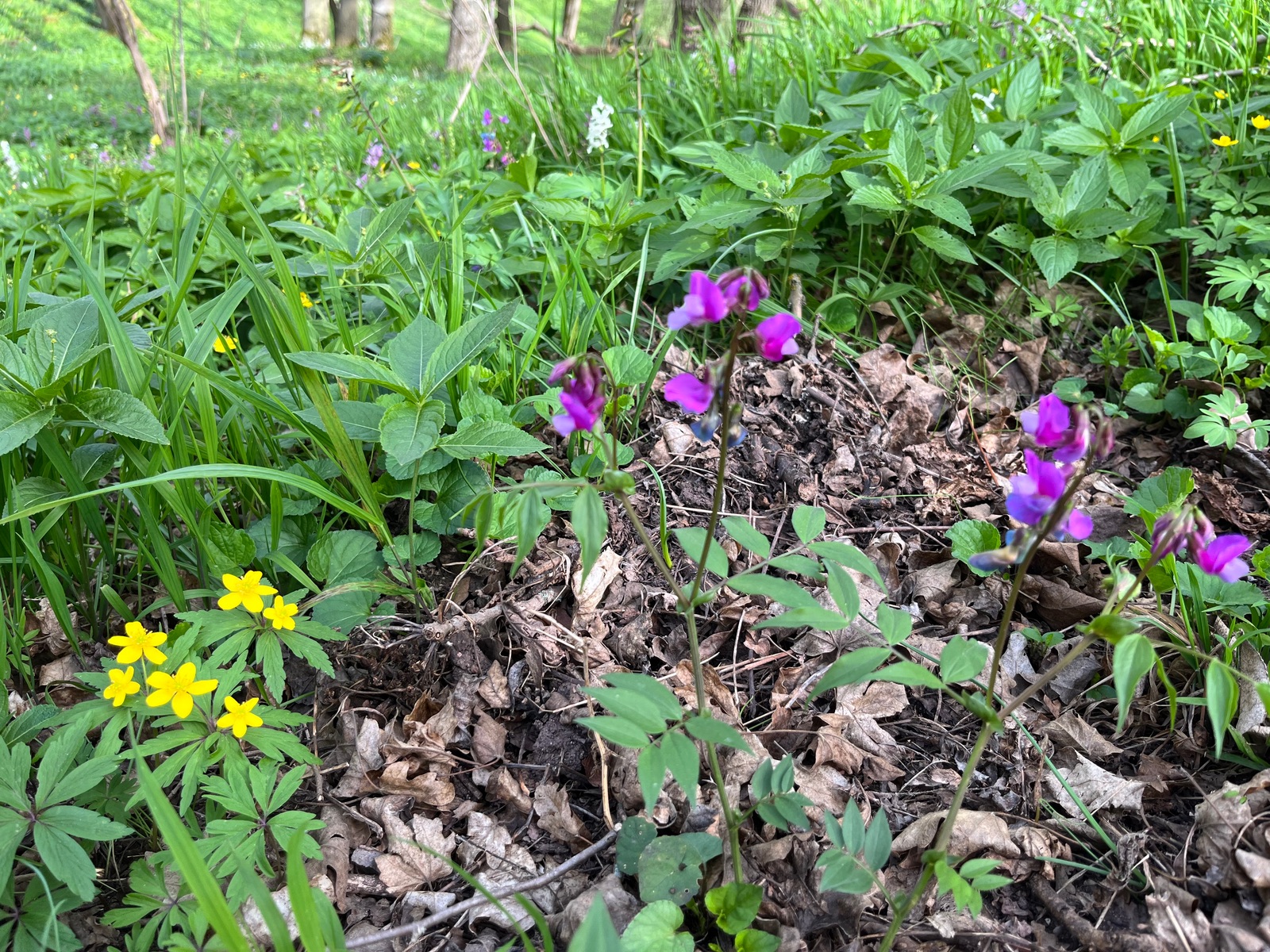 7 Frühlingsplatterbsen mit leuchtenden Blütenfarben und Gelbe Windröschen.