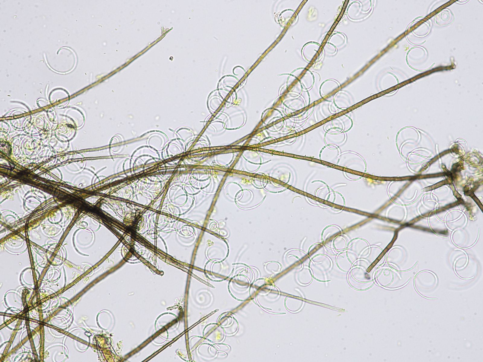 auf letztjährigen Eichelschalen fand ich diesen grüngelben Bewuchs. Unter dem Glas fanden sich dann Massen dieser Spiralsporen, ob sie dazu gehören oder woanders herkommen konnte ich nicht herausfinden. Ich habe jedenfalls keine irgenwo anhaftenden Sporen finden können. Eine substratspezifische Suche im Ellis brachte micht nicht weiter.