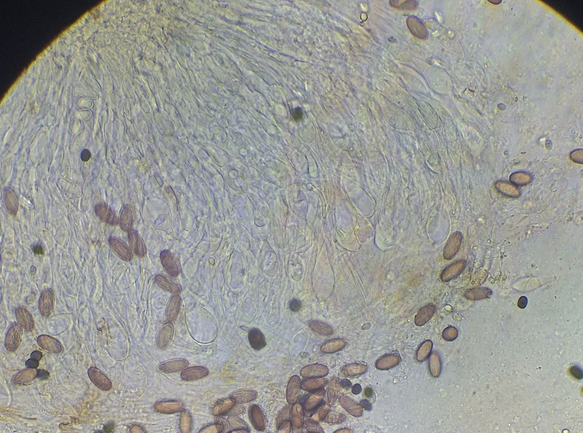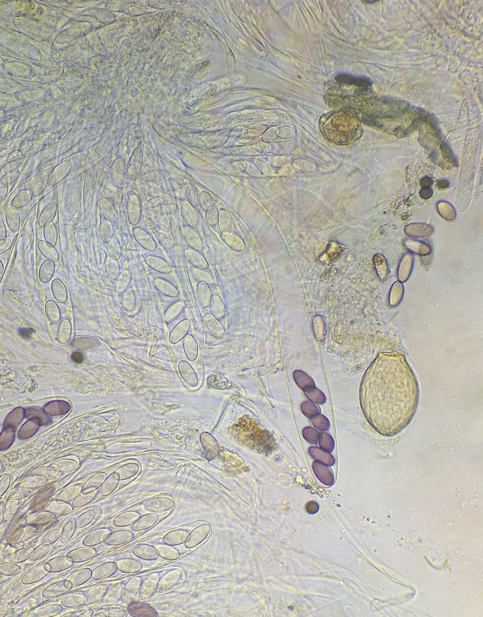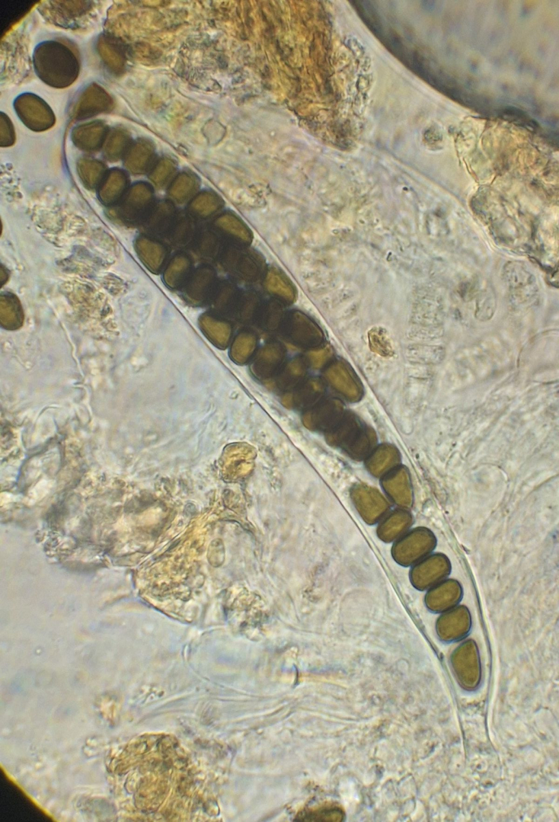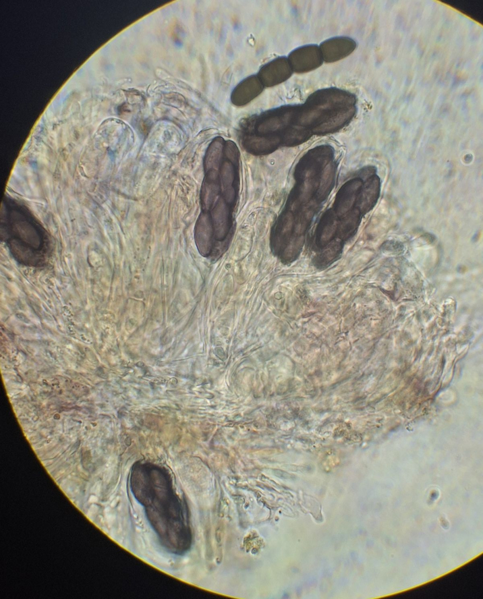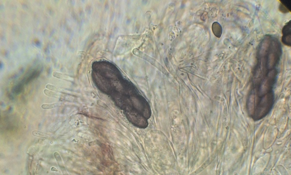 2) gleich daneben die eingangs dunkle Gestalt ähnlicher Form, die vielleicht ein altes Exemplar der selben Art darstellt, massenhaft passende Sporen sind jedenfalls da, auch das blasige äußere Excipulum scheint zu passen