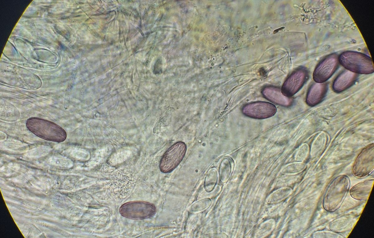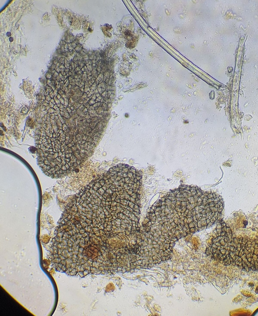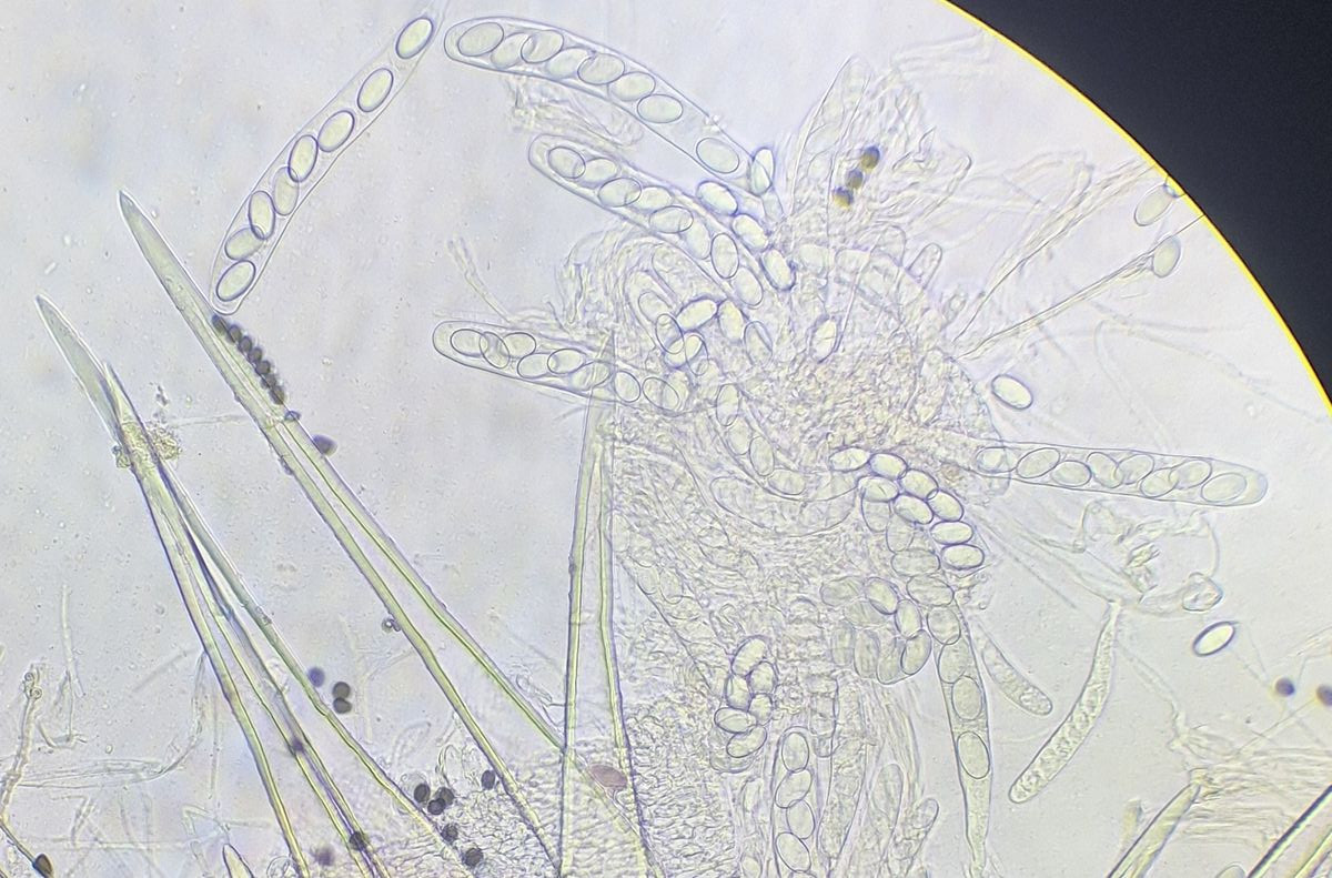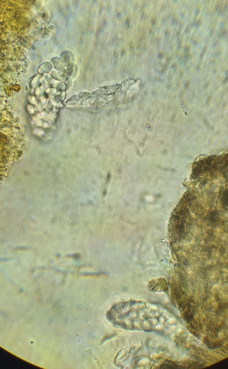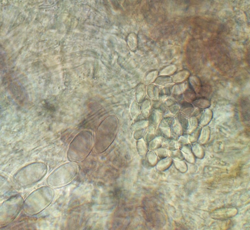 2) gleich daneben die eingangs dunkle Gestalt ähnlicher Form, die vielleicht ein altes Exemplar der selben Art darstellt, massenhaft passende Sporen sind jedenfalls da, auch das blasige äußere Excipulum scheint zu passen