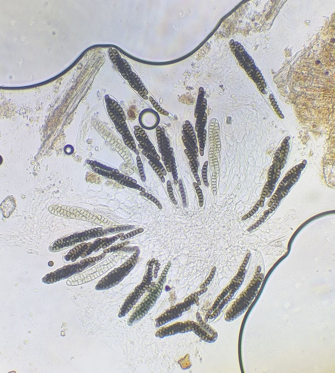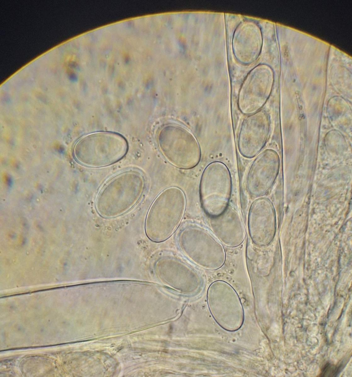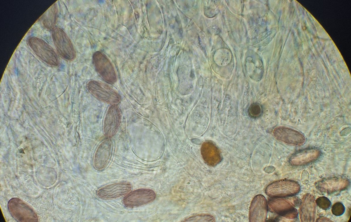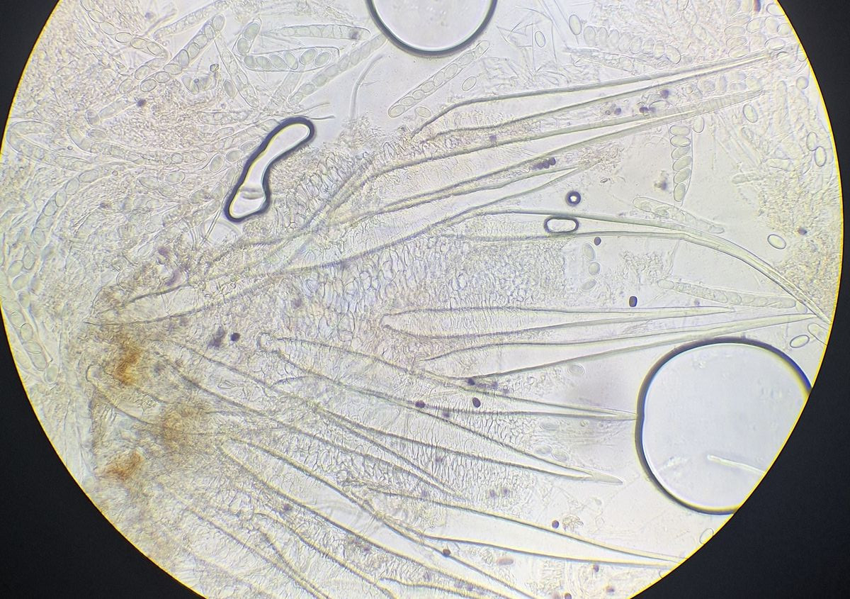 2) gleich daneben die eingangs dunkle Gestalt ähnlicher Form, die vielleicht ein altes Exemplar der selben Art darstellt, massenhaft passende Sporen sind jedenfalls da, auch das blasige äußere Excipulum scheint zu passen