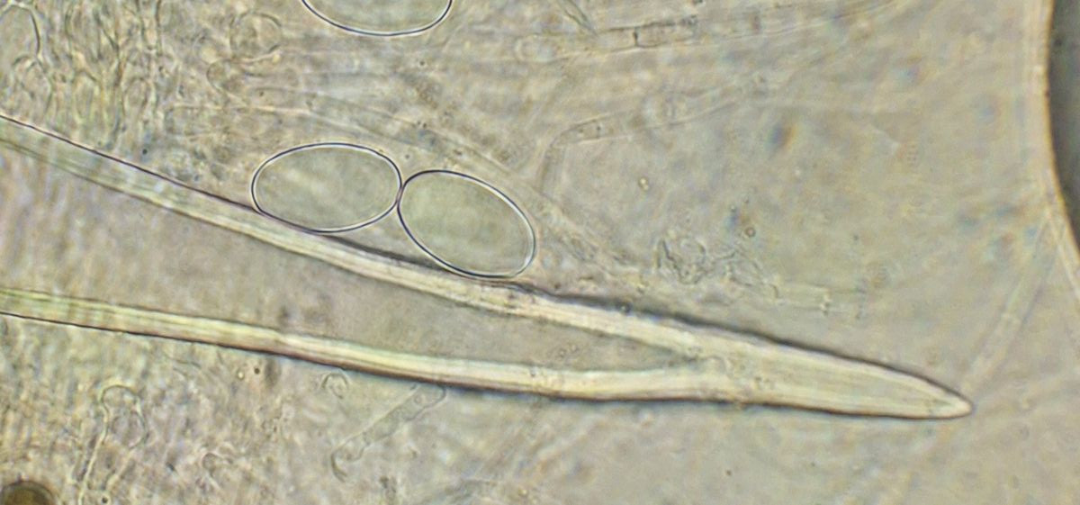 4) an Elch wächst auch ein Haarbecherchen, Haare 320-440*30-42 µm, Sporen 16-19*10-12 µm, teilweise Gelhülle, Asci 140-170*12-15 µm. Das ist jetzt irgendwie grenzwertig zwischen Lasiobolus intermedius und L. ciliatus, sozusagen (intermedius2). Ich tendiere eher zu intermedius.