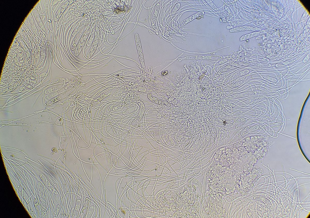 Auf Reh/Hirsch gab es winzige weißliche Punkte. Unterm Mikroskop zeigen sich charakteristische, wie ich meine, Sphagetti-Paraphysen. Die Sporen sind leider noch nicht reif und viele Asci noch ohne Sporen.