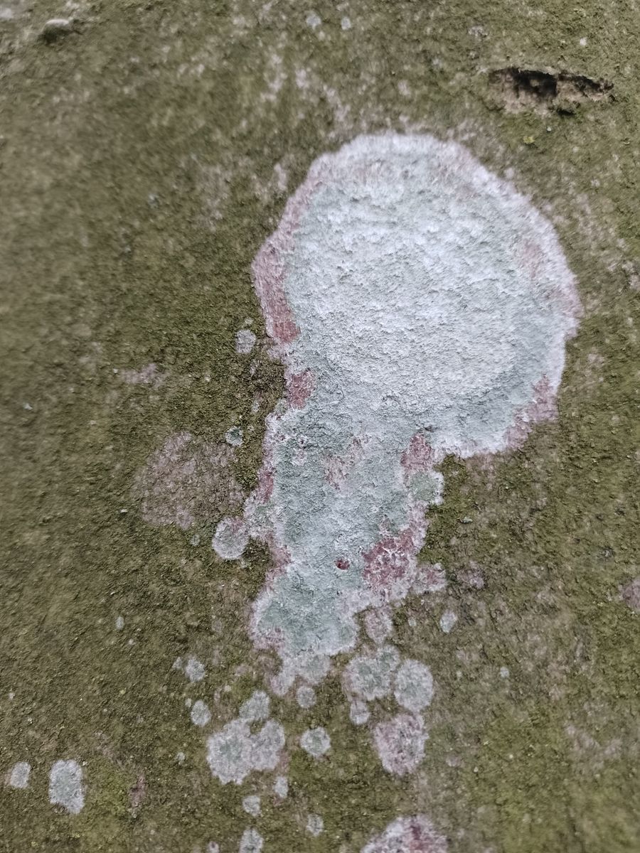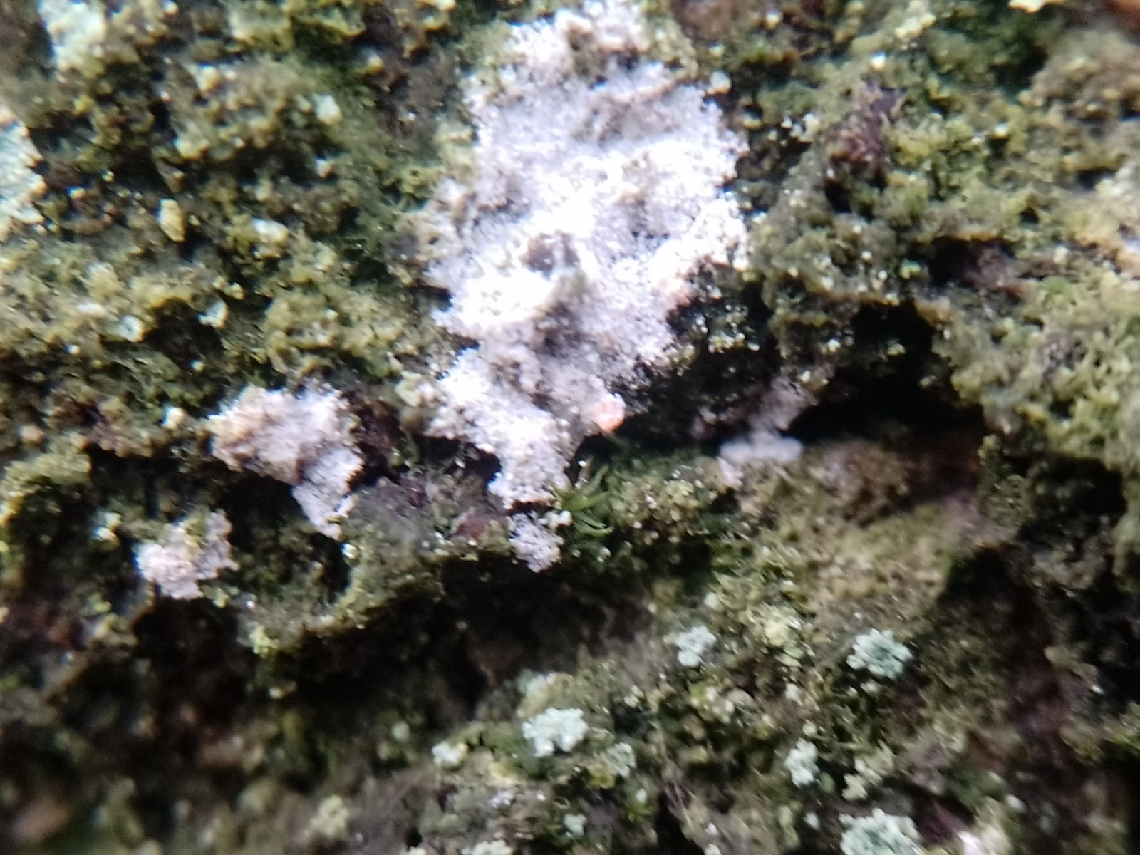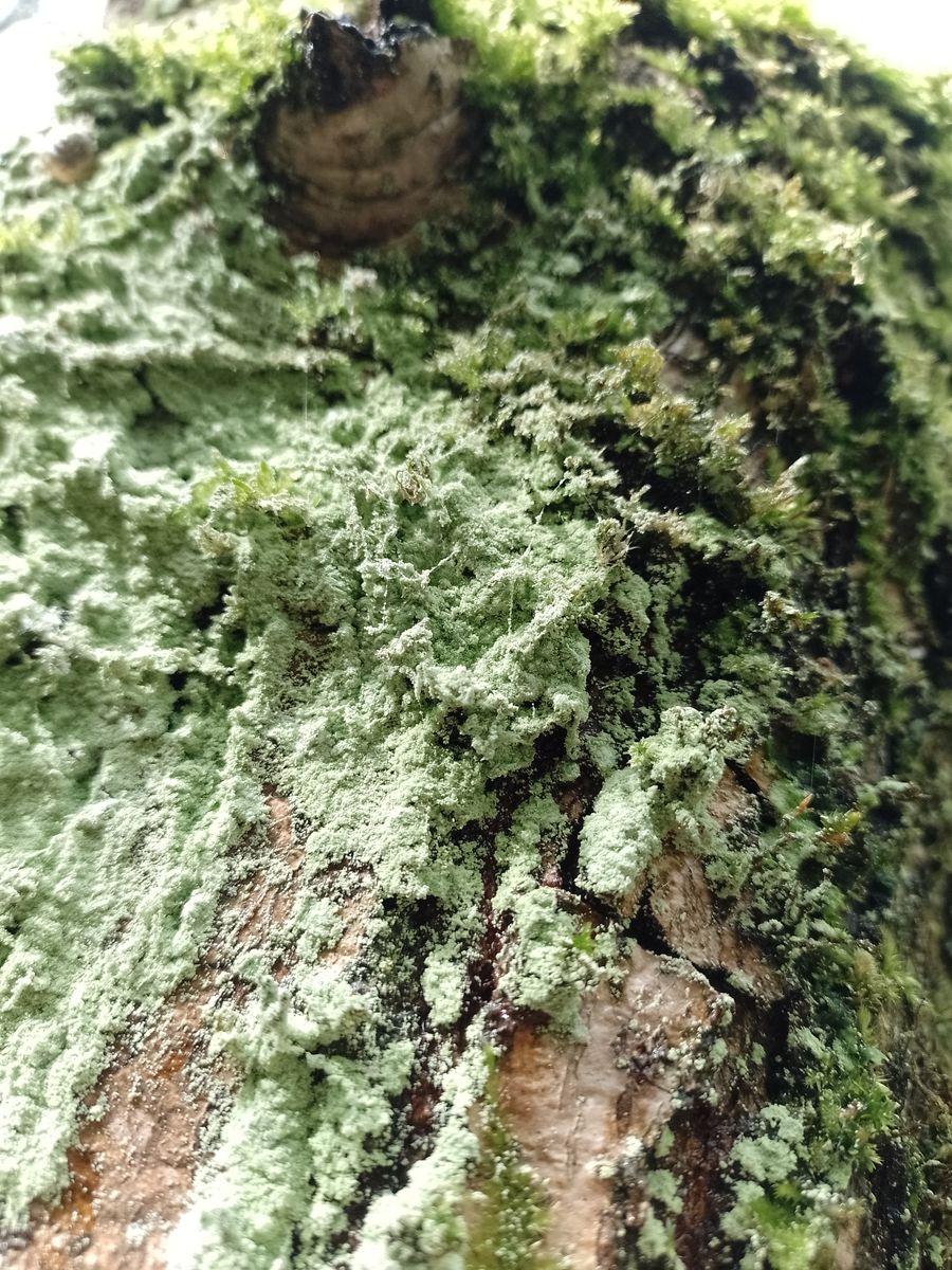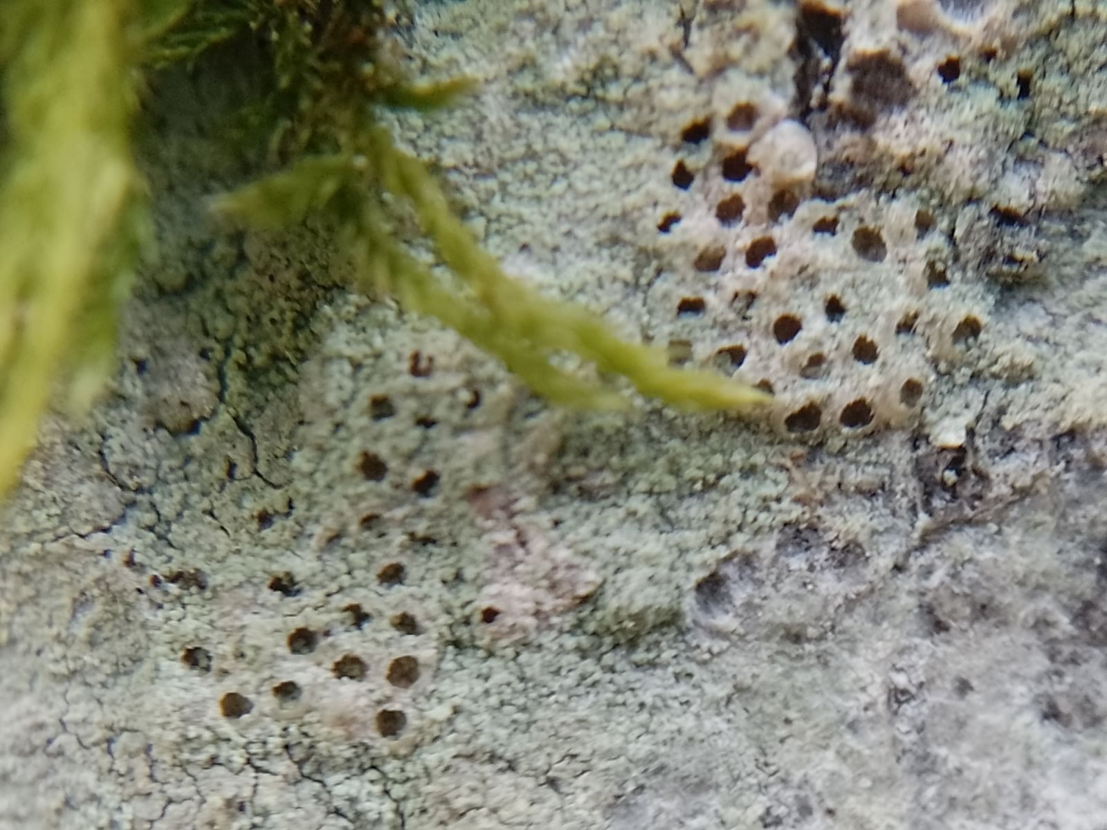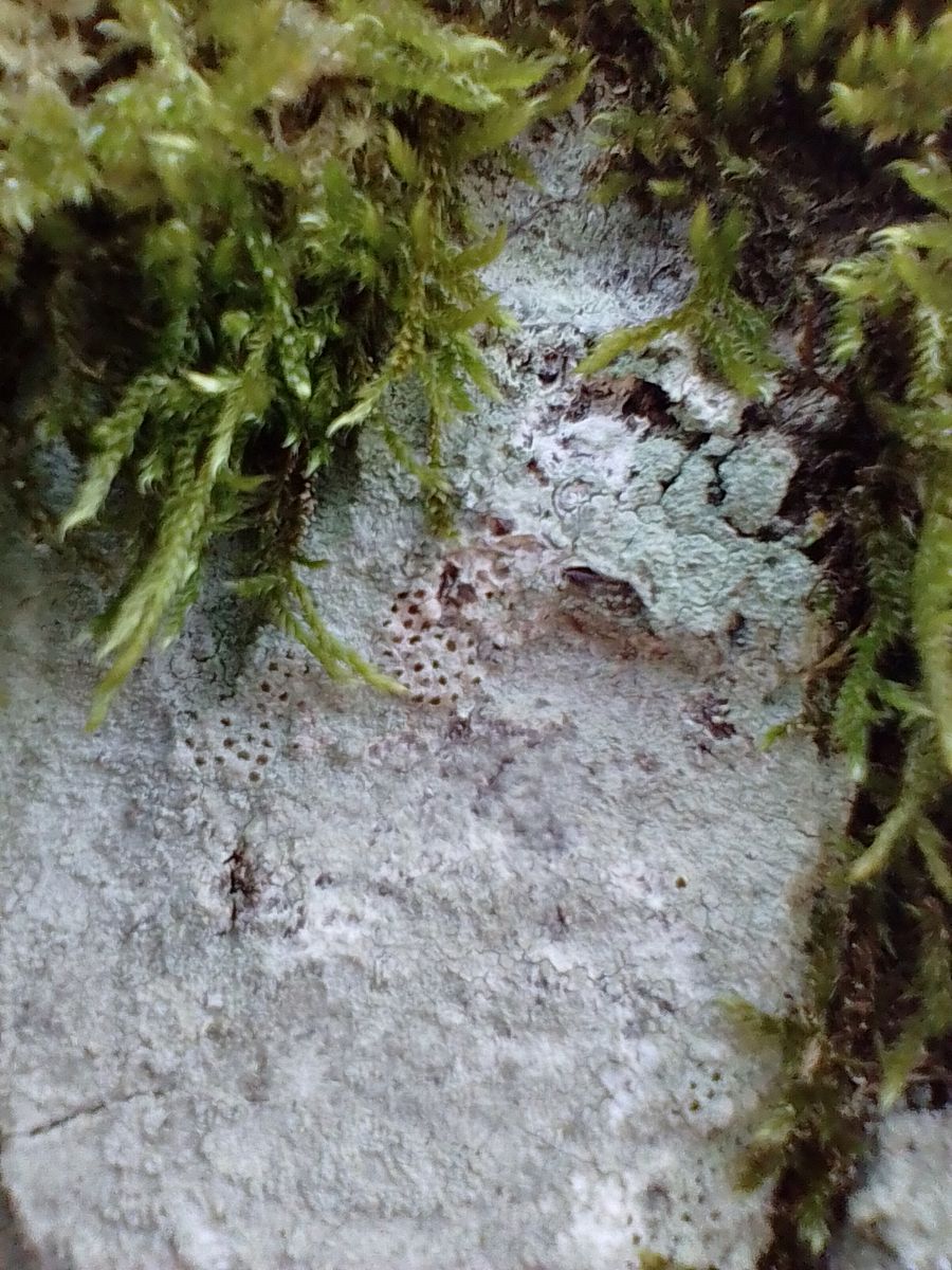 Zum Schluss wusste ich aber nicht mehr weiter. Auf einem Eichenbaum auf gut 1,90m Höhe auf Moos, diese unbekannte Flechte. Zuerst dachte ich an Phlyctis argena, doch dann sah ich so etwas wie Apothecien. Dann dachte ich an Phlyctis agelaea mit Apothecien. Doch ohne Chemie dabei ist nx zu machen.