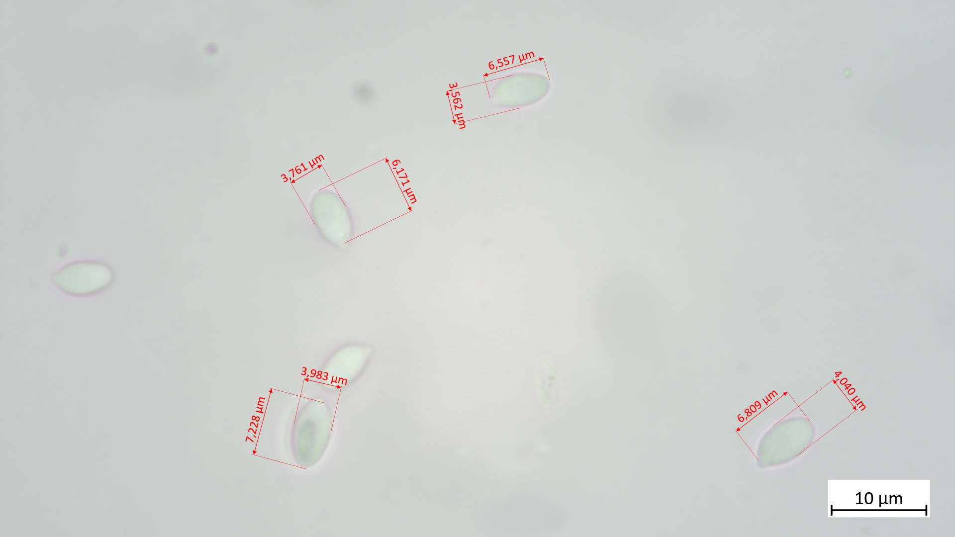 6,2-7,2 µm (av. 6,7 µm, SD 0,4 µm) x 3,6-4,0 µm (av. 3,8 µm, SD 0,2 µm); Q = 1,6-1,8 (av. 1,7, SD 0,1)(n = 4)