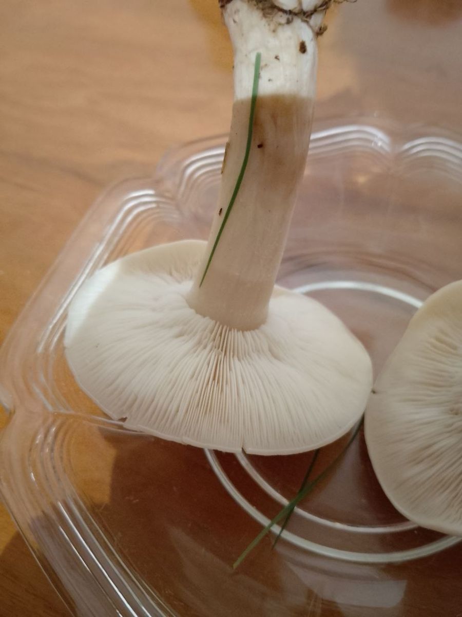 Der Pilz ist jedenfalls in einem Hexenring gewachsen, hygrophan, Lamellen sind angewachsen. Man kann den Stiel schlecht vom Hut lösen. Geruch ist angenehm ähnlich wie der Marzipanschneckling. Das Sporenpulver ist weiß, die Sporen sind elliptisch, glatt, dünnwandig. Ornamente sind mir keine aufgefallen. Der Pilz hat Basidien, ich vermute der Pilz ist aus der Gattung hygrocybe oder hygrophorus.