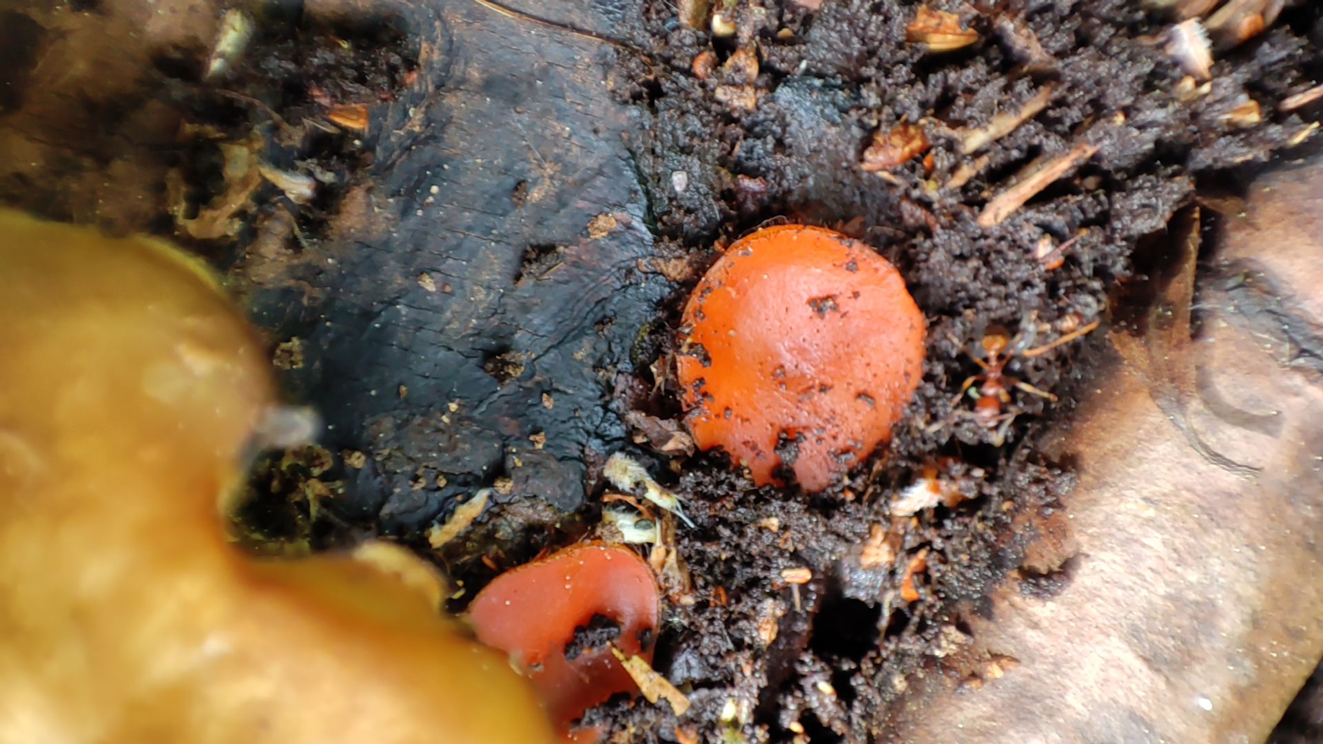 Bei den orangen Bechern glaube ich Wimpern zu erkennen, das legt die Vermutung von Scutellinia nahe.