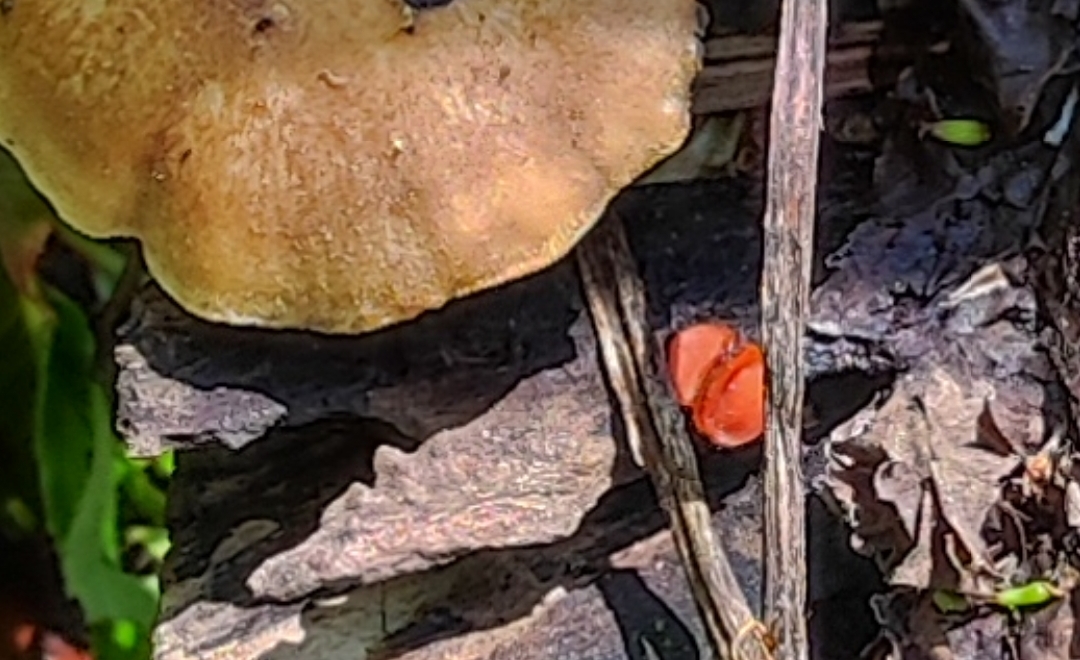 2. - 5.: Die Pilze (2 Arten: Einmal die relativ großen "Hutpilze", dm ca. 3-5cm und außerdem kleine, knall-orangerote, evtl. becherförmige, weniger als 1cm) auf einem vermoderten Holzstück, verschiedene "Schnellschüsse" mit dem Handy.