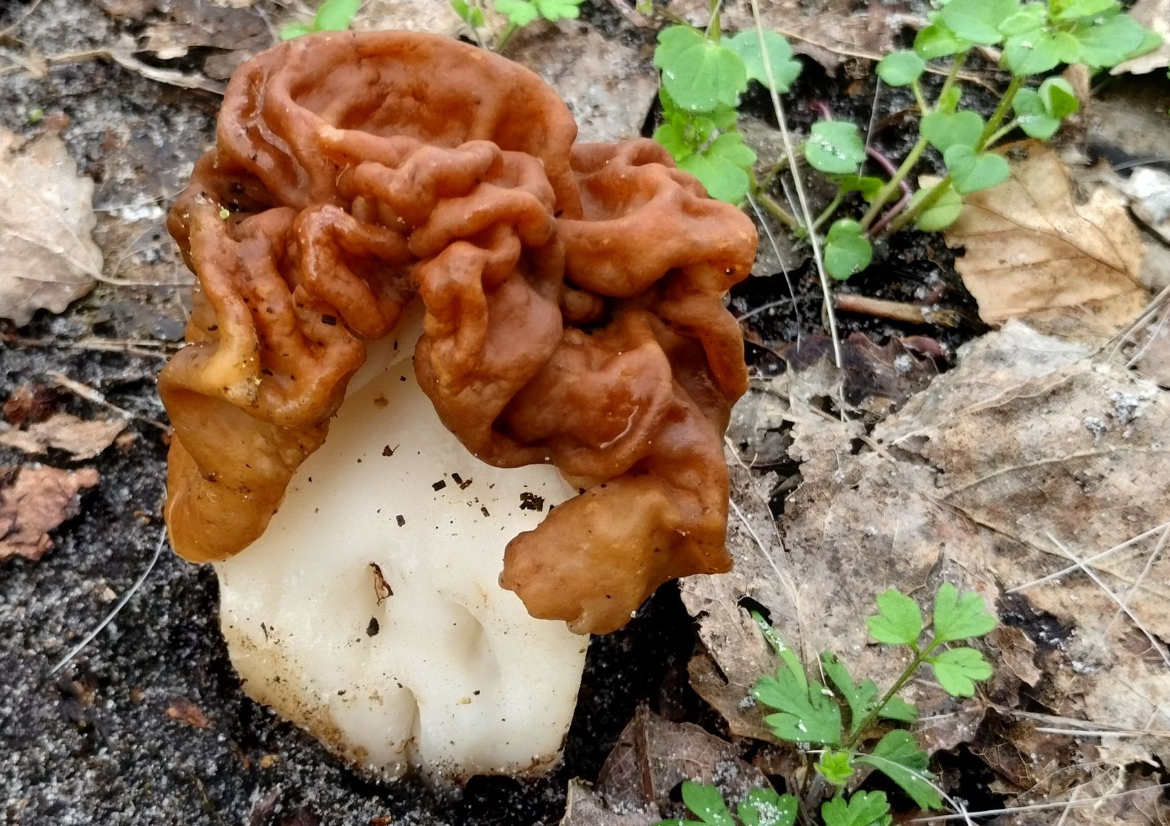 Nach längerer Pause habe ich vor kurzem an einer mir bekannten Stelle von Riesenlorcheln/Laubwaldlorcheln dieses schöne Exemplar gefunden. Die etwa 10 cm große Lorchel wuchs direkt auf locker-sandigen Muschelkalk, in der Nähe viel Totholz von Pappel, Weißdorn und Eiche. Ob es sich nun um Gyromitra gigas oder Gyromitra ticiniana handelt, kann ich nicht beurteilen weil nicht mikroskopisch untersucht. In der Nähe hatte ich vor einigen Jahren auch mehrere Lorcheln an Eichenholz gefunden, die allerdings mikroskopisch als Gyromitra gigas bestimmt wurde. Das Bild habe ich mit Handy aufgenommen und nicht die beste Qualität.