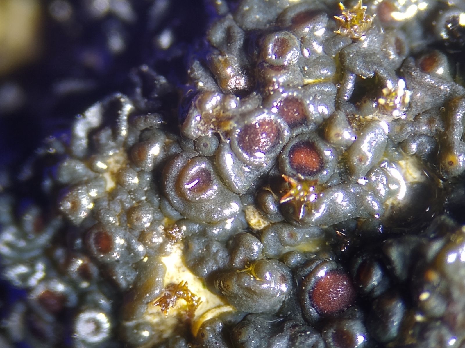 Bild 11 Gleiche Stelle aber angefeuchtet: Thallus stark anschwellend und die braunen Fruchtscheiben zeigend