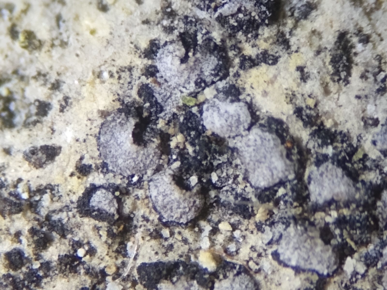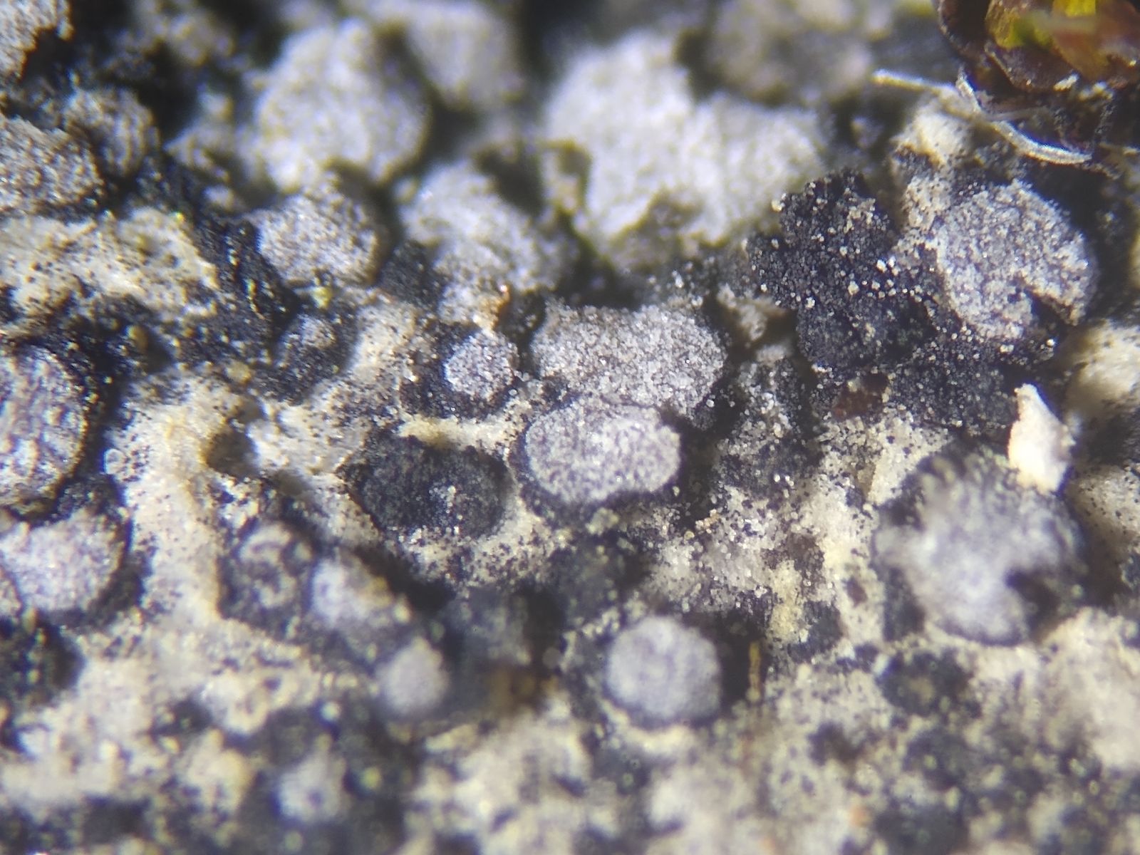 Eine seltsame, sterile Flechte mit stark weiß bereiften Schüppchen, deren Ränder dunkle Soredien tragen, entpuppt sich als Acarospora moenium: