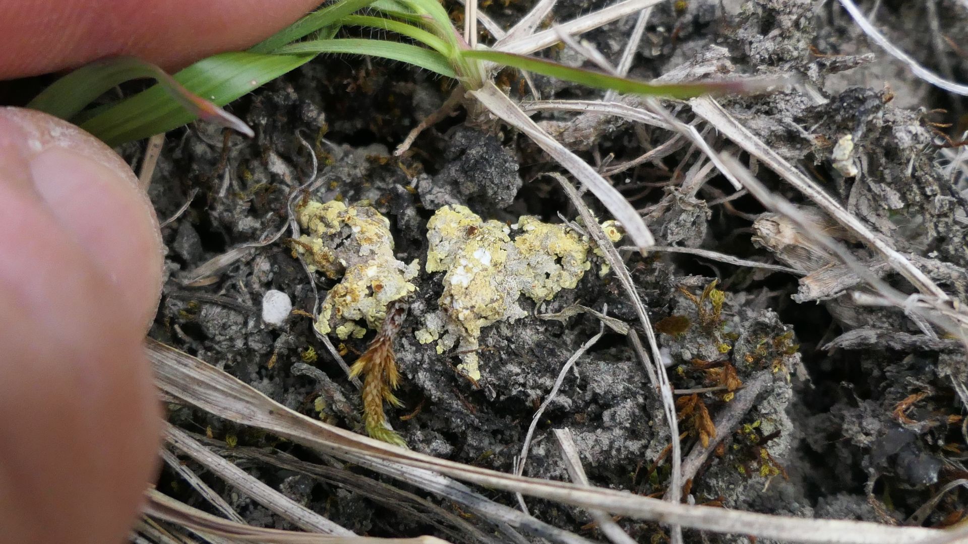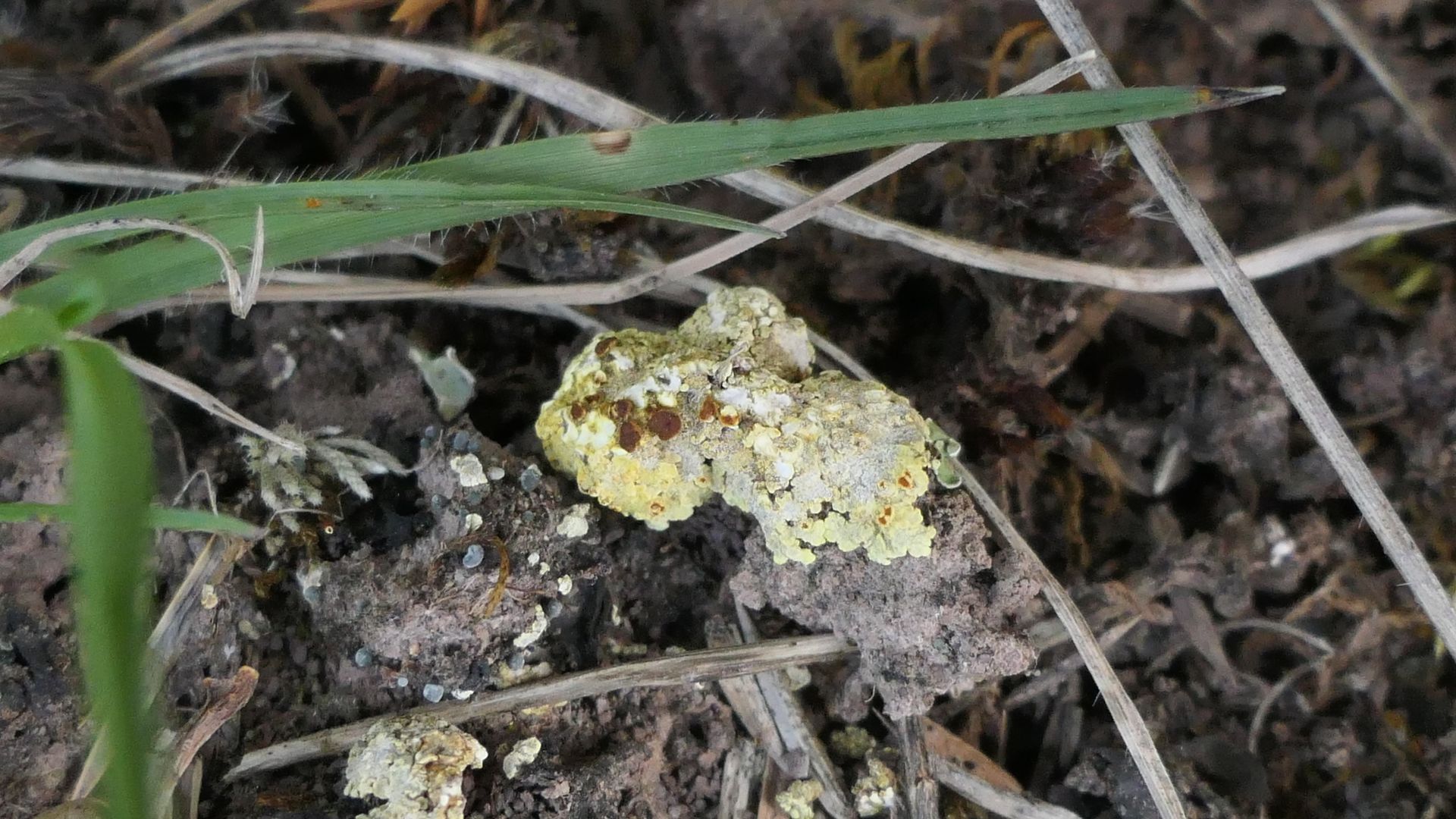Besonders schön ist, dass es nicht eine einzige Kruste ist, über die zufällig gestolpert bin, sondern man kann beim genauen Hinsehen überall winzige gelbe Jungthalli auf und zwischen den Bodenkrümeln erkennen (z.B. in Bild 4). Offenbar fühlt sich die Flechte wohl und vermehrt sich.