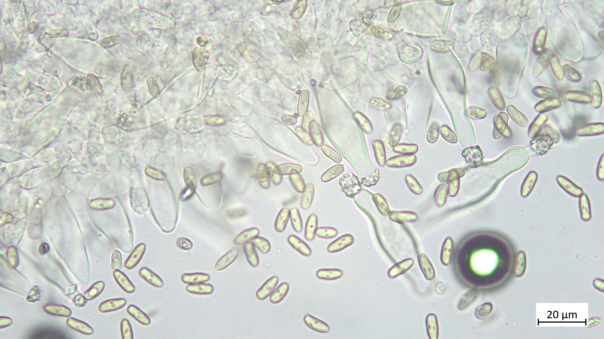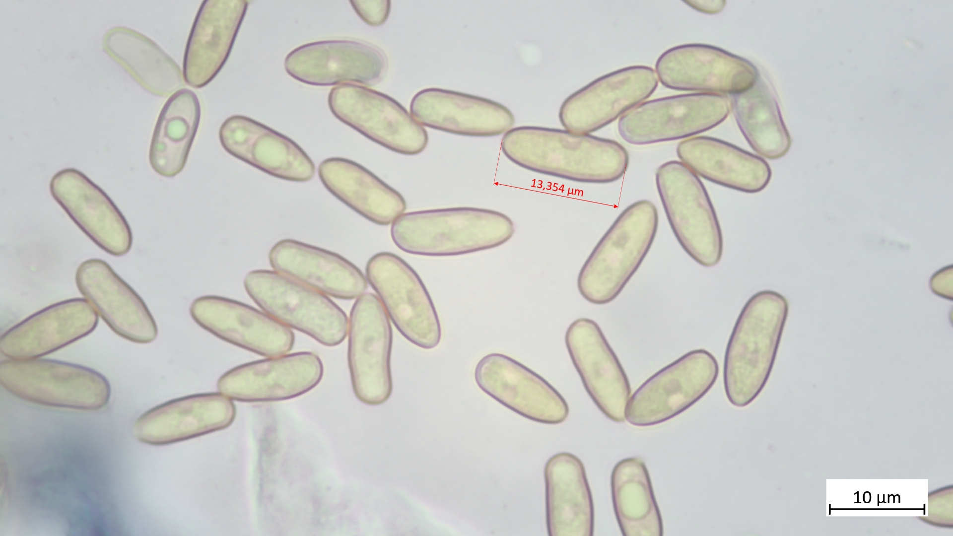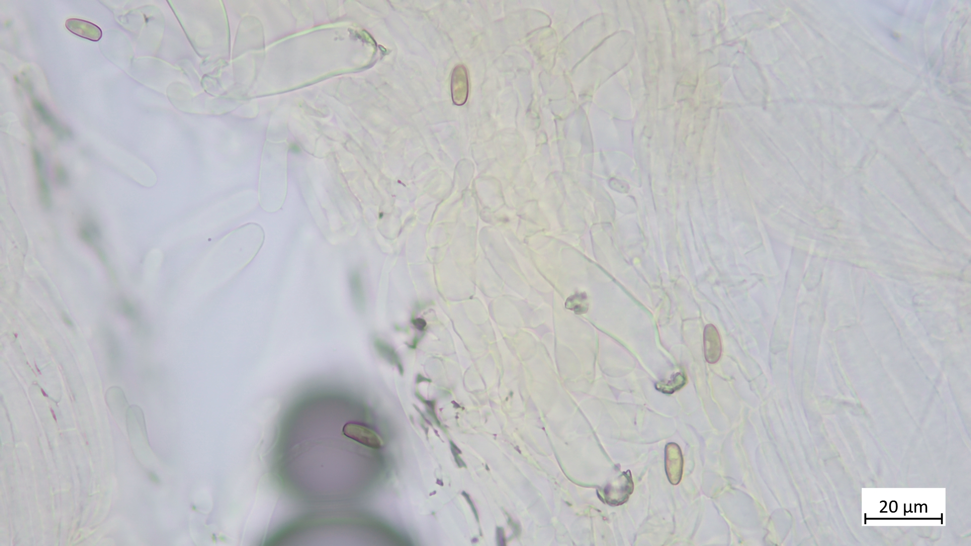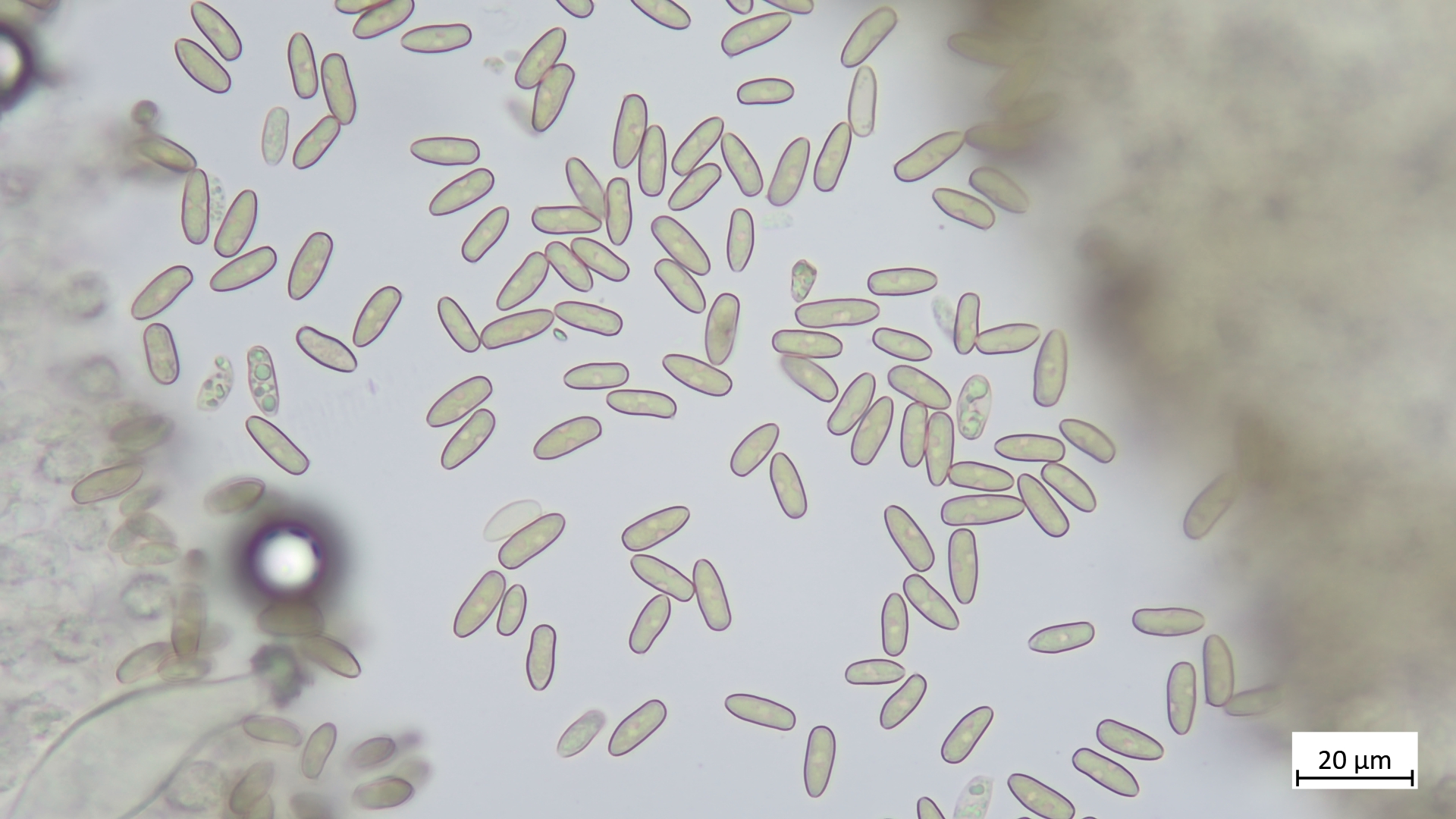 Sporen lang und schmal, leicht wellig (Übergang glatt- zu höckersporigen Arten, mitunter passt auch "geschossförmig")