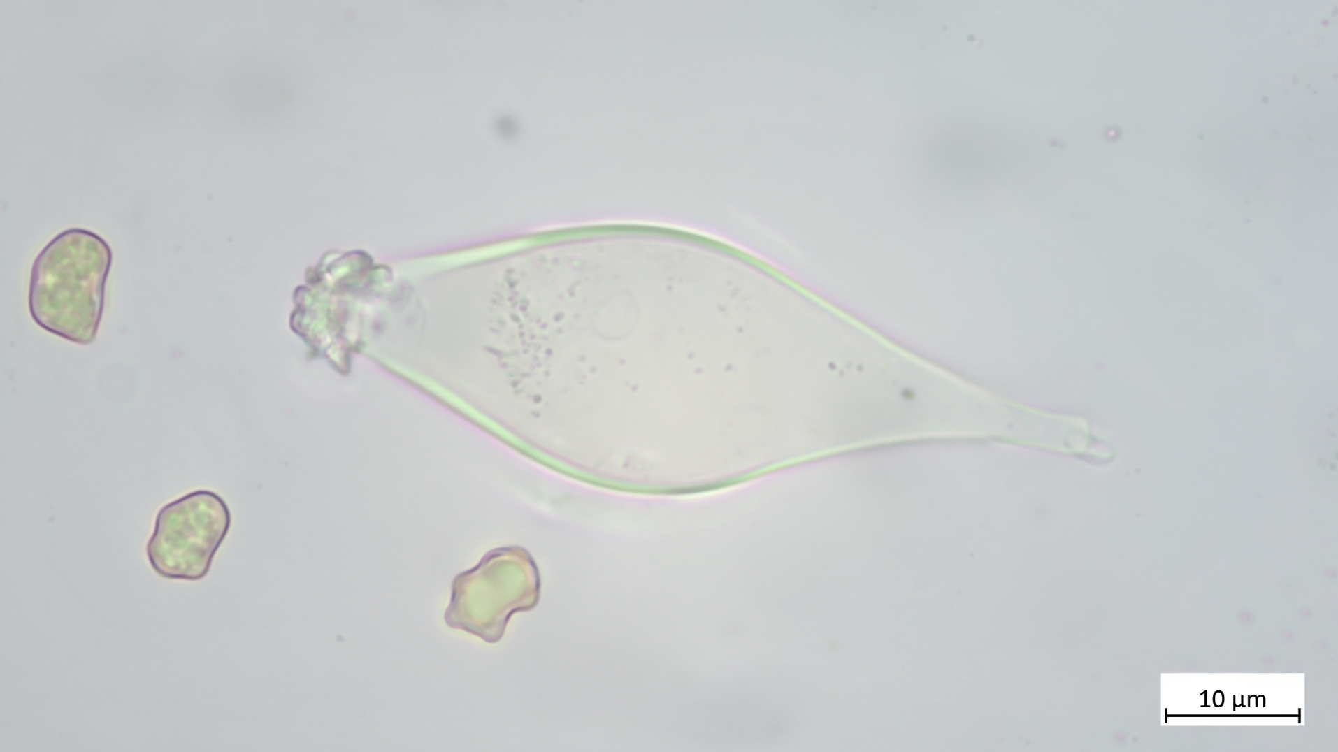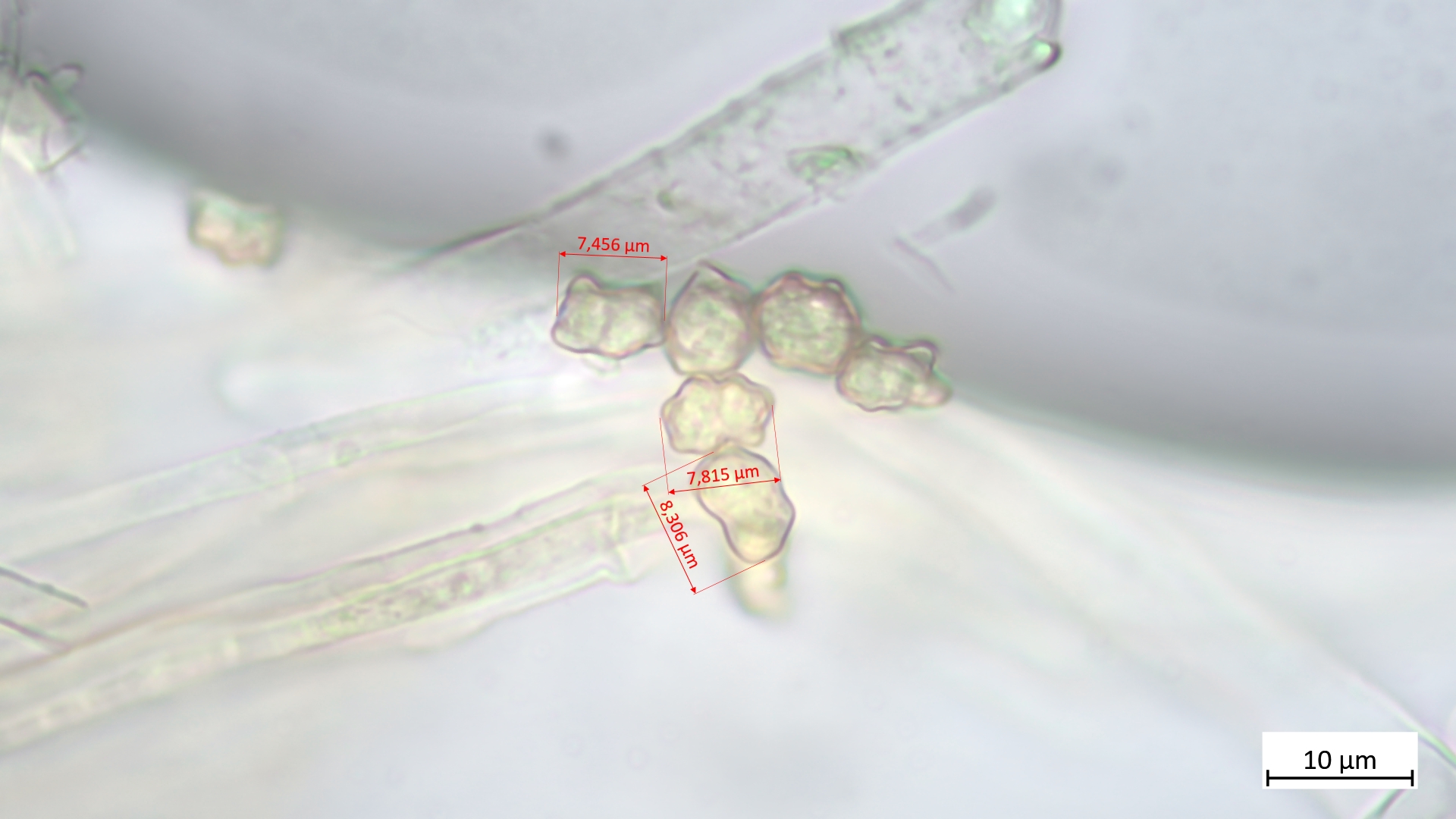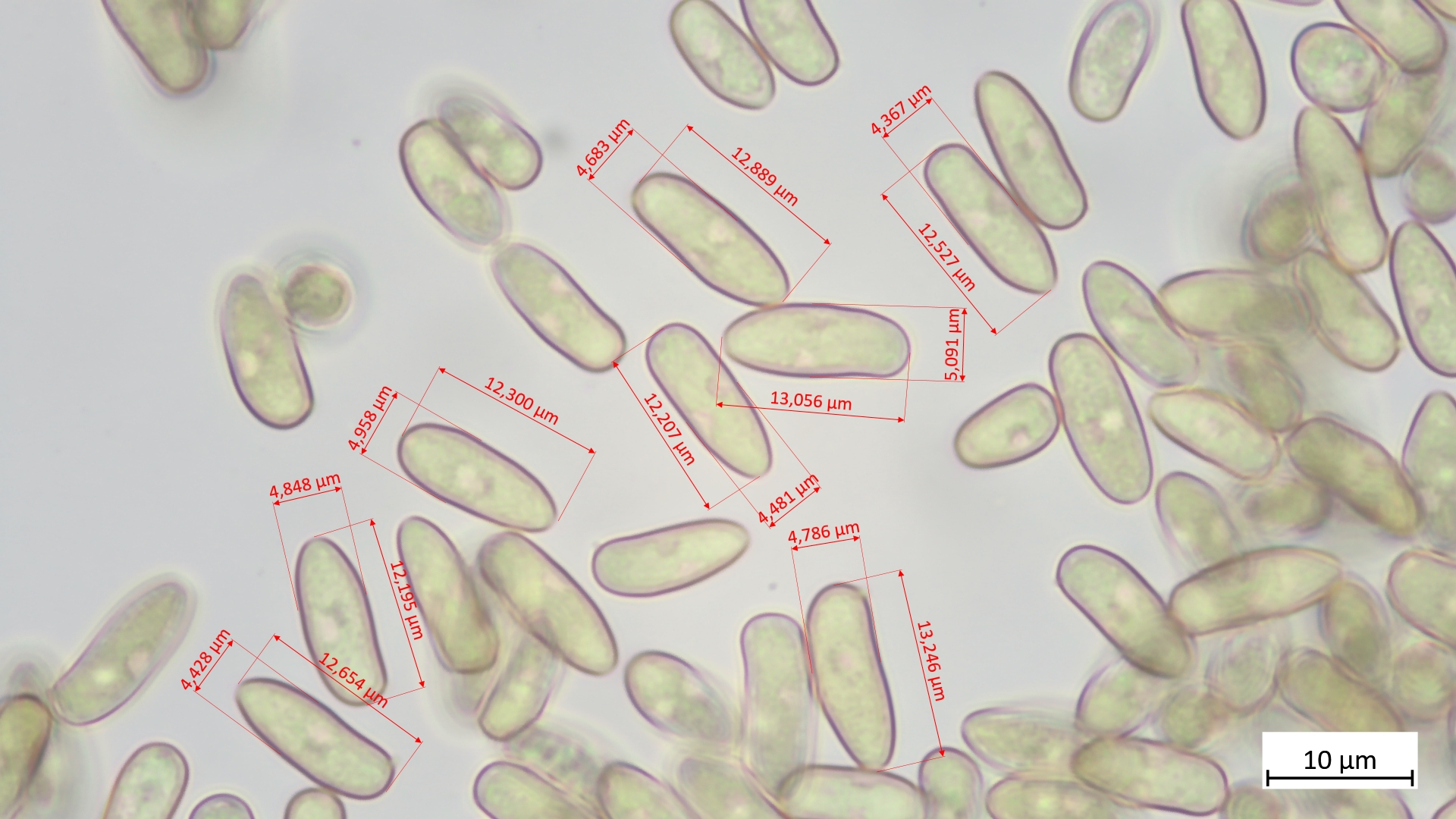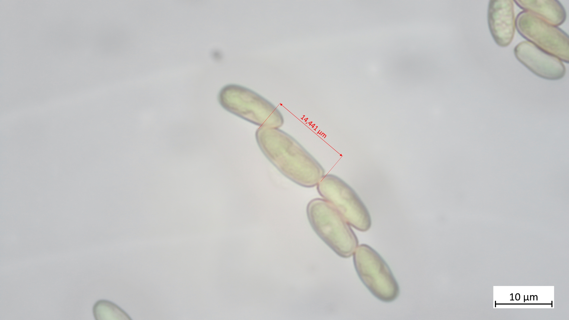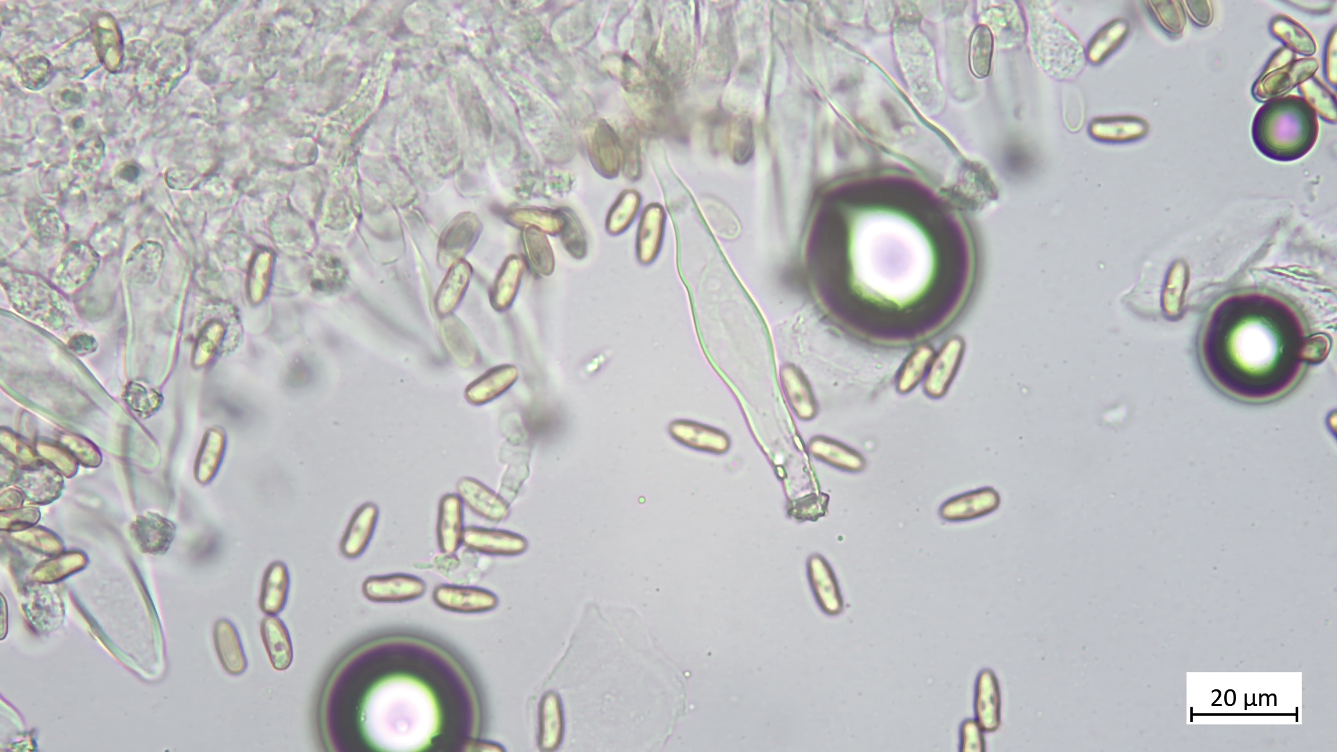 Sporen lang und schmal, leicht wellig (Übergang glatt- zu höckersporigen Arten, mitunter passt auch "geschossförmig")