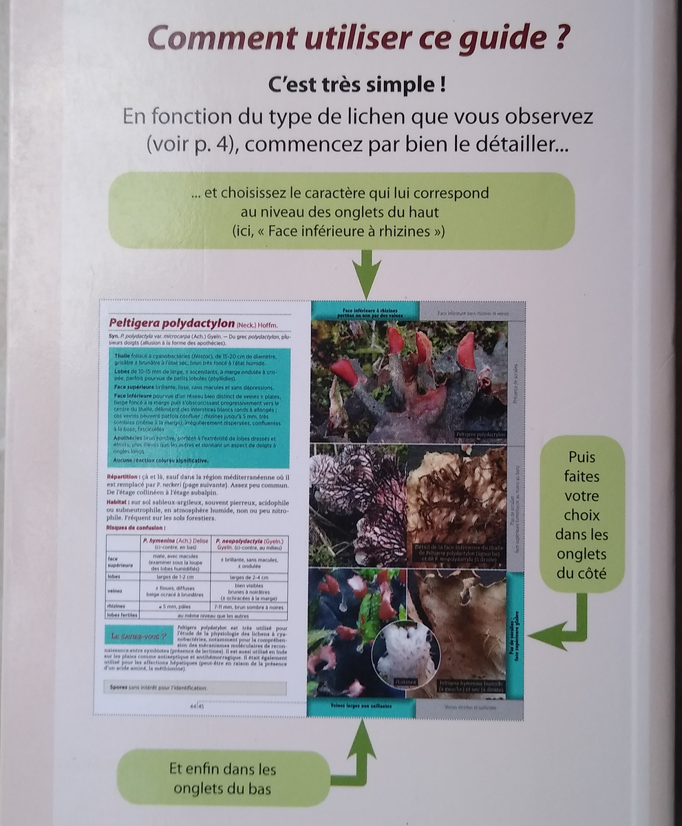 So wird im Band "Lichen des roches" z.B. nach Nabelflechten; Blattflechten; Strauchflechten; Schuppenflechten; Gallertflechten; Krustenflechten: gelappt, ungelappt auf Kalk, auf Silikat, sterile Flechten sortiert. Dann jeweils nach Farbe, Apothecienform, ob Sorale vorliegen, oder nach anderen jeweils auffälligen makroskopischen Kriterien gruppiert: