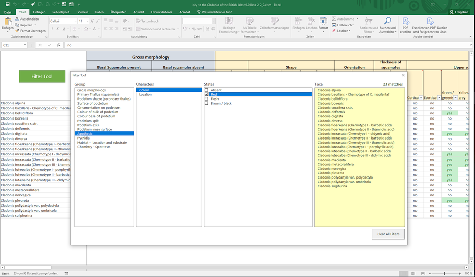 - Interessant ist der Ansatz der British Lichen Society (https://britishlichensociety.org.uk/) mit einer Excel-Datei zum Herunterladen zum Bestimmen von Cladonien (https://britishlichensociety.o…ntification/cladonia-keys).