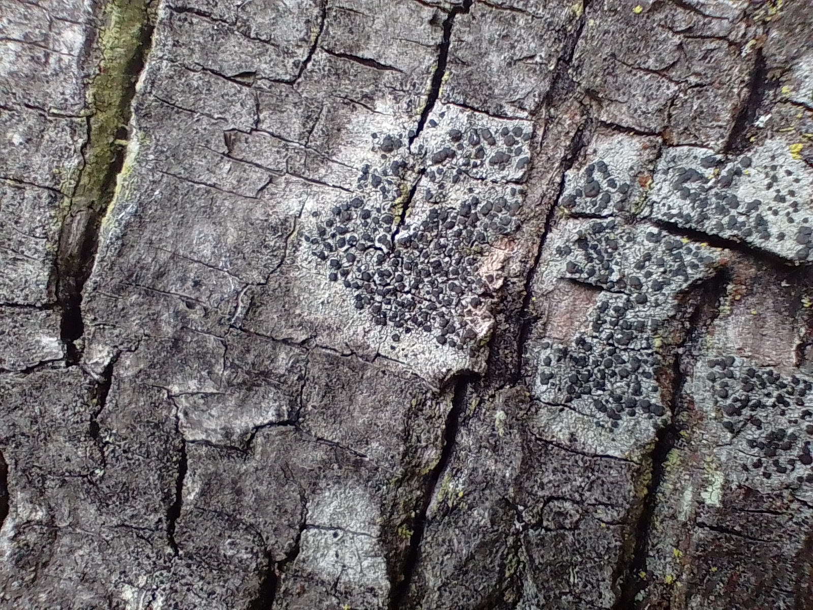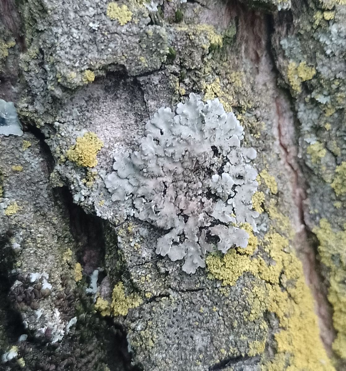 Flechtentechnisch trafen wir auf die üblichen Verdächtigen wie z.B. Physconia grisea (die weiß bereiften Lobenränder kann man leider nicht sehen auf dem Bild) mit Candelaria concolor
