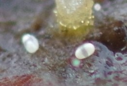 Die Stacheln sind gelblich, teils vielfach septiert, am Ansatz breit verzweigt, am Ende spitz oder abgerundet, Wandstärke ~2,5 µm, breit bis 25 µm, lang bis 500 µm; einige wenige sternförmige Stacheln sind kleiner, farblos und dünnwandig; die Paraphysen sind lang und schlank, 3 µm, nicht verdickt; die Sporen brotförmig, zeimlich klein 8-10*4-5 µm, volle Asci habe ich nicht gefunden. Mit den Daten passt eigentlich keine Art so richtig ...