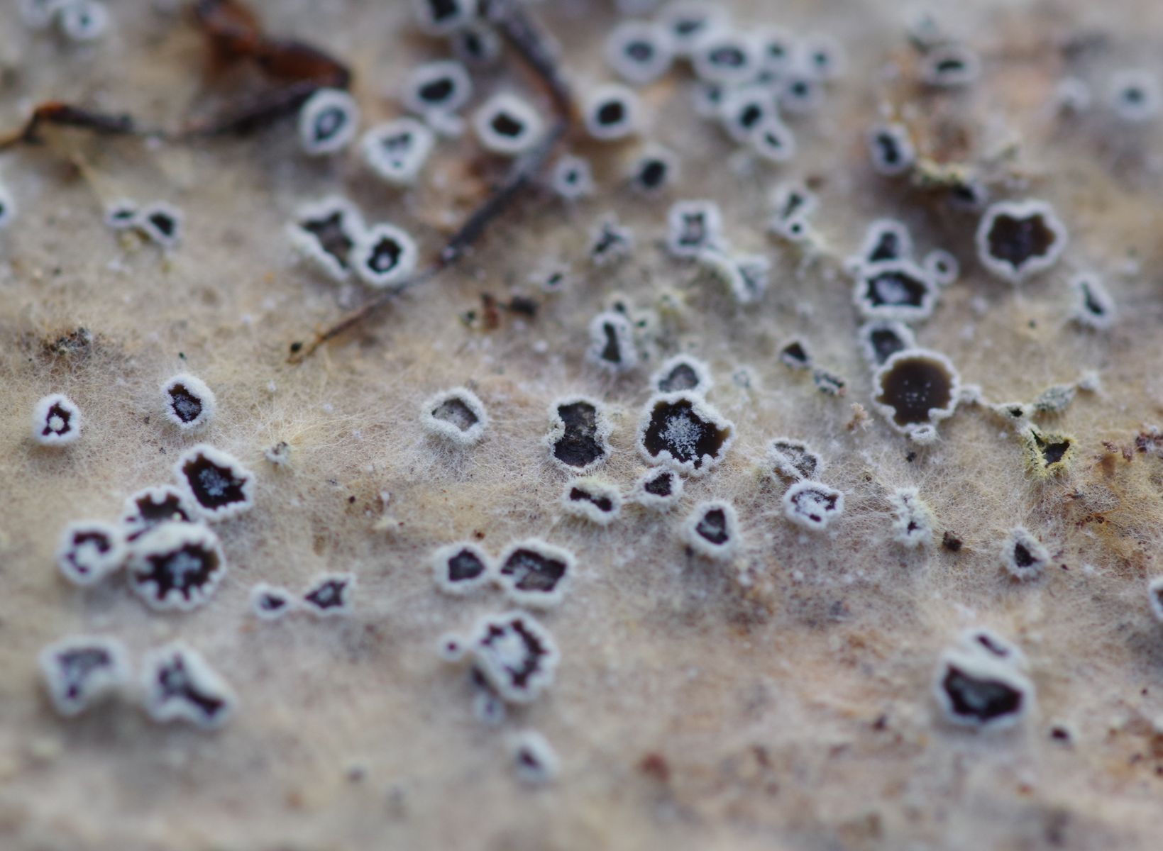 3) unterseits vielfach flächendeckend Eriopezia caesia