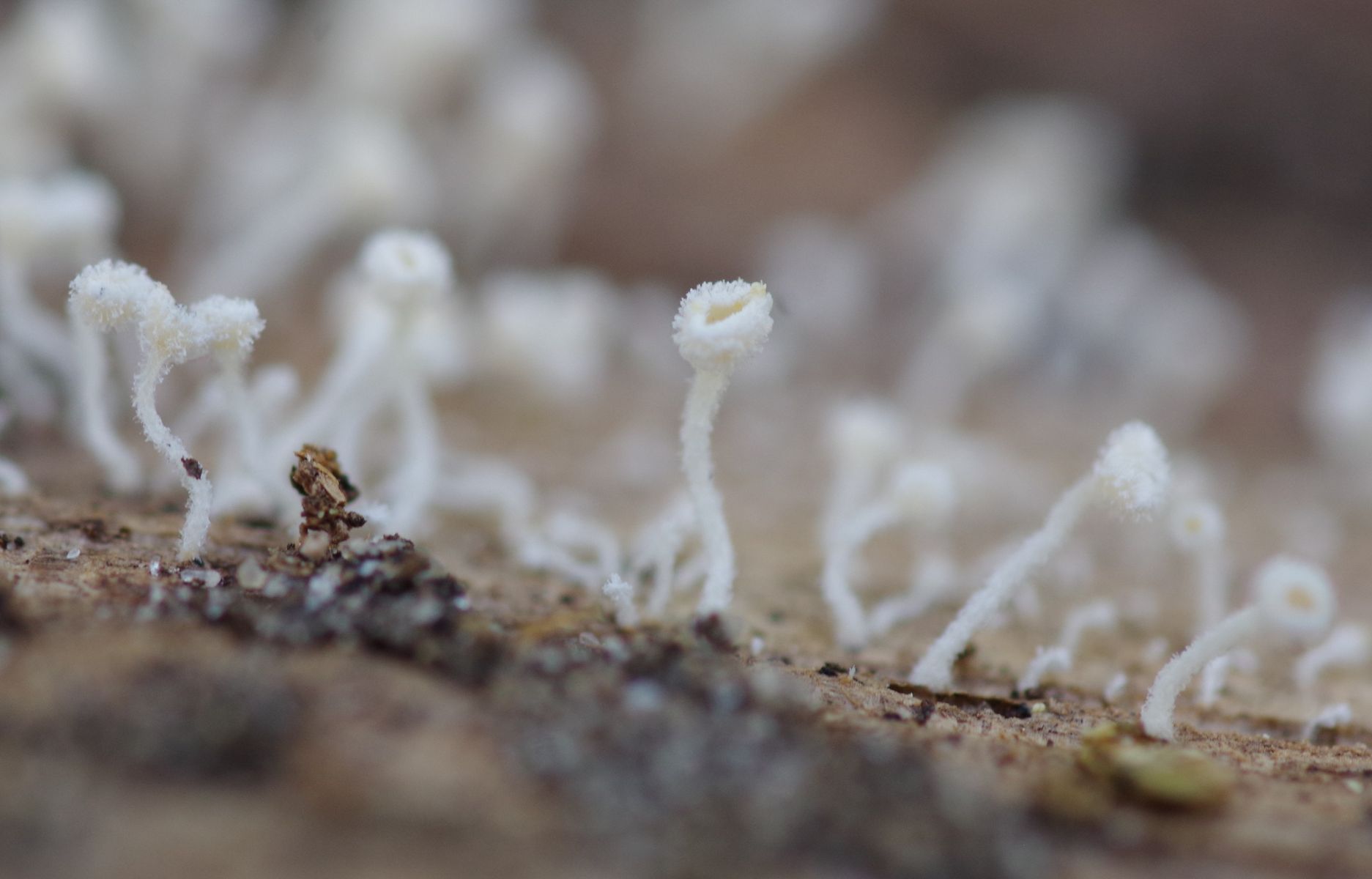 2) ein gestielter, haariger, weißer Becher, vielleicht Richtung Lachnum impudicum? Unreif