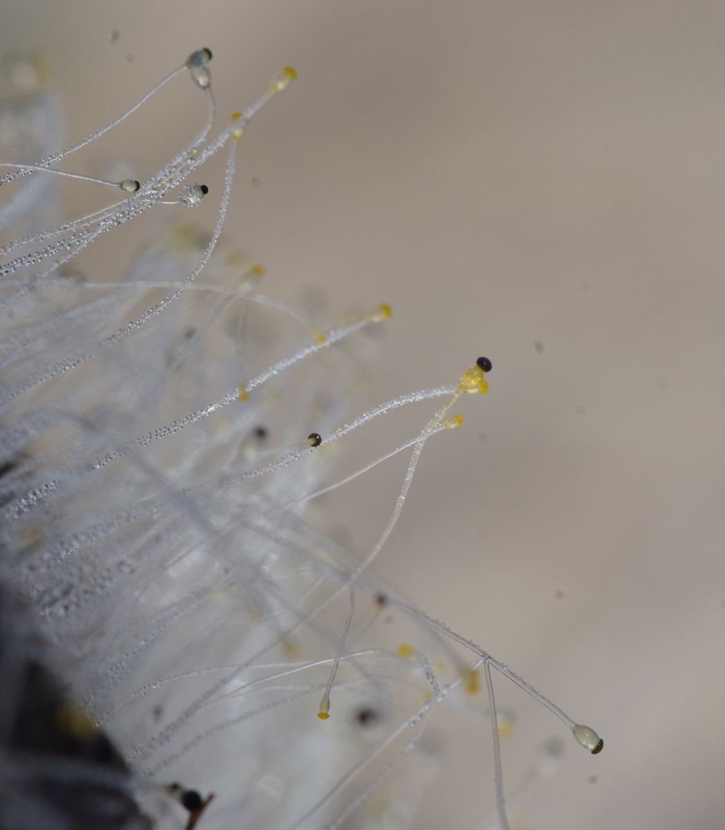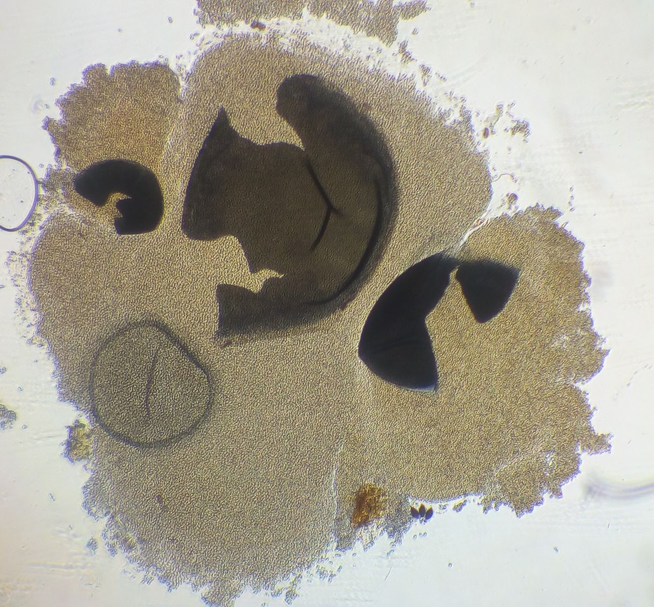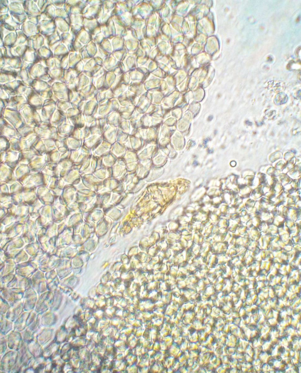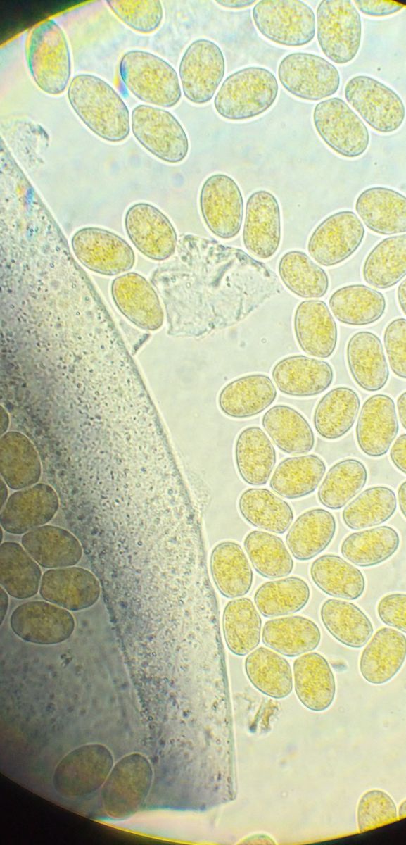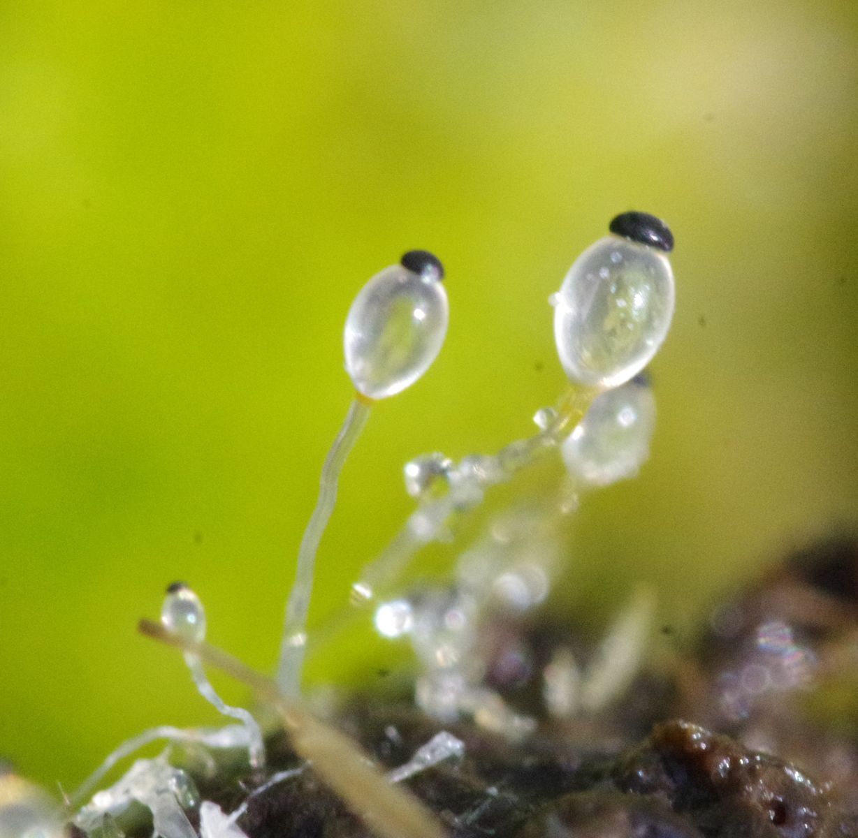 Zum Abend waren die fast alle abgeschossen und ich habe versucht, Material von der Innenseite des Glases abzunehmen, und siehe da, hier sind beide Arten direkt nebeneinander, mit unterschiedlich opaquen Hüten und abweichend großen Sporen. Die großen sind so 8-9 µm lang - das sollte crystallinus sein. Die kleinen sind bis 6 µm, dafür bleibt dann nur noch roridus übrig.