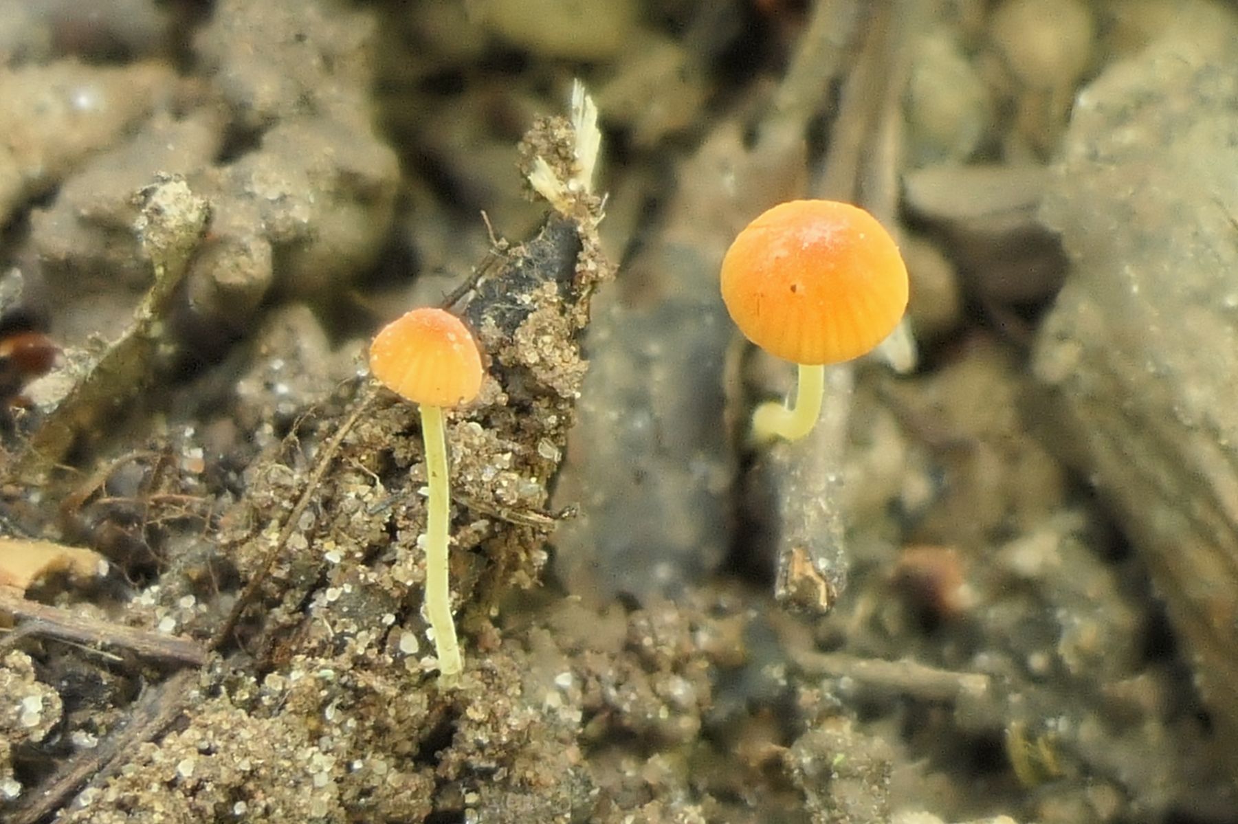 2. Eine sehr kleine Galerina Mycena (0,5 cm Hut) mit langem Stiel von 3-4 cm versehen, die ich so noch nicht gefunden habe. Das Substrat sind unbekannte Holzschnippsel.