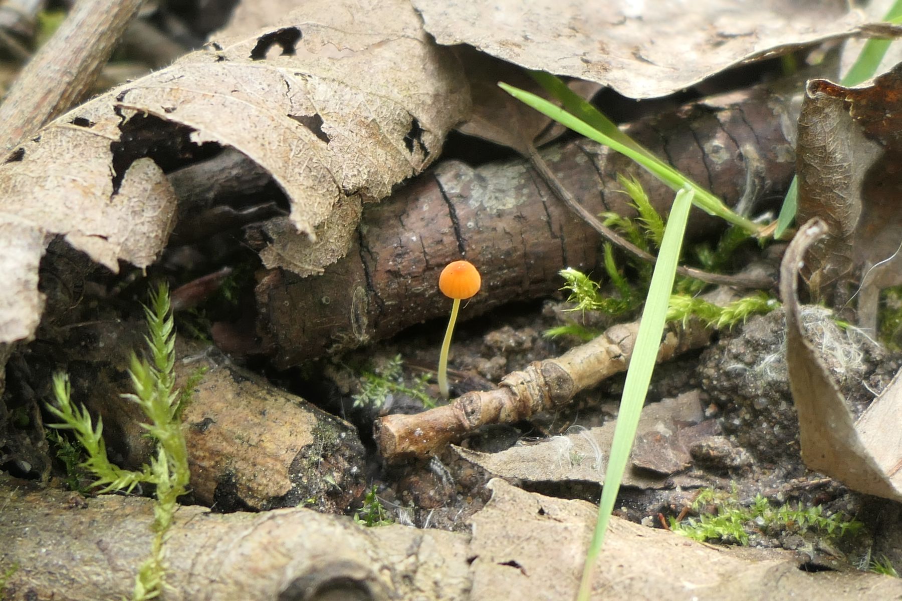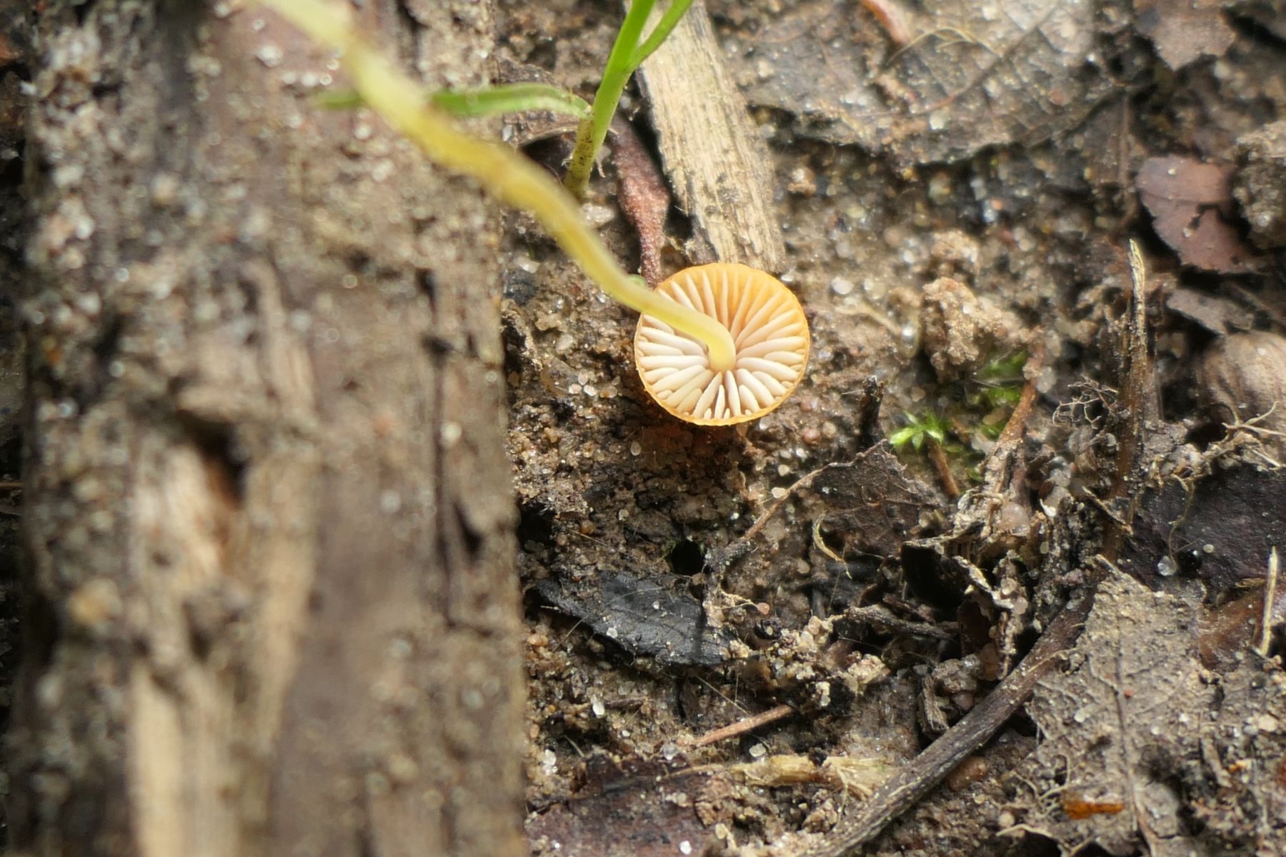 2. Eine sehr kleine Galerina Mycena (0,5 cm Hut) mit langem Stiel von 3-4 cm versehen, die ich so noch nicht gefunden habe. Das Substrat sind unbekannte Holzschnippsel.