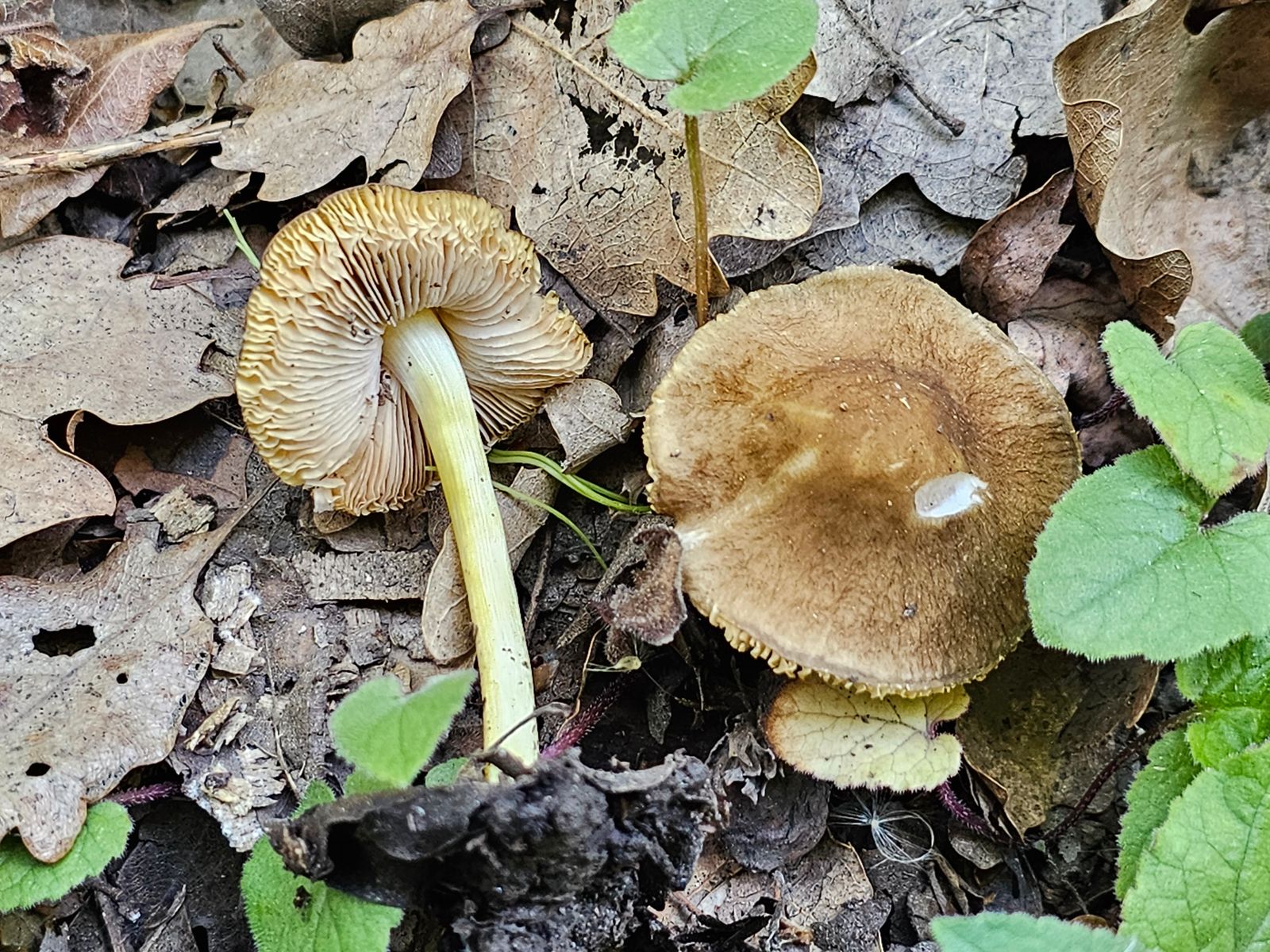 Beide Fruchtkörper haben einen auffälligen Buckel. Der Stiel ist blassgelb.