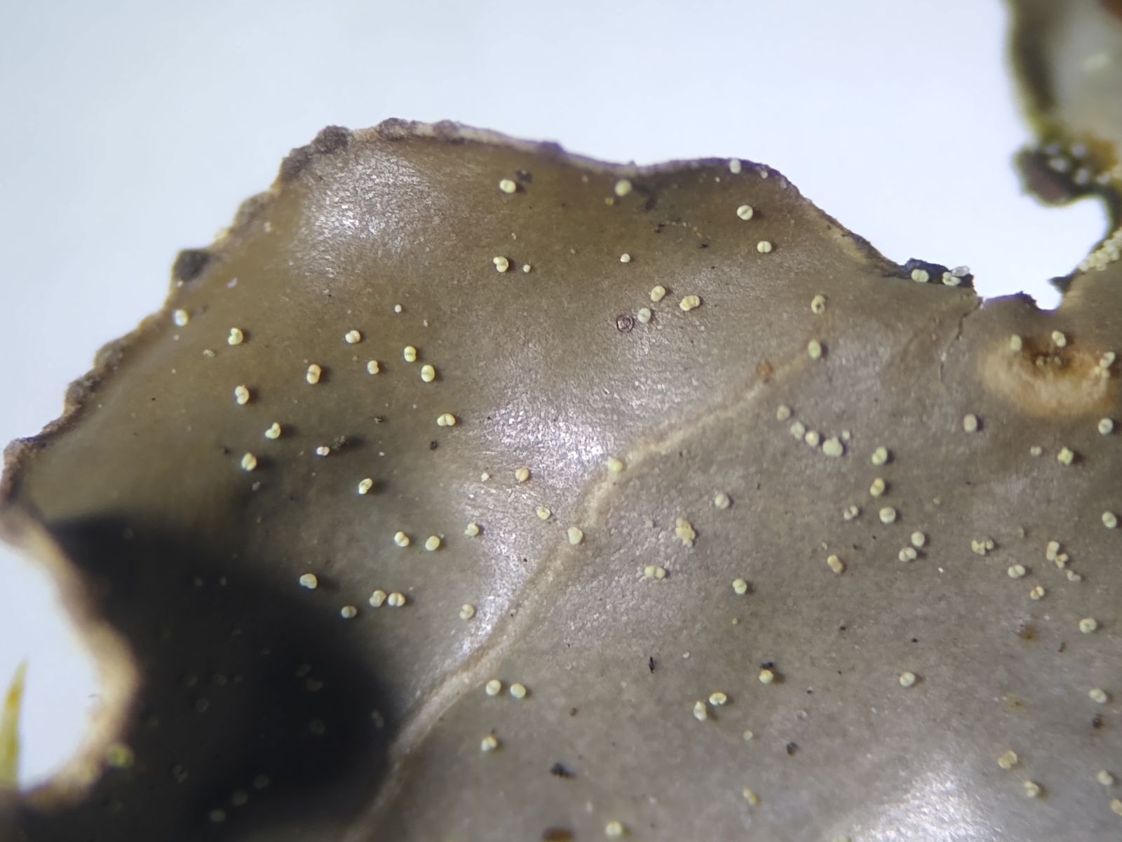 Ein größere Probe einer abgerollten, alten Peltigera zeigt eine dunklere Unterseite, die kleine, hellere Vertiefungen besitzt - offenbar sehr breite Adern! Das habe ich erst im feuchten Zustand erkannt. Die Flecken sind aber auch im trockenen Zustand erkennbar:
