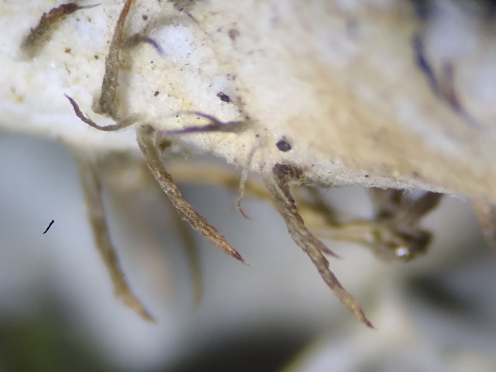 Die Unterseite ist hell mit cremefarbenen Adern und dunklen Rhizinien, am Rand auch weißliche Rhizinien, dort noch einfach. Die dunklen, langen Rhizinien fasern bei Kontakt mit dem Substrat pinselartig auf.